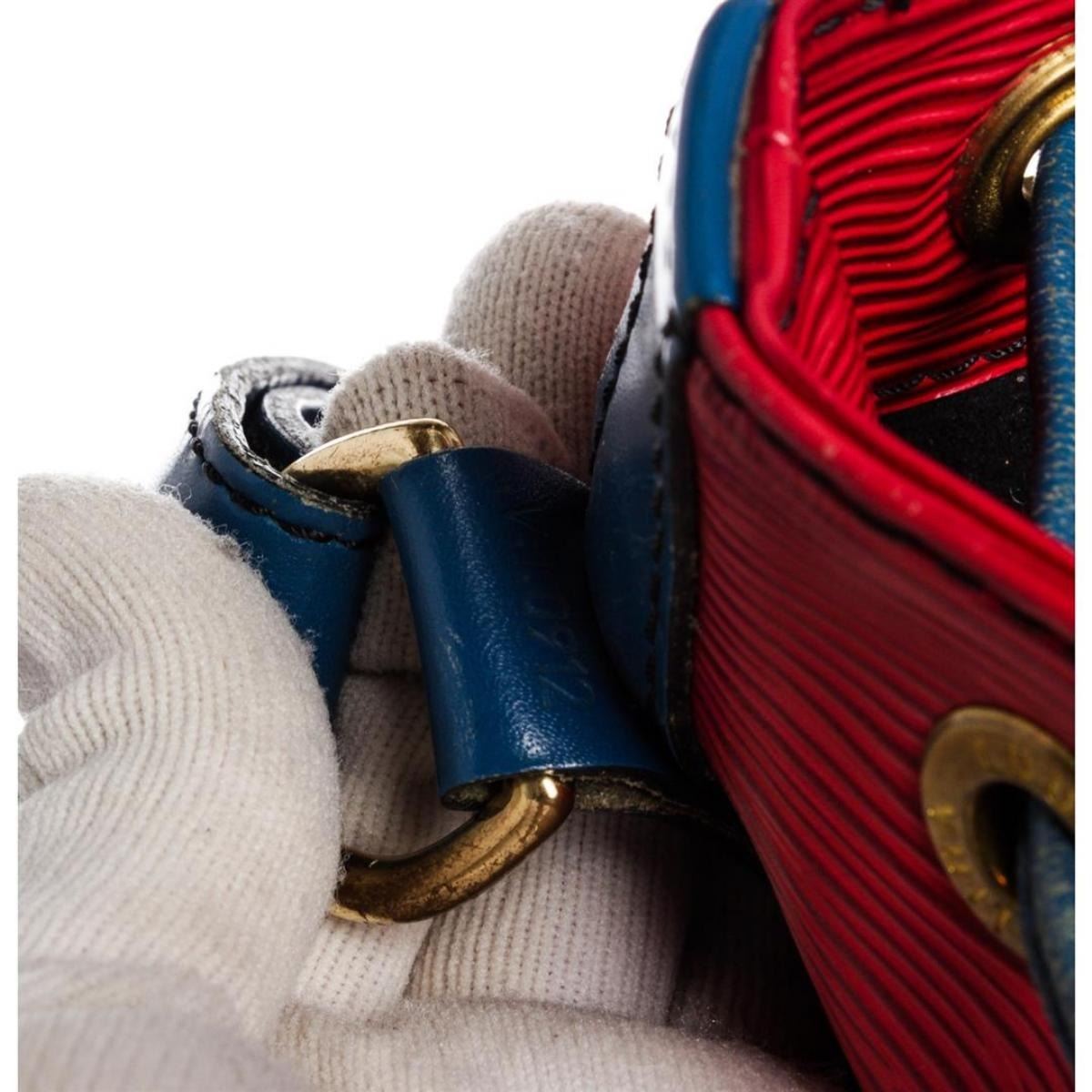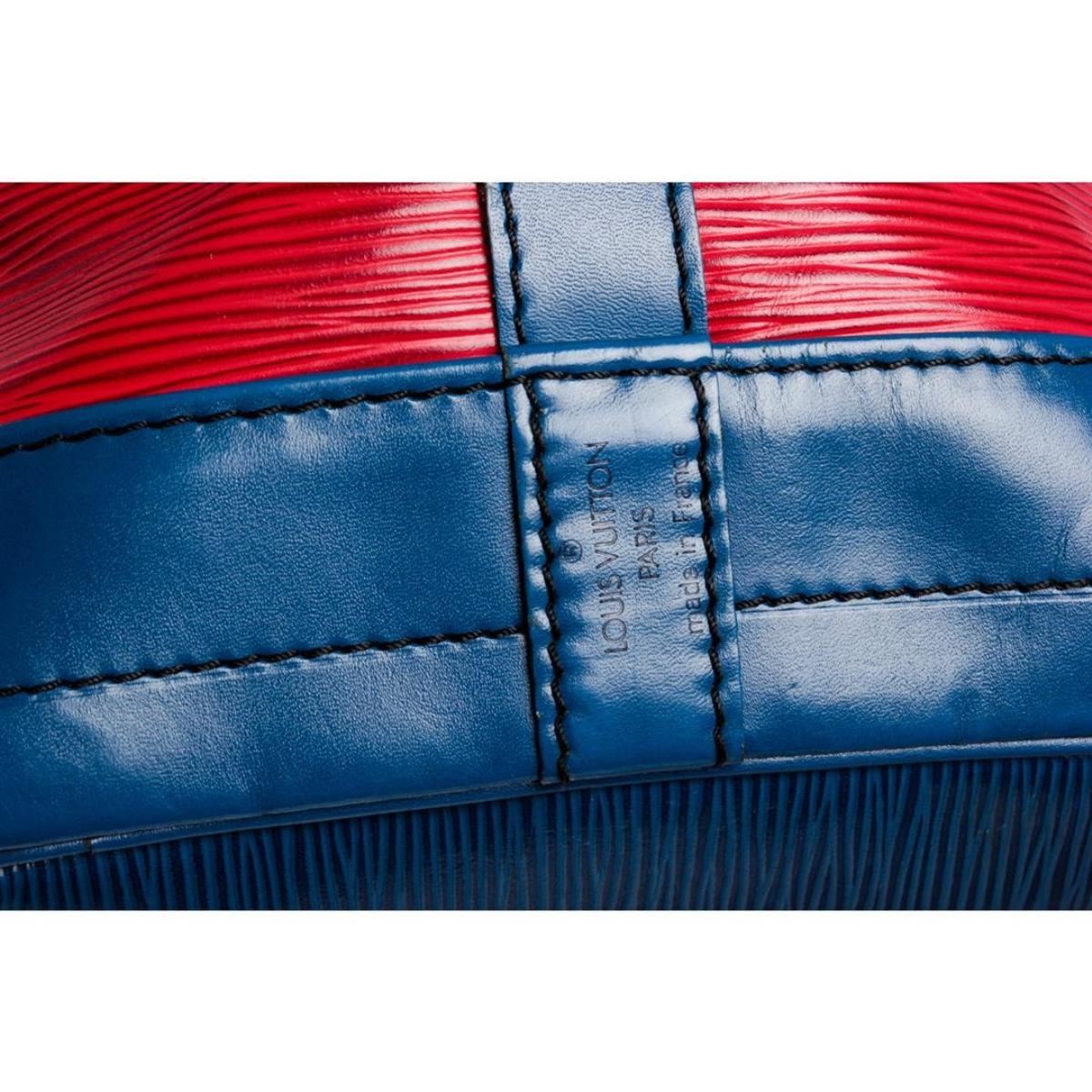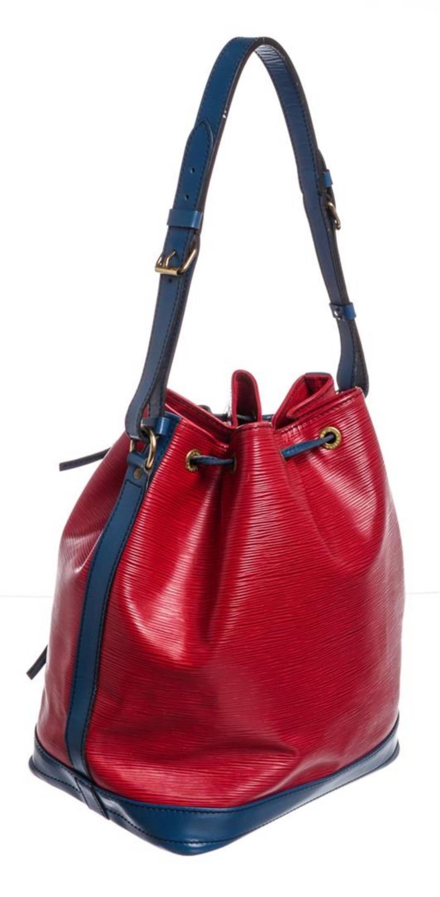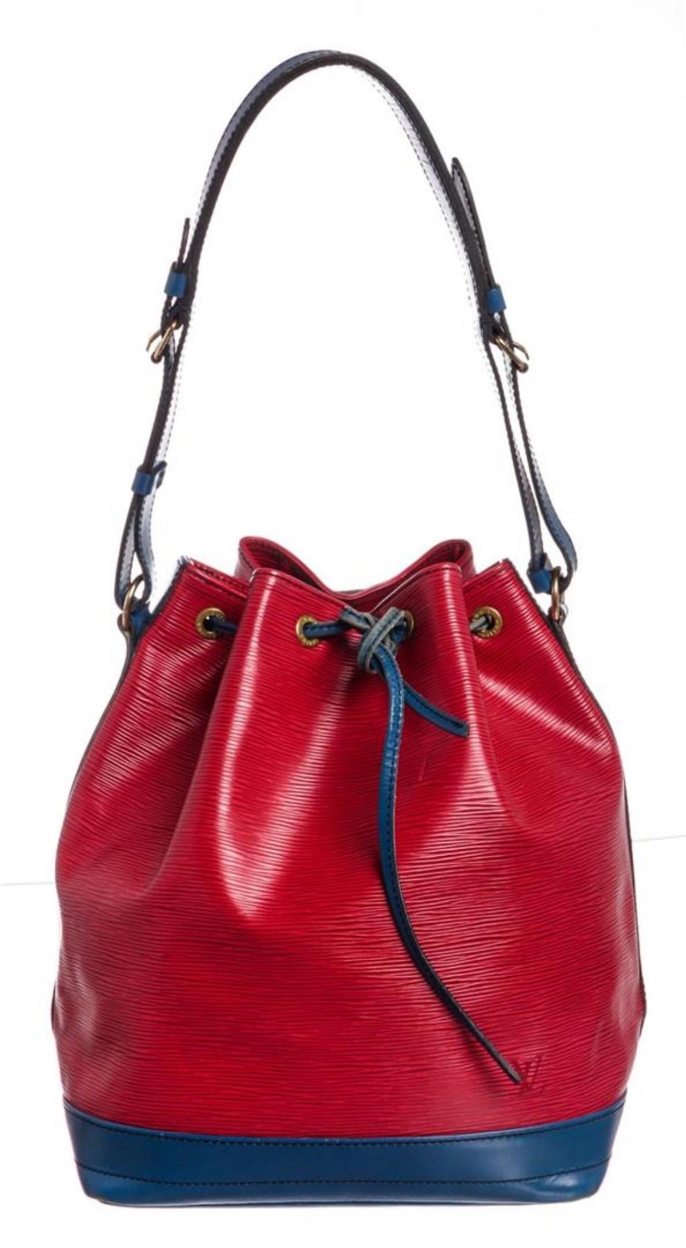 Red and Blue Epi leather Louis Vuitton Noe GM with brass hardware, single adjustable shoulder strap, tonal leather trim, embossed logo at exterior side, Alcantara lining and drawstring closure at top. Authentic.