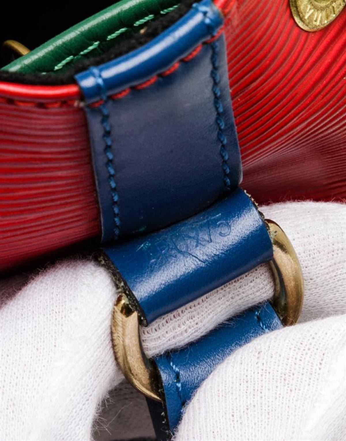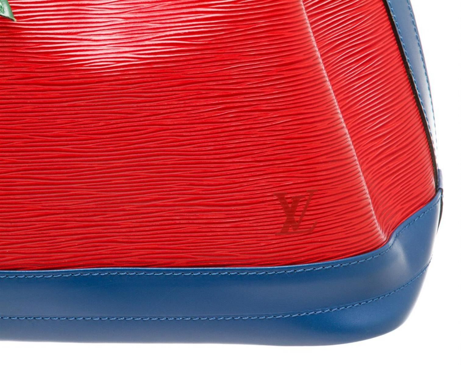 One Louis Vuitton Red Blue Epi Leather Noe GM Drawstring Shoulder Bag. Red, Blue and Green Epi leather Louis Vuitton Noe GM with brass hardware, single adjustable shoulder strap, tonal leather trim, embossed logo at exterior side, Alcantara lining and drawstring closure at top.