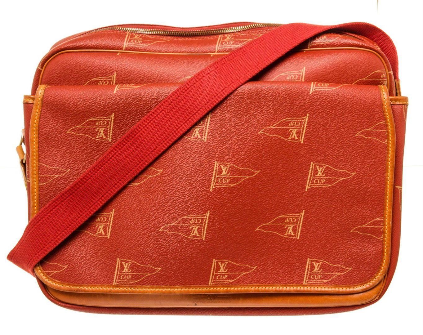 Louis Vuitton Red Canvas Cup Bosphore Calvi Messenger Bag with material canvas, gold-tone hardware, trim tan vachetta leather, interior slip pockets and zipper closure.