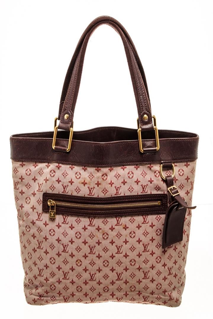 One Louis Vuitton Red Canvas Lucille GM Tote Bag. Item is sold AS-IS. All available information is listed in the description and shown in the photo. Louis Vuitton red canvas Lucille GM tote bag features a monogram canvas exterior, beige fabric lining, burgundy leather top handles, trims, and luggage tag; gold-tone hardware, open top, one exterior zip pocket, and one interior zip pocket. There are stains on the canvas and on the lining as shown in pictures. Height: 11.81" Width: 4.33" Depth: 12.2", Shoulder Drop: / 29.99 x 10.99 x 30.98 Cm