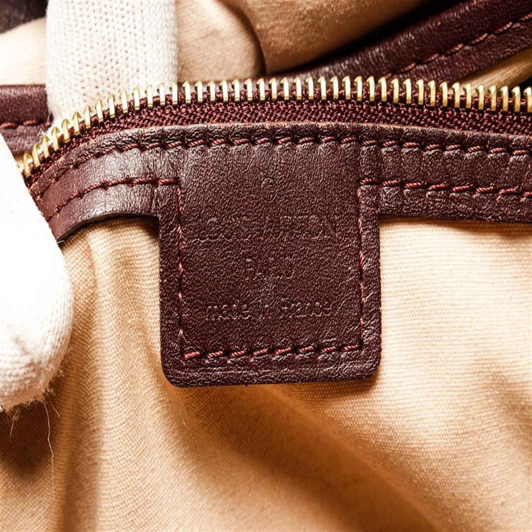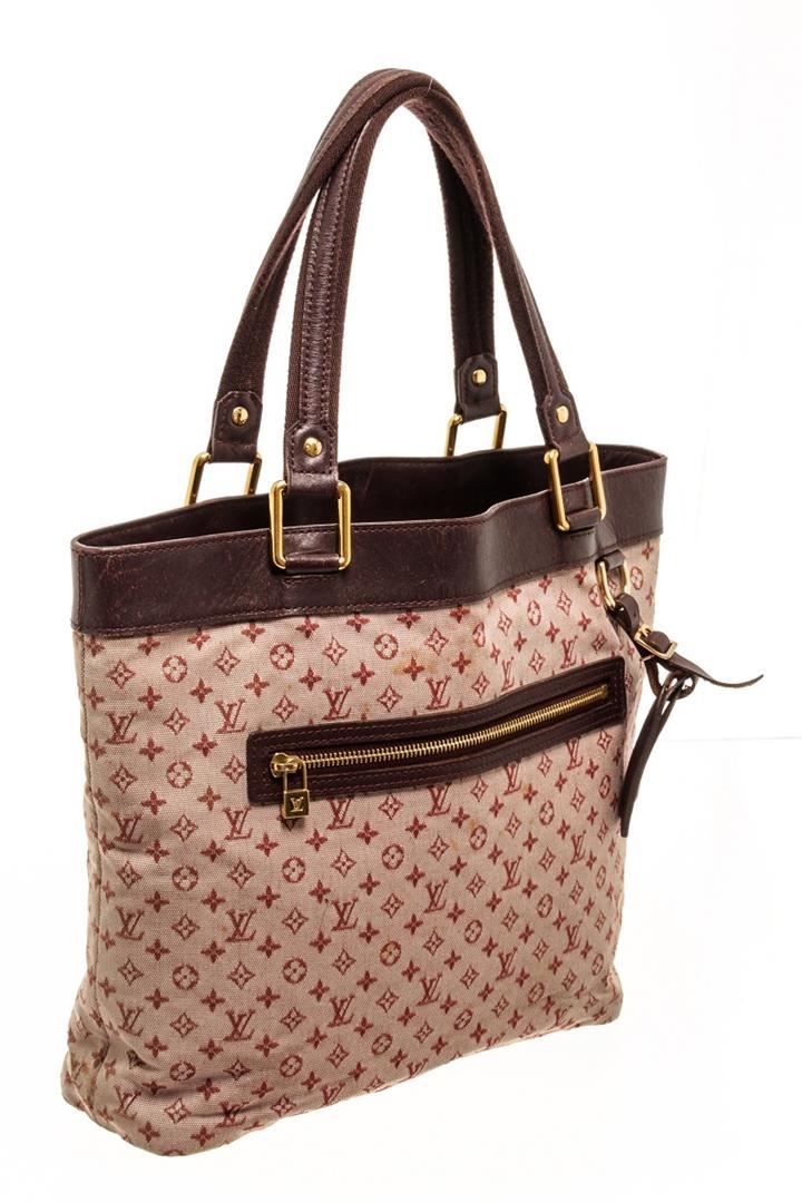 One Louis Vuitton Red Canvas Lucille GM Tote Bag. Item is sold AS-IS. All available information is listed in the description and shown in the photo. Louis Vuitton red canvas Lucille GM tote bag features a monogram canvas exterior, beige fabric lining, burgundy leather top handles, trims, and luggage tag; gold-tone hardware, open top, one exterior zip pocket, and one interior zip pocket. There are stains on the canvas and on the lining as shown in pictures. Height: 11.81" Width: 4.33" Depth: 12.2", Shoulder Drop: / 29.99 x 10.99 x 30.98 Cm