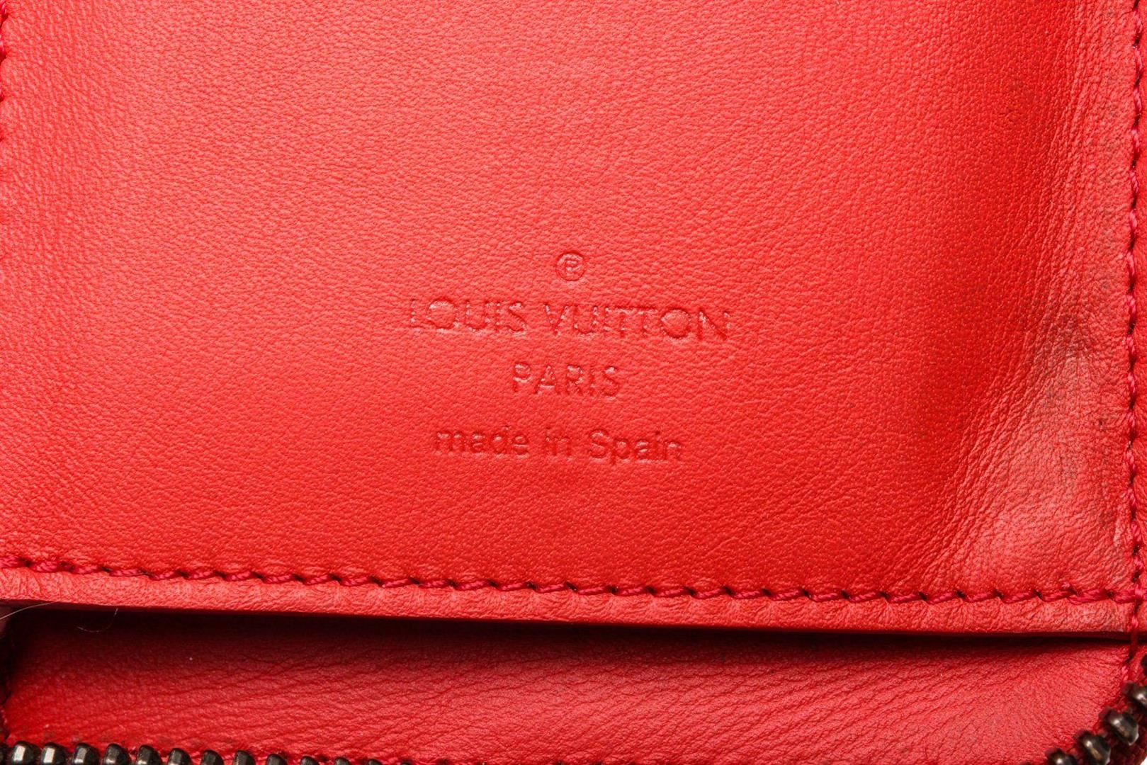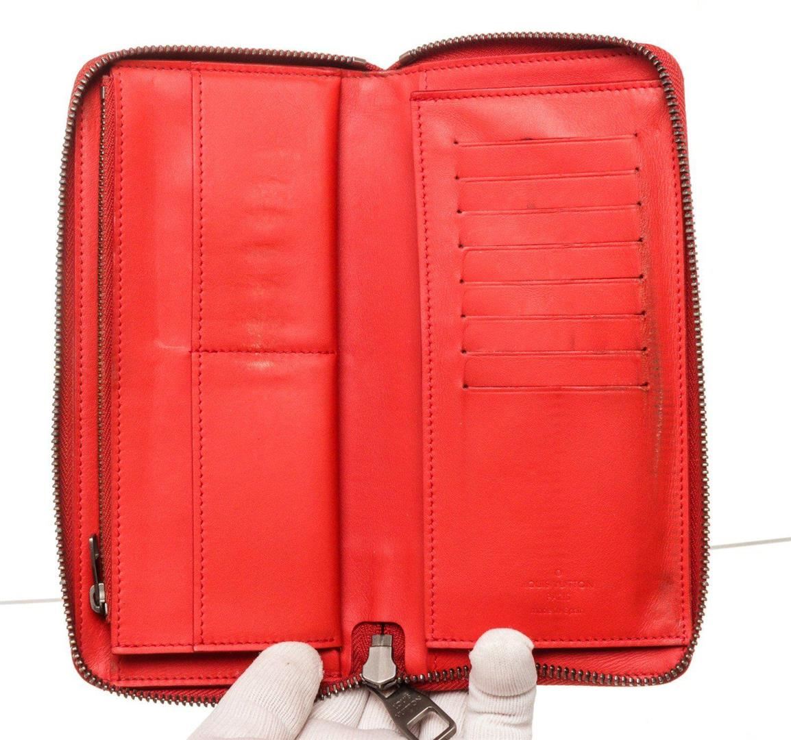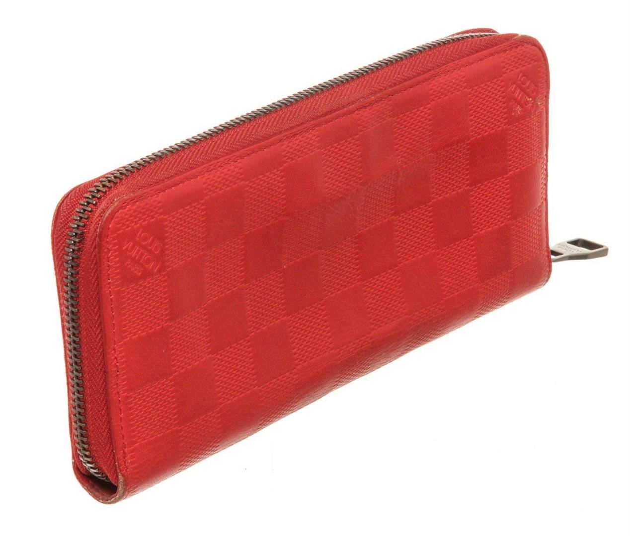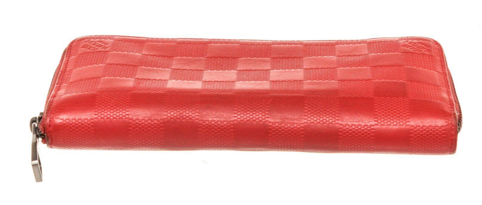 Louis Vuitton Red Damier Canvas Vertical Zippy Wallet with material damier canvas, gold-tone hardware, trim tan vachetta leather, interior card holder pockets and zipper closure.