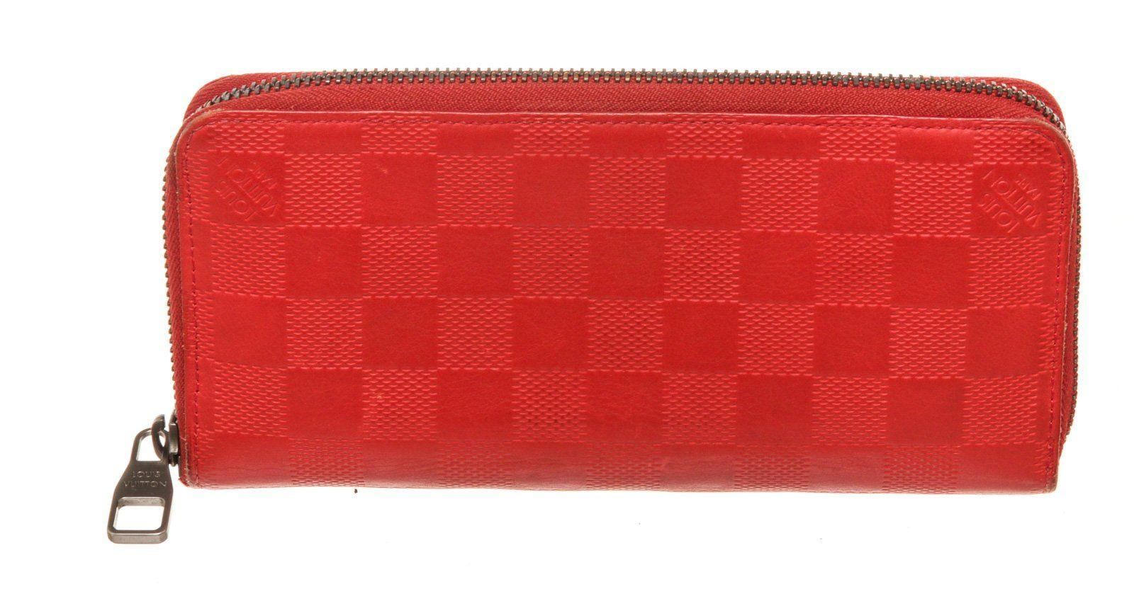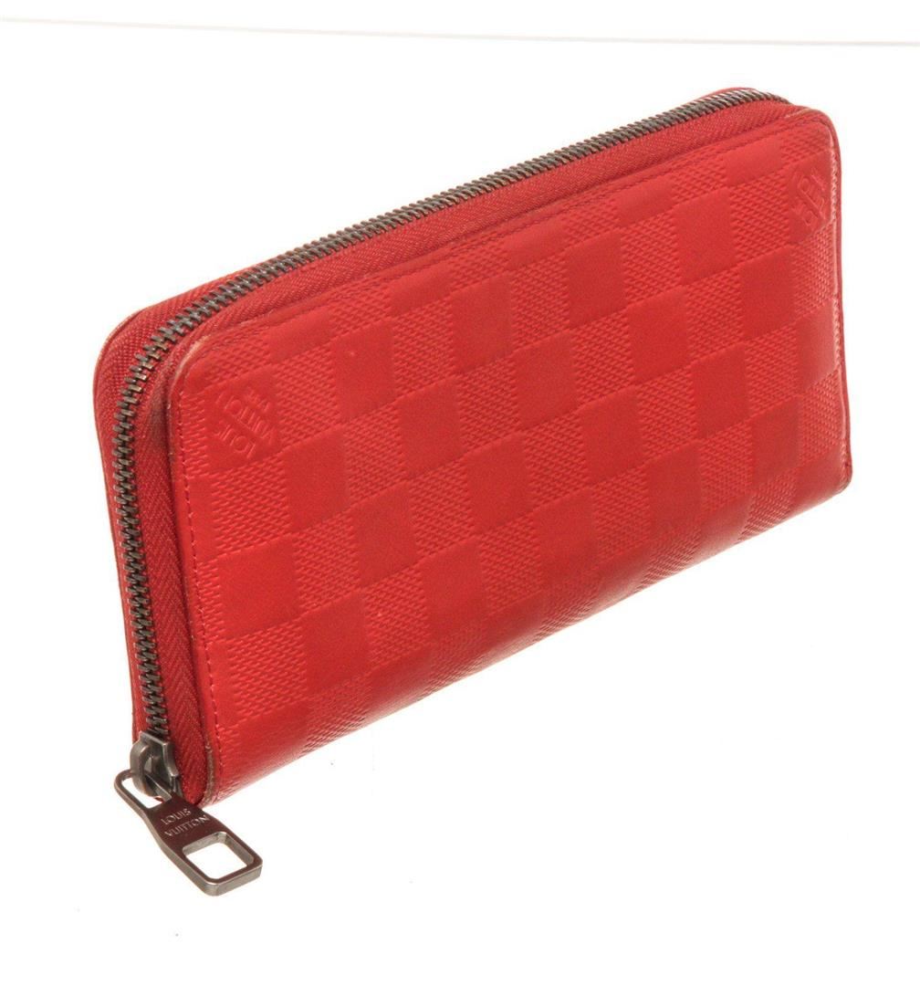 Louis Vuitton Red Damier Canvas Vertical Zippy Wallet with material damier canvas, gold-tone hardware, trim tan vachetta leather, interior card holder pockets and zipper closure.