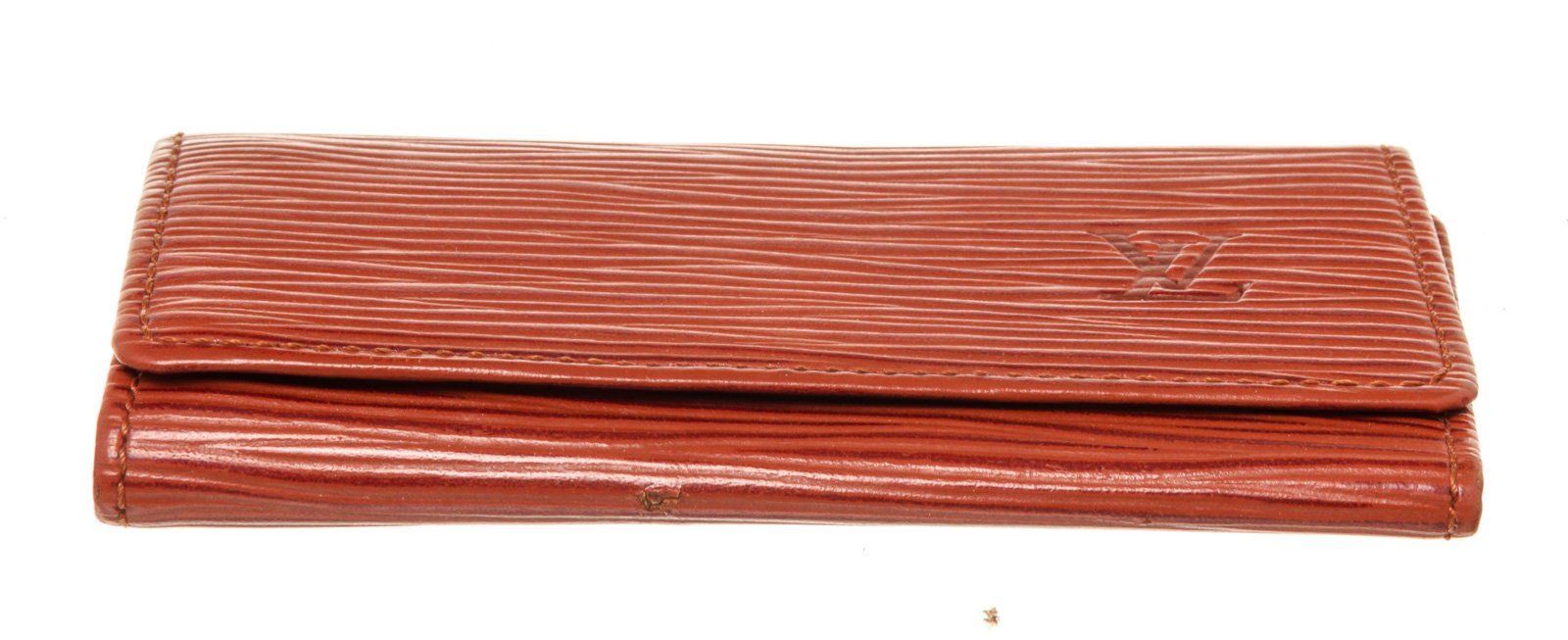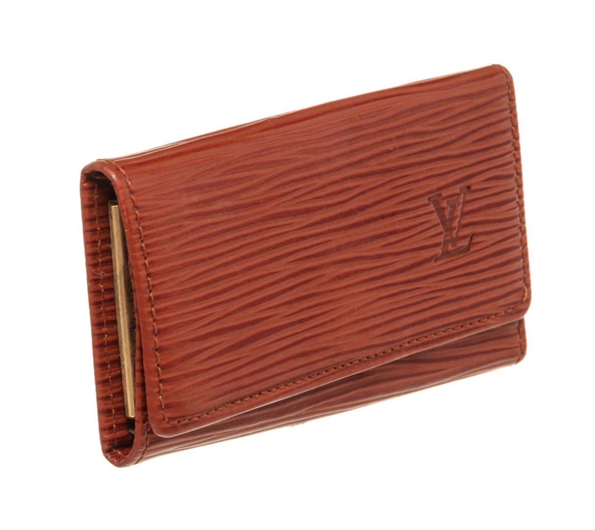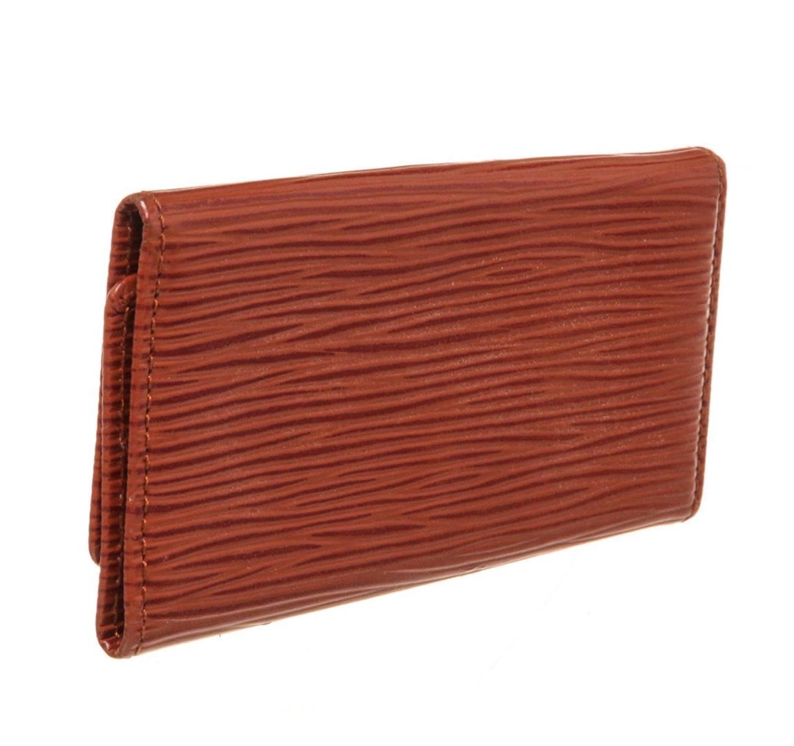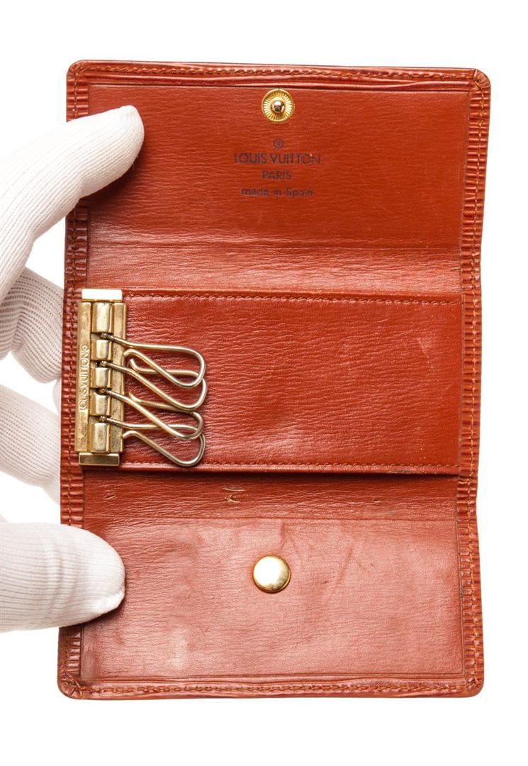 Louis Vuitton Red Epi Leather 4 Key Holder Wallet with epi leather, gold-tone hardware, interior pen holder pockets, trim tan vachetta leather and snap closure.