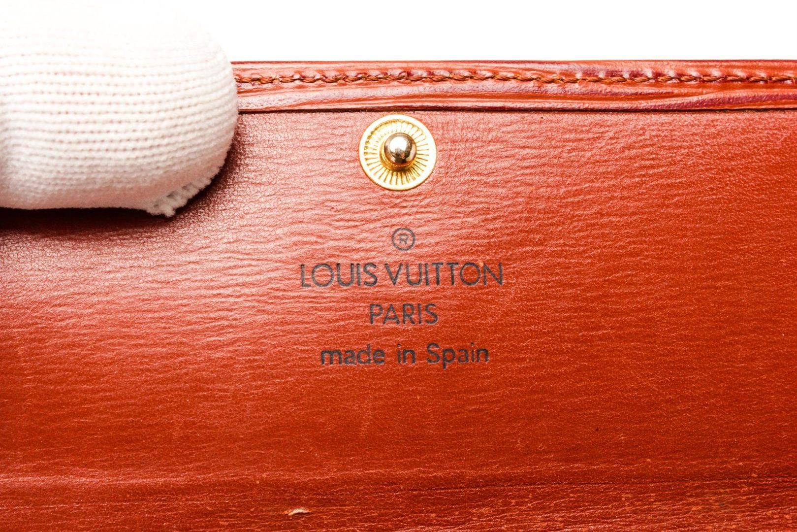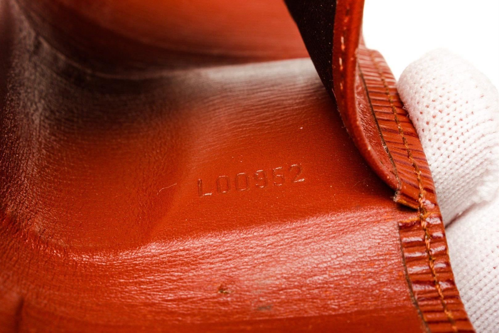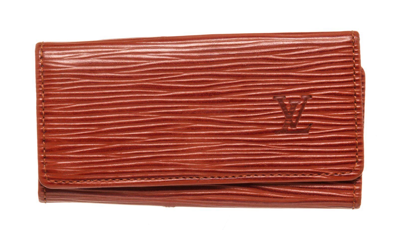 Louis Vuitton Red Epi Leather 4 Key Holder Wallet with epi leather, gold-tone hardware, interior pen holder pockets, trim tan vachetta leather and snap closure.
