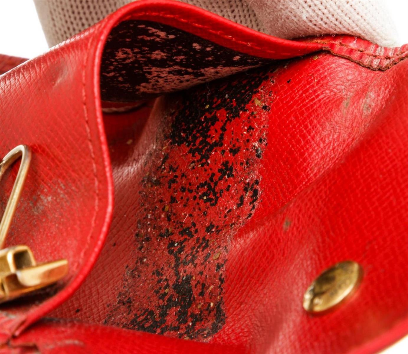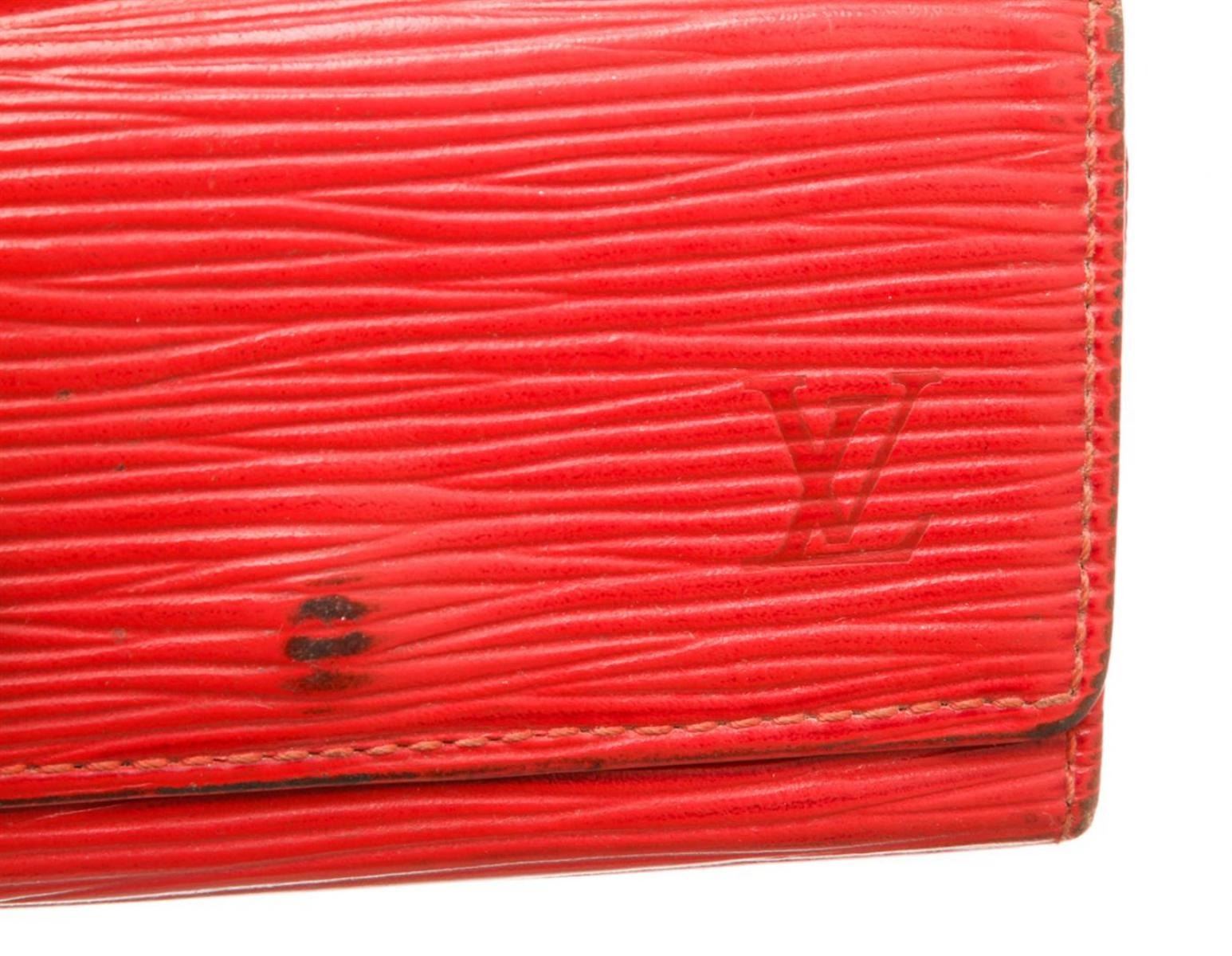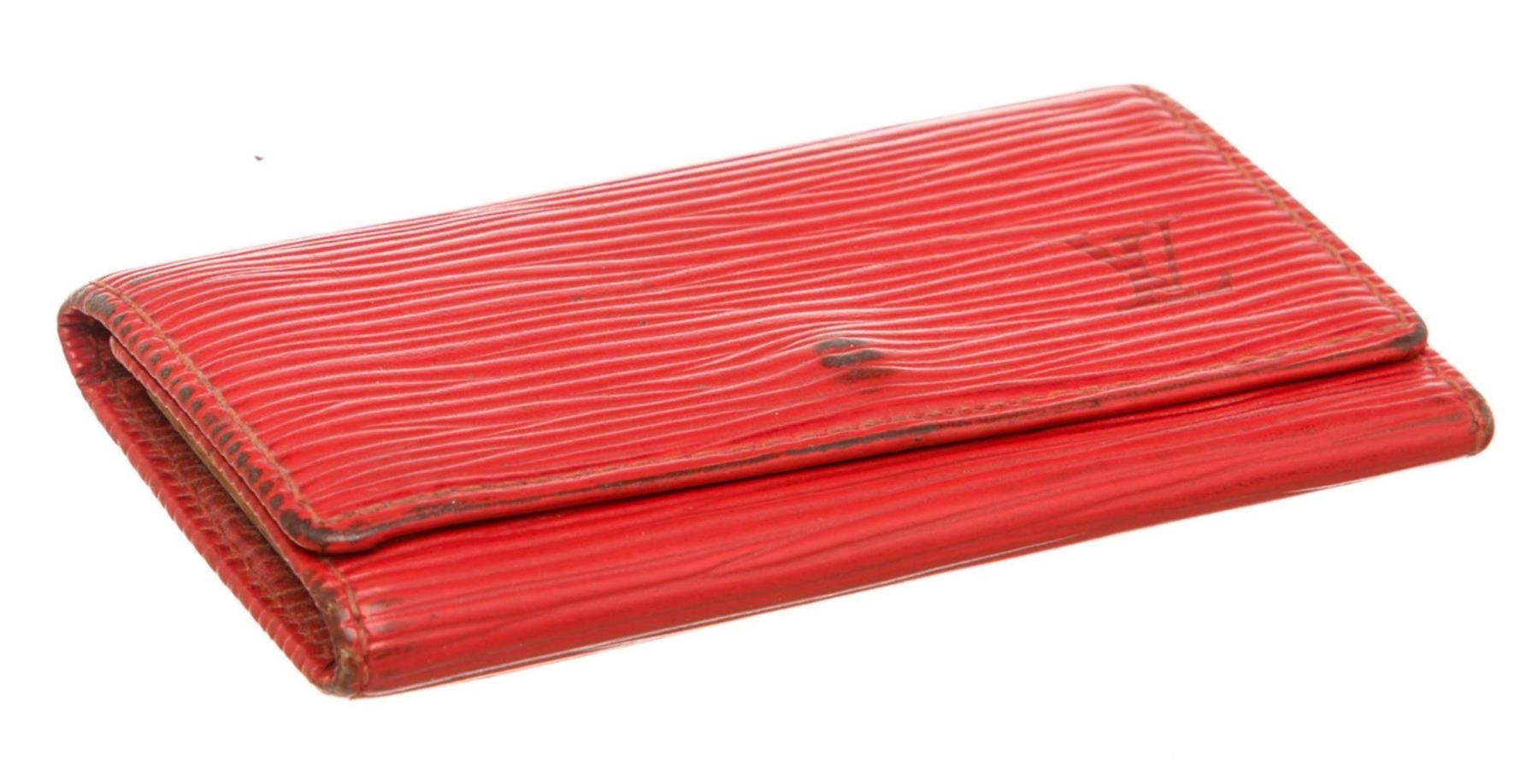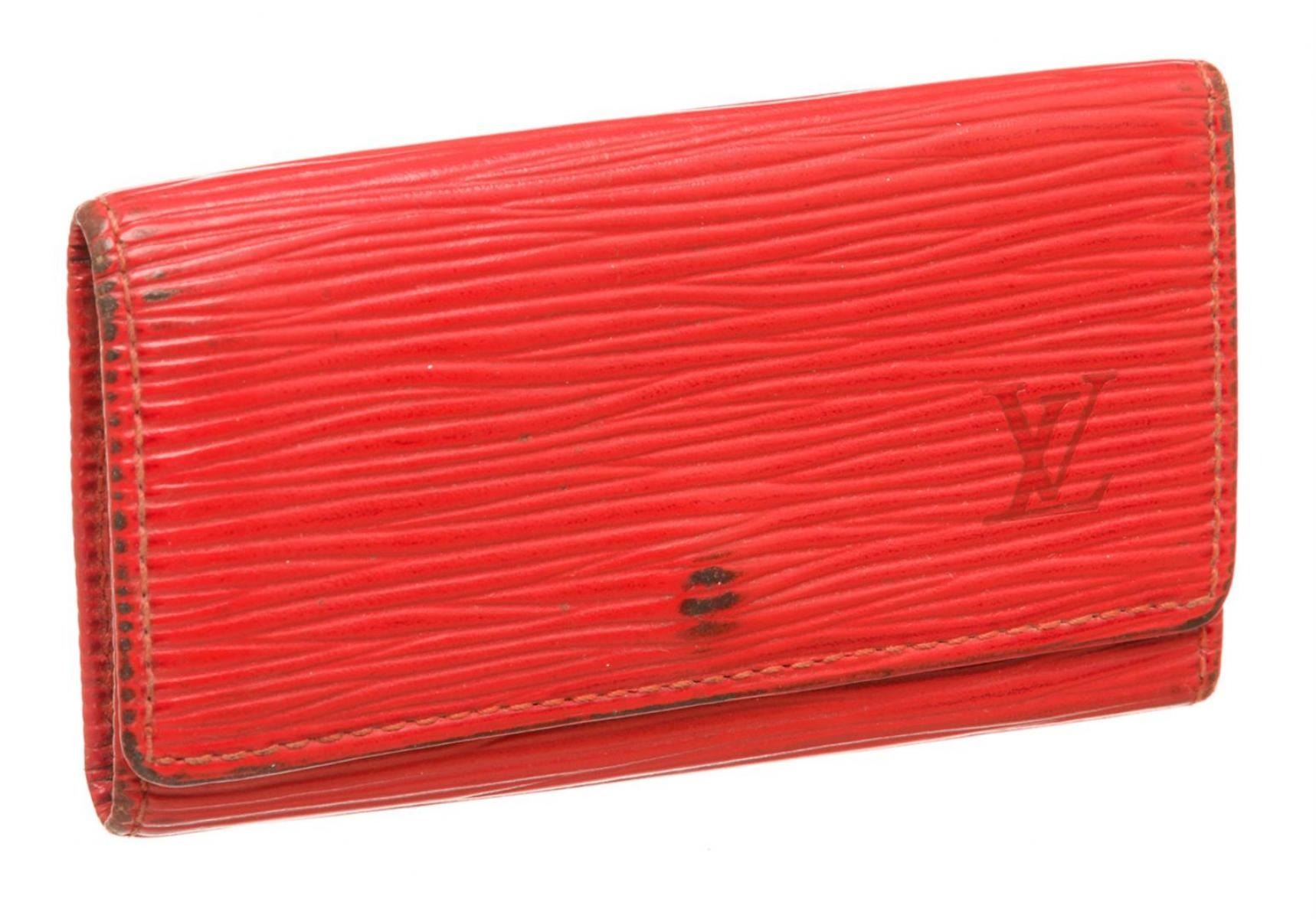 One Louis Vuitton Red Epi Leather 4 Key Holder. Red Epi leather Louis Vuitton key holder with gold-tone hardware, debossed logo at front, tonal leather interior, four key clasps and snap closure at front flap. MKX