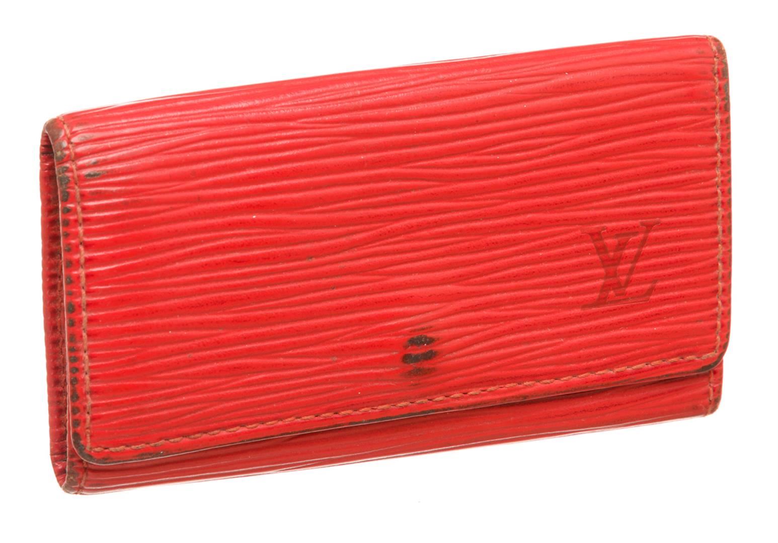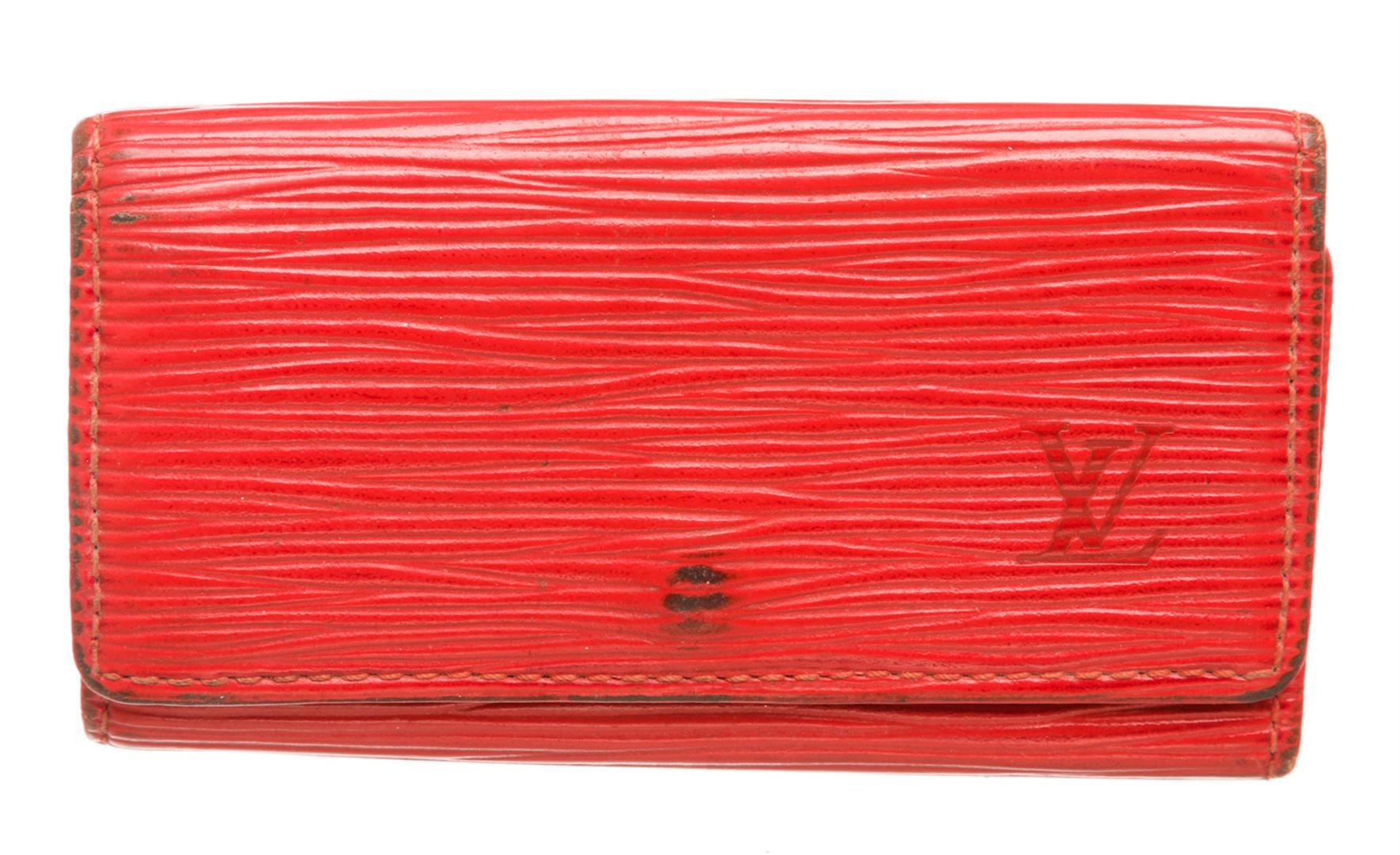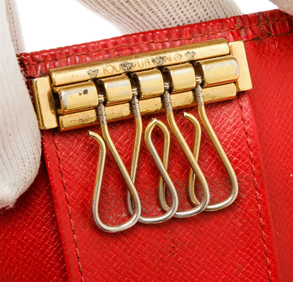 Red Epi leather Louis Vuitton 4 key holder with gold-tone hardware, debossed logo at front, tonal leather interior, four key clasps and snap closure at front flap.