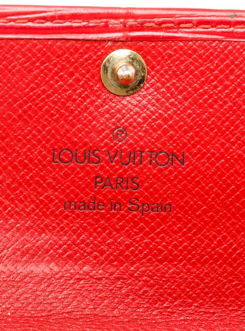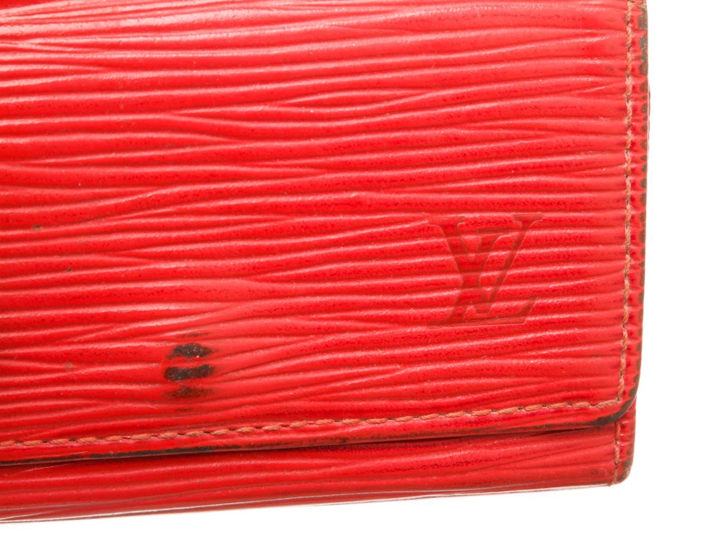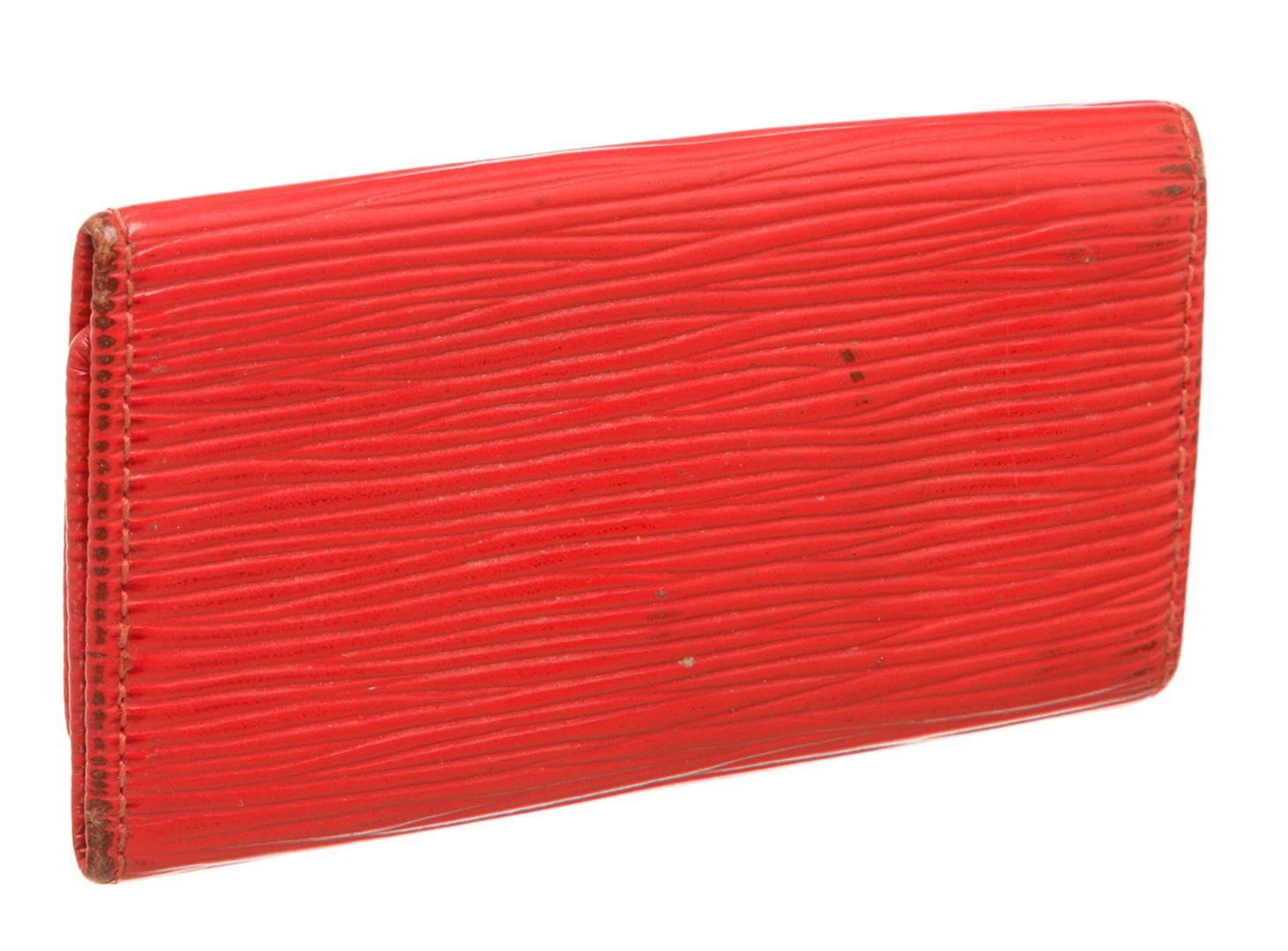 Red Epi leather Louis Vuitton 4 key holder with gold-tone hardware, debossed logo at front, tonal leather interior, four key clasps and snap closure at front flap.