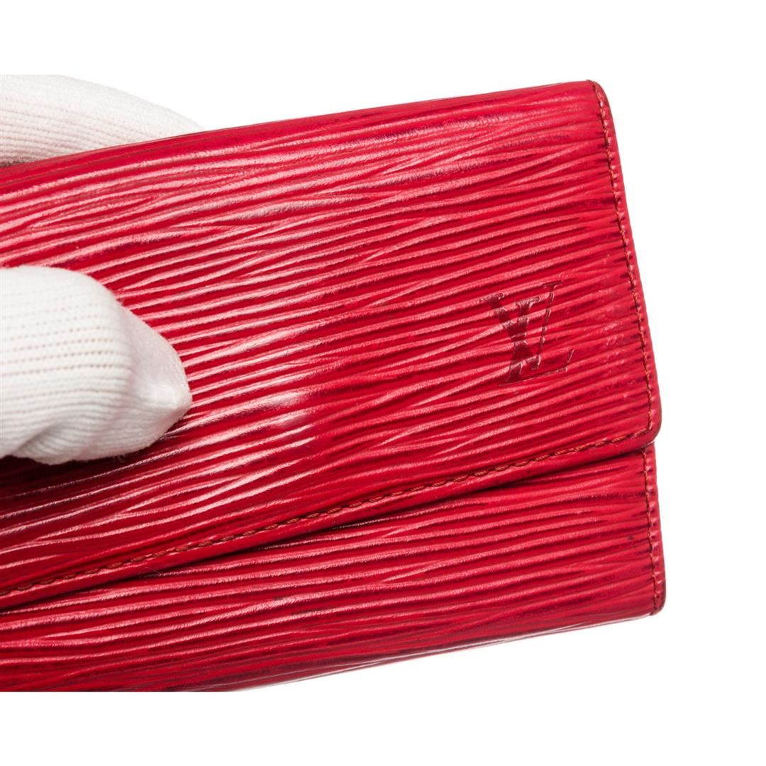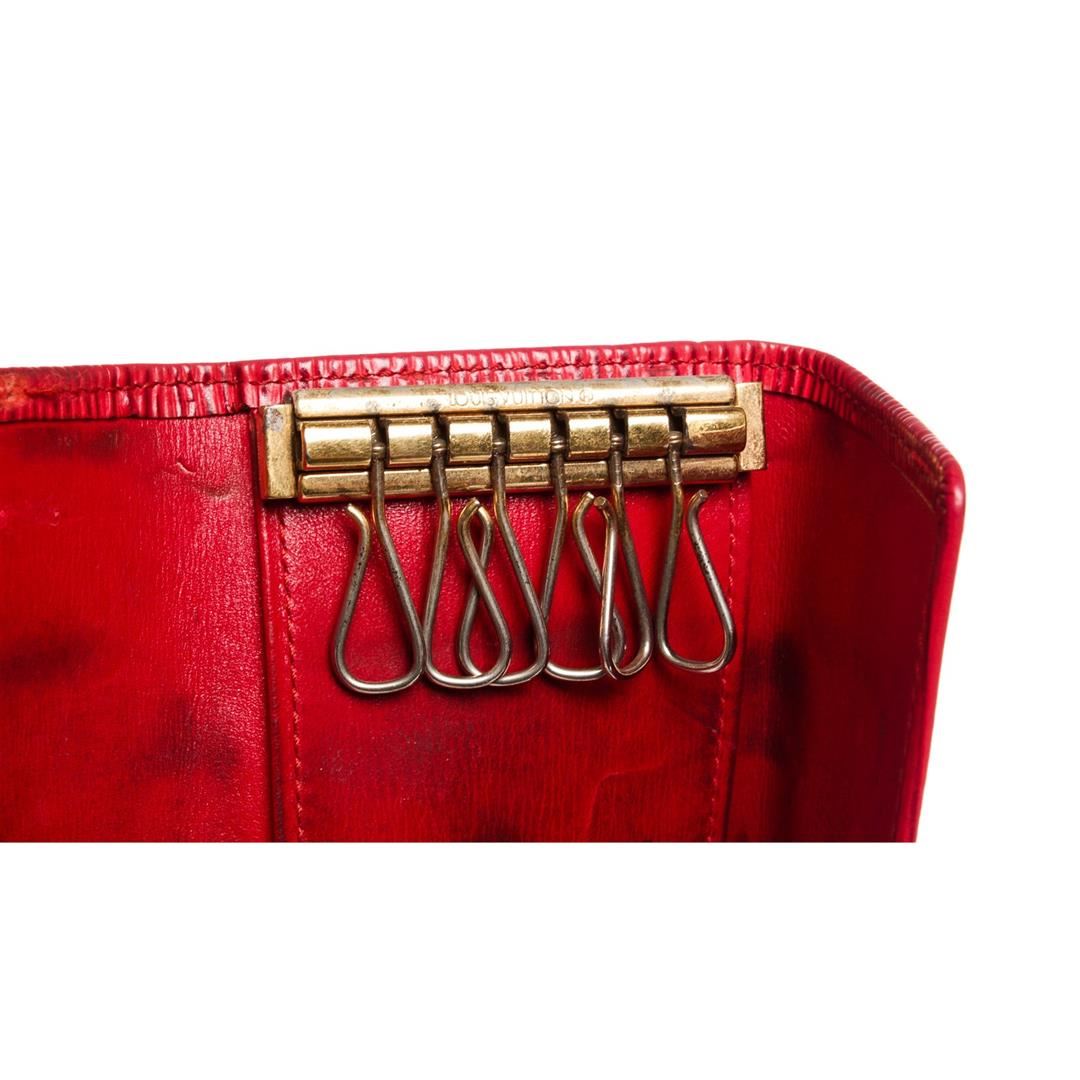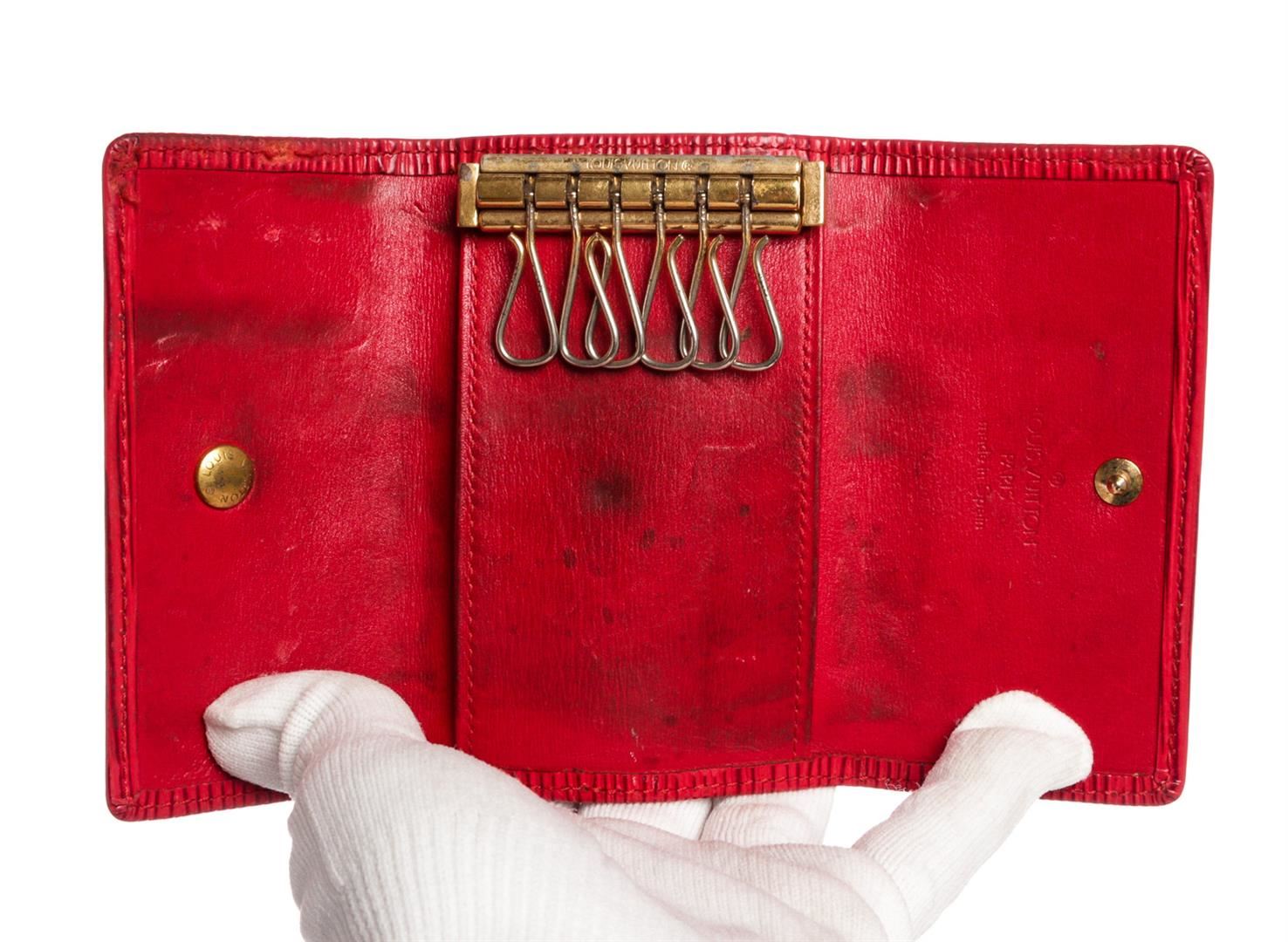 Red Epi leather Louis Vuitton key holder with gold-tone hardware, debossed logo at front, tonal leather interior, six key clasps and snap closure at front flap. Authentic.