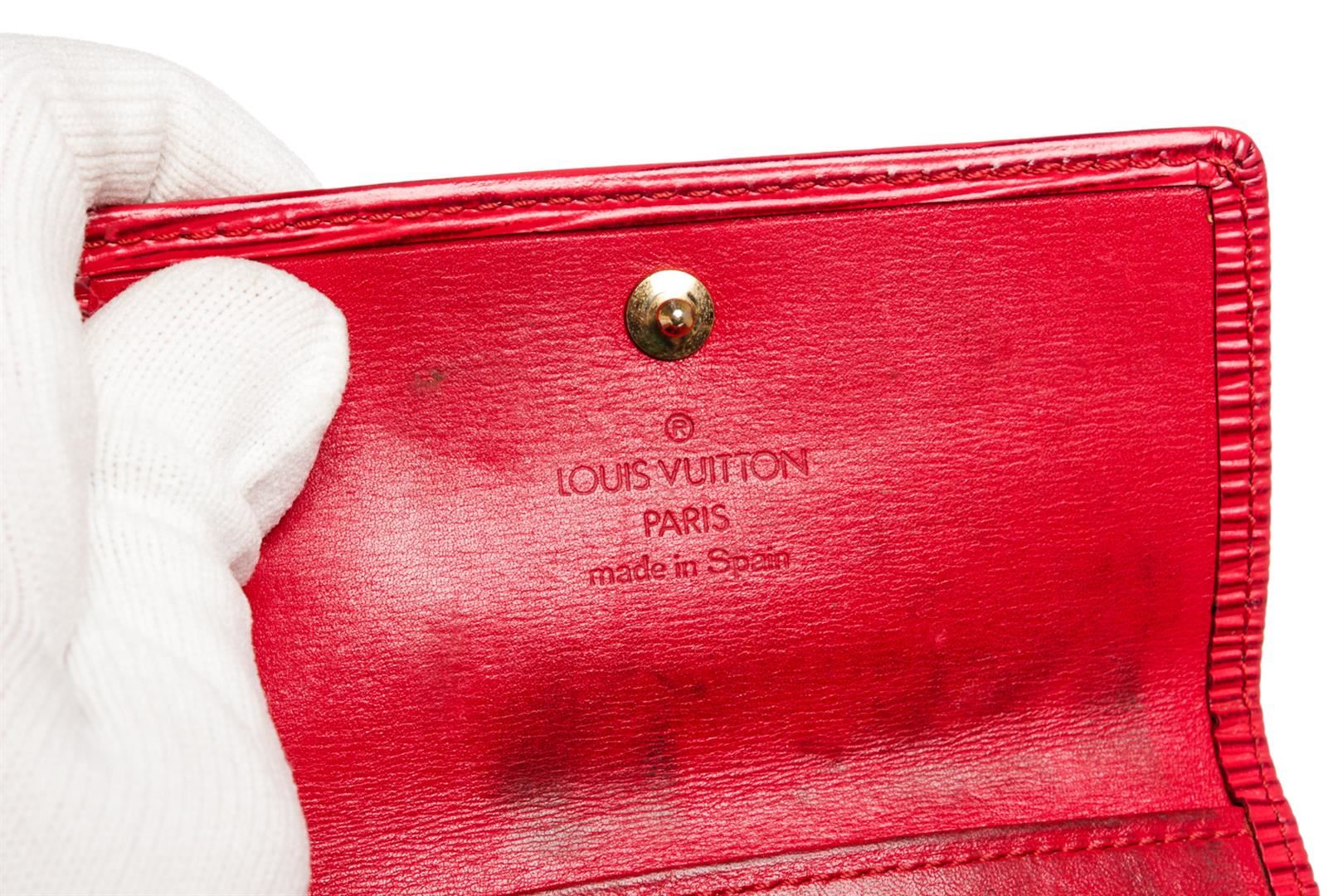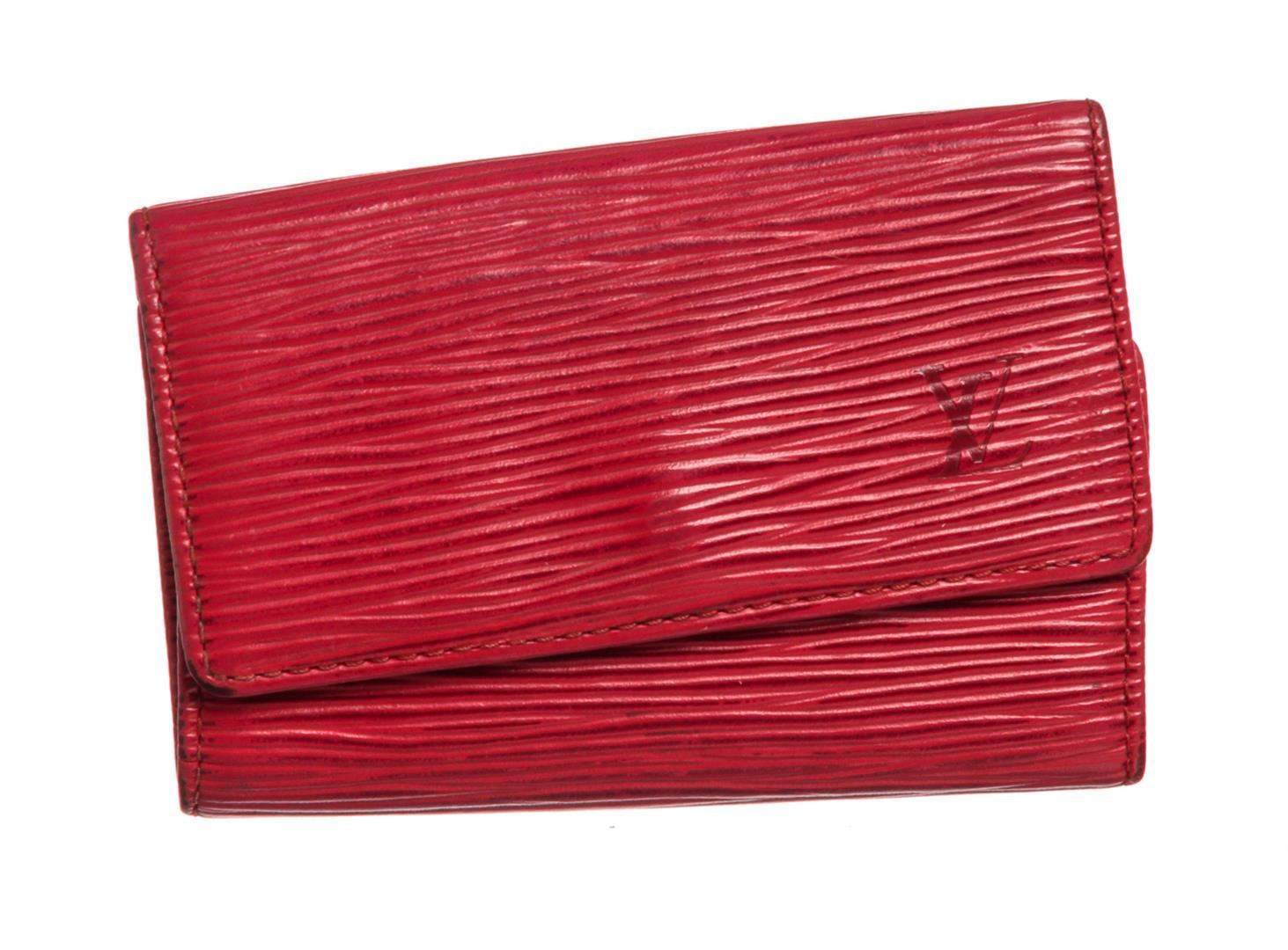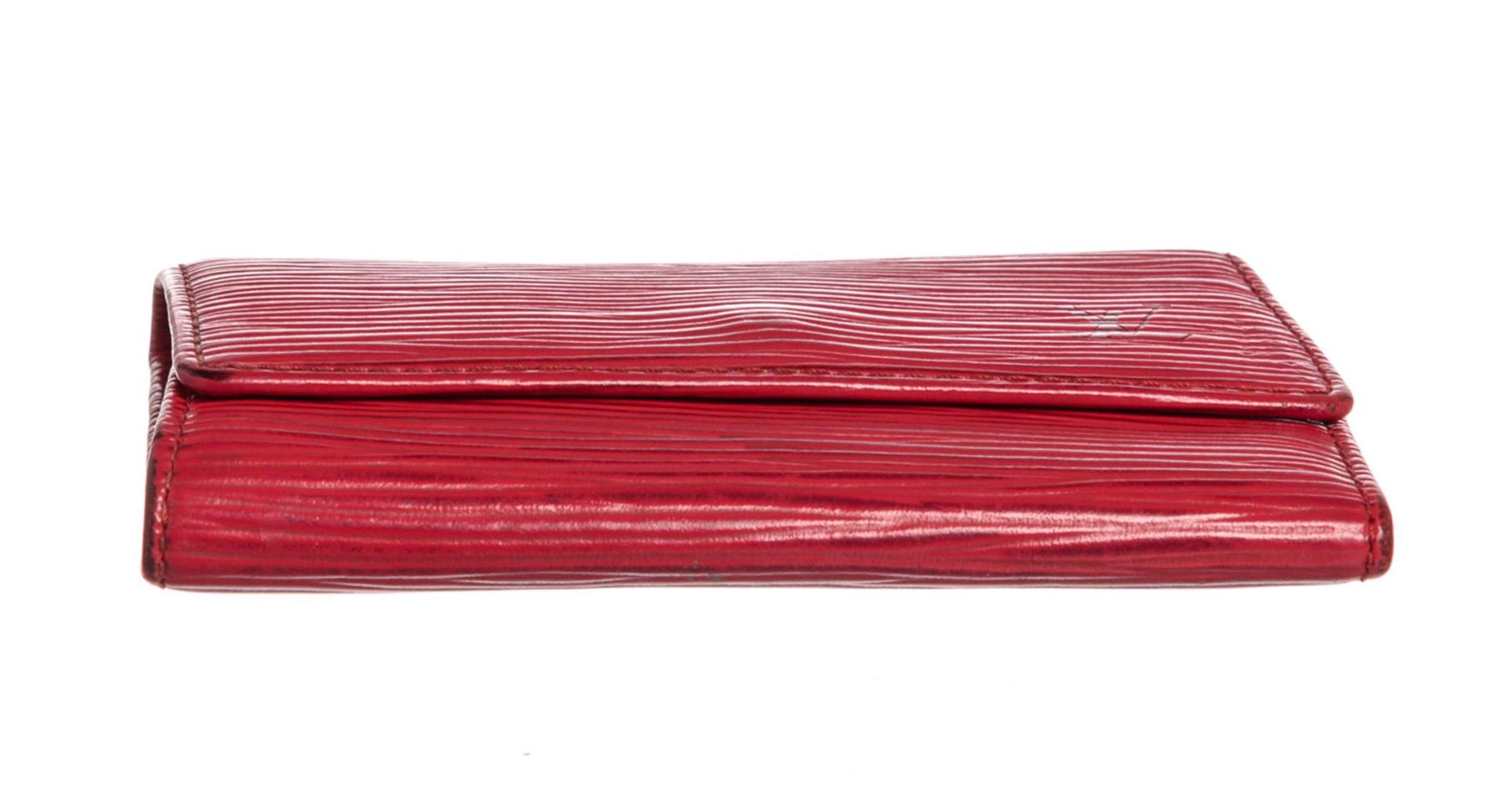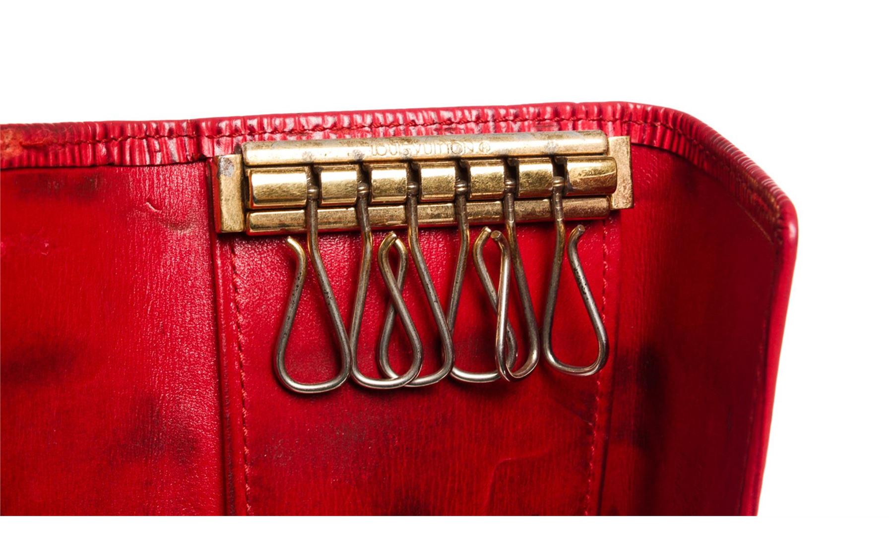One Louis Vuitton Red Epi Leather 6 Key Holder. Red Epi leather Louis Vuitton key holder with gold-tone hardware, debossed logo at front, tonal leather interior, six key clasps and snap closure at front flap.