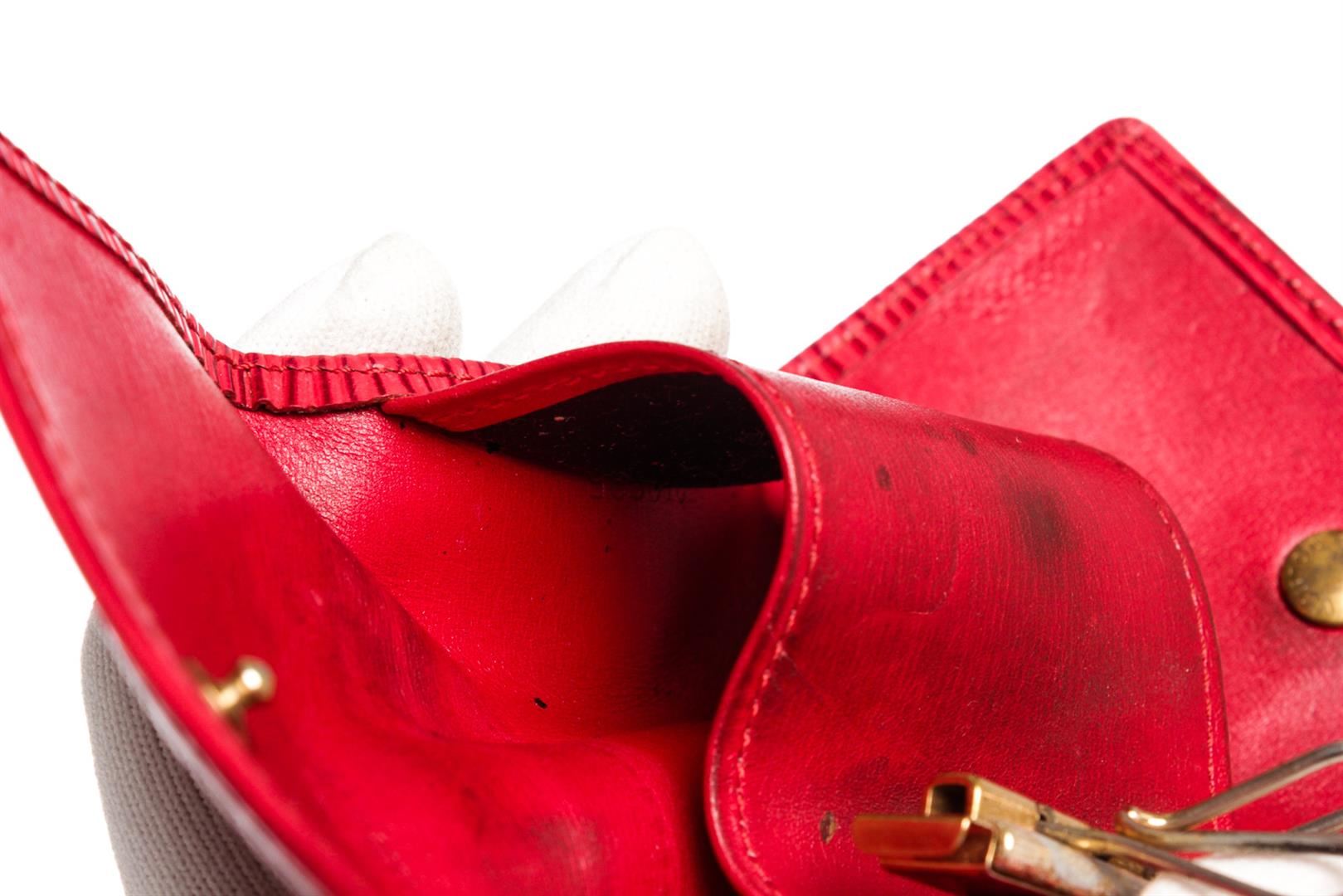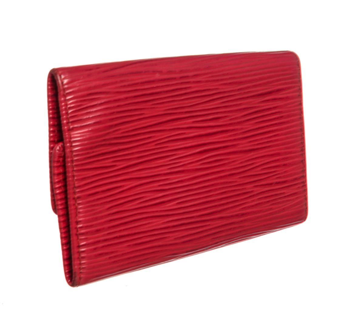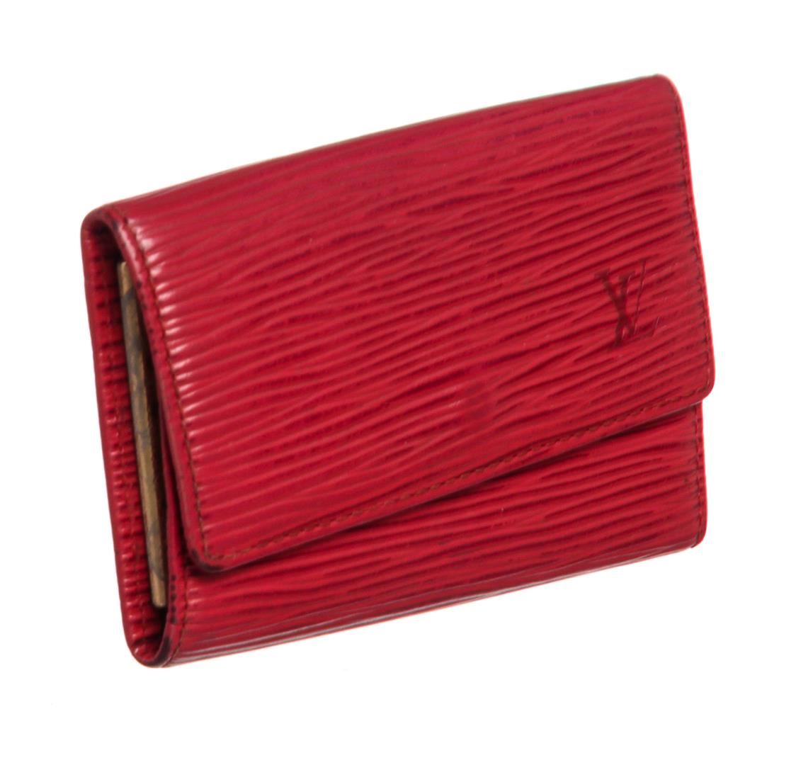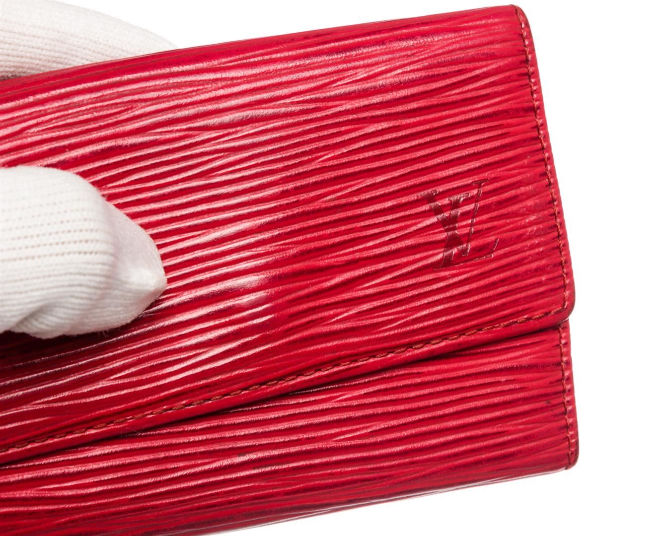 One Louis Vuitton Red Epi Leather 6 Key Holder. Red Epi leather Louis Vuitton key holder with gold-tone hardware, debossed logo at front, tonal leather interior, six key clasps and snap closure at front flap.