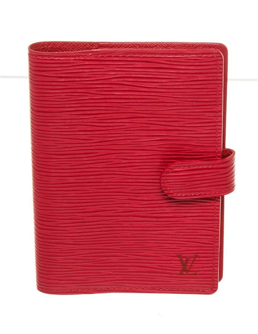 Louis Vuitton Red Epi Leather Agenda PM Wallet with material epi leather, silver-tone hardware, trim tan vachetta leather,leather lining, dual slip pockets, three card slots and snap closure at front.