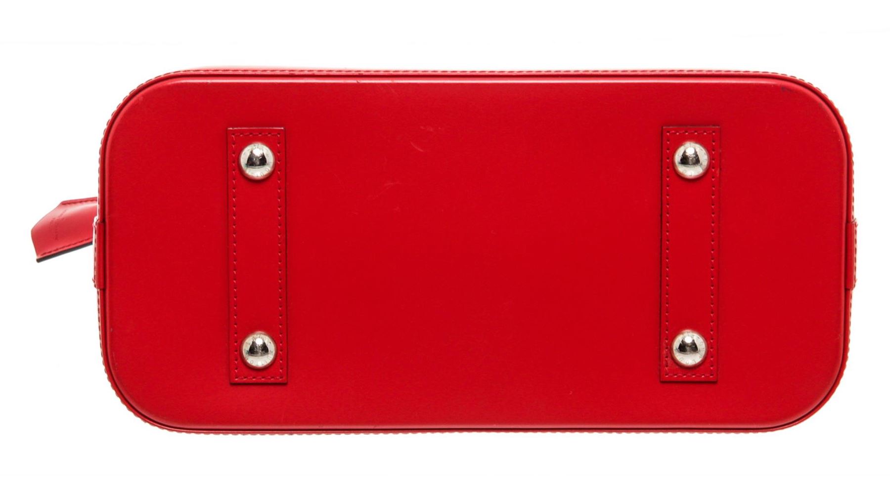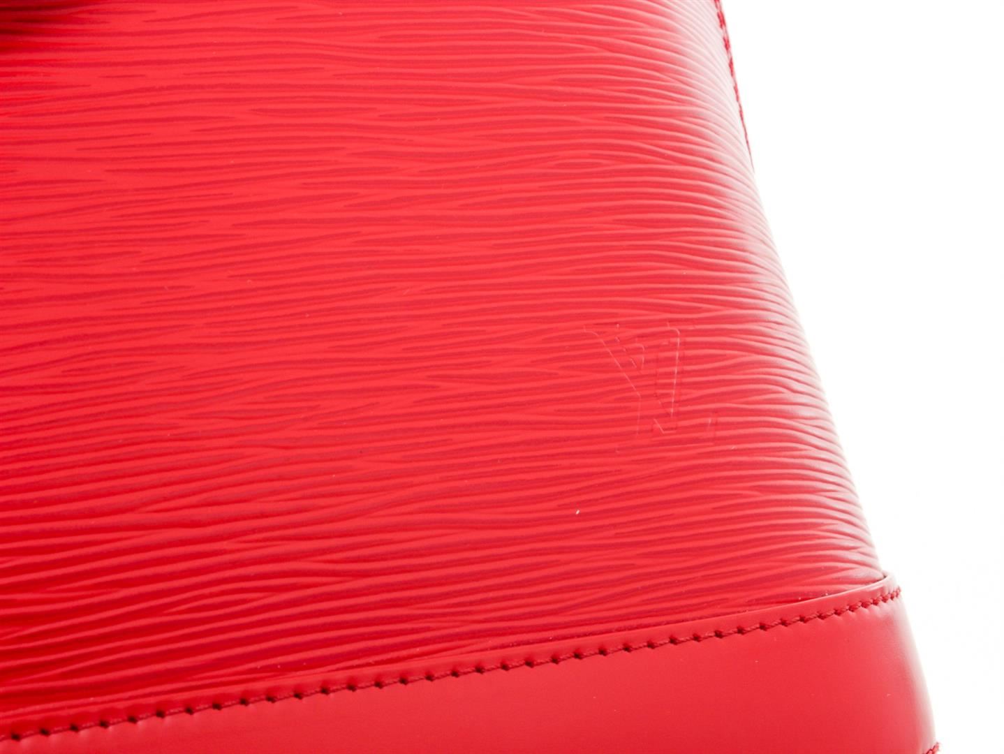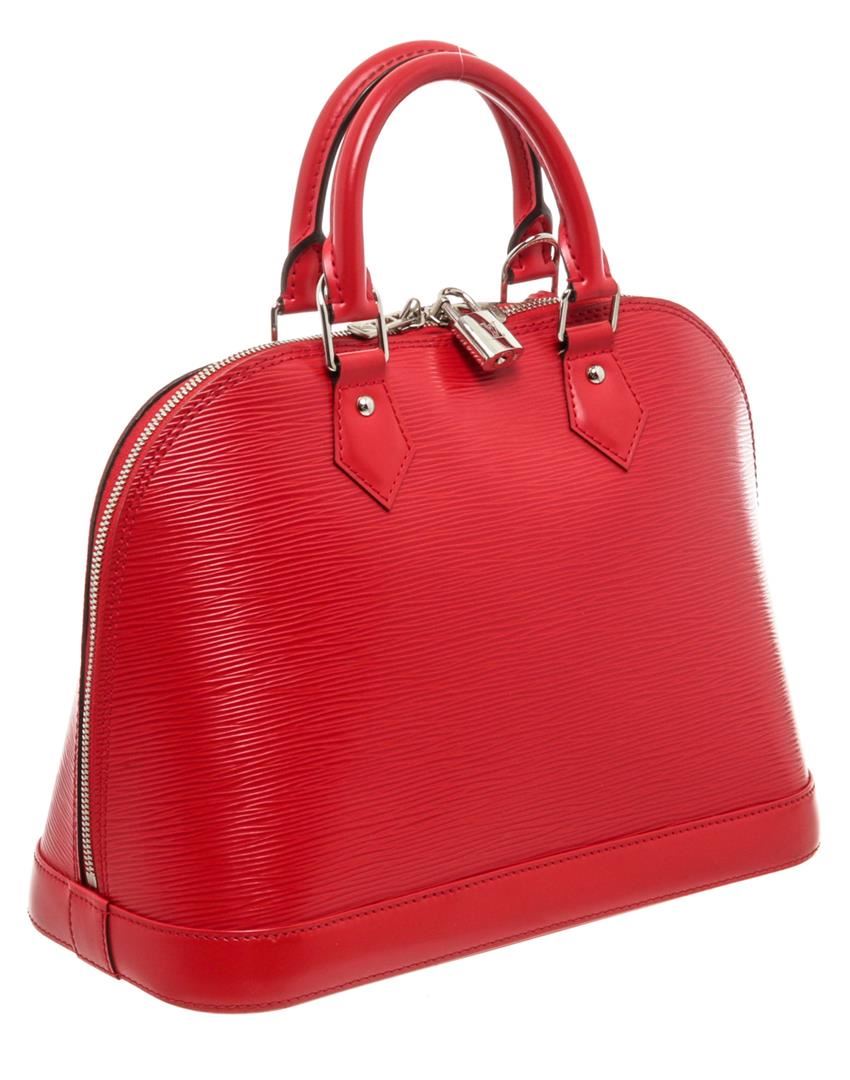 Red Epi leather Louis Vuitton Alma PM with brass hardware, dual rolled handles, embossed logo embellishment at front face, tonal Alcantara lining, dual slip pockets at interior wall and zip closure at top. Authentic.