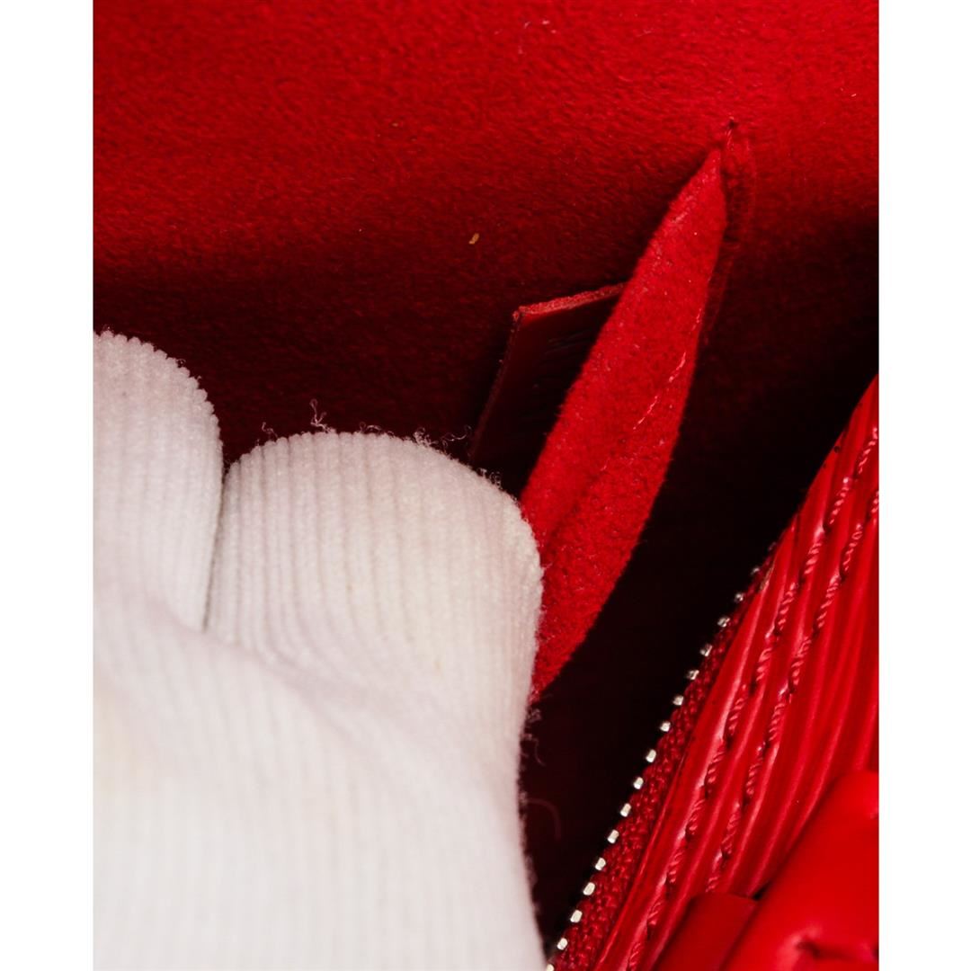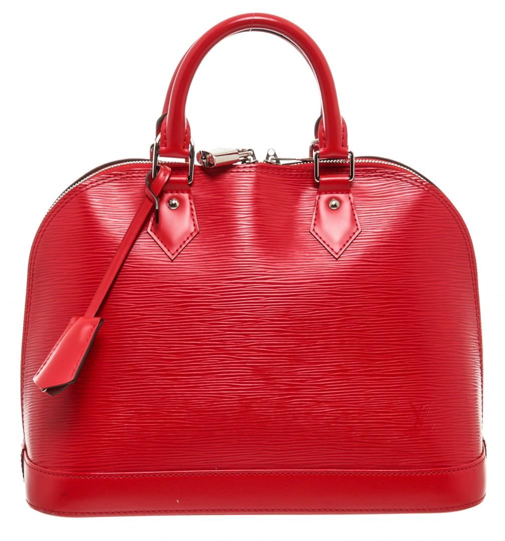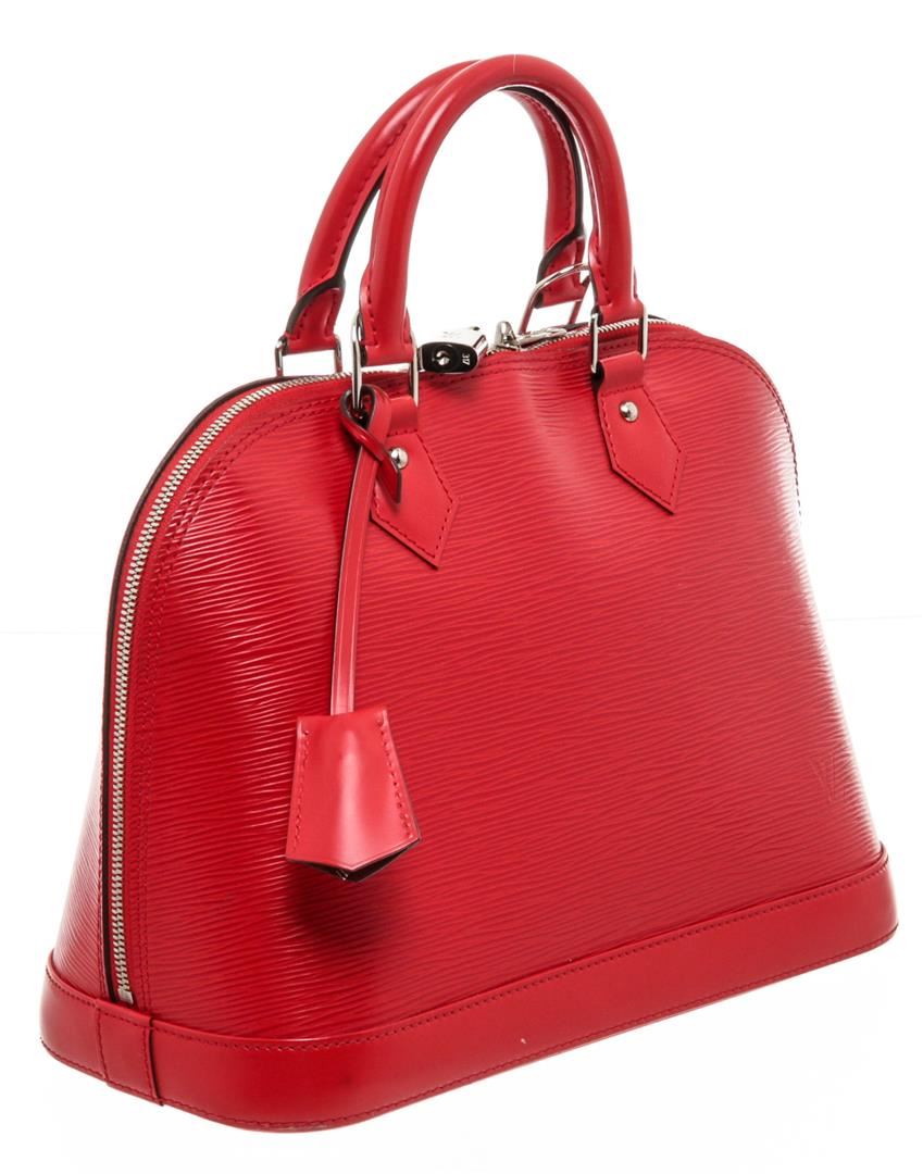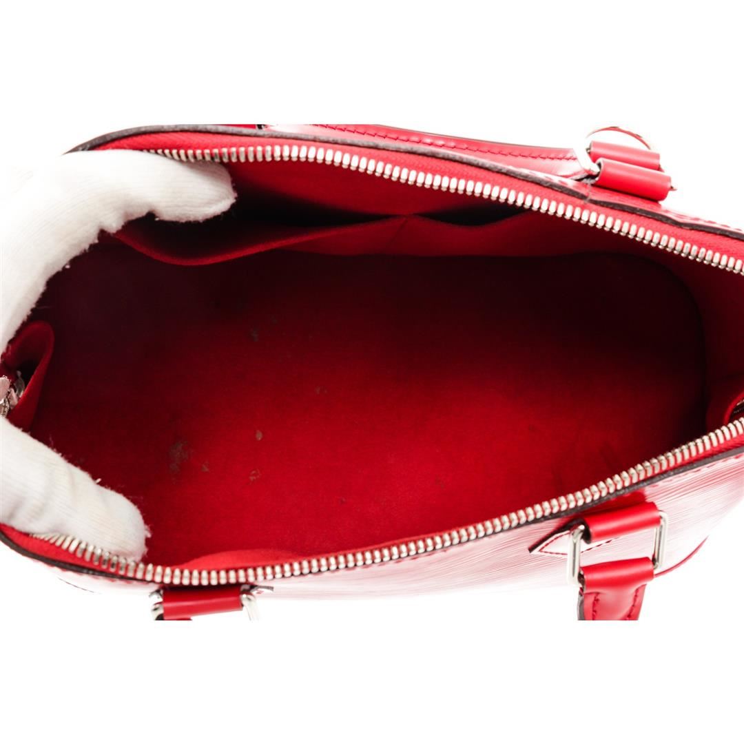 Red Epi leather Louis Vuitton Alma PM with brass hardware, dual rolled handles, embossed logo embellishment at front face, tonal Alcantara lining, dual slip pockets at interior wall and zip closure at top. Authentic.