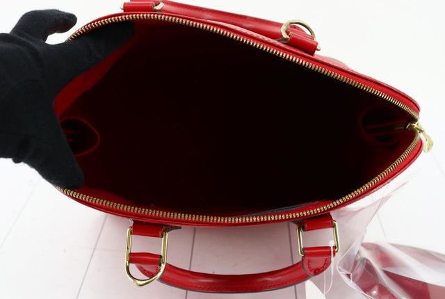 Louis Vuitton Red Epi Leather Alma PM Handbag. All available information is listed in the description and shown in the photos. Red Epi leather Louis Vuitton Alma PM with gold-tone hardware, dual rolled top handle, single detachable shoulder strap, red Alcantara lining, single interior slit pocket and two-way zip closure. 12.5"x6"x9.5"xBag Drop:3"/31.7cmx15.2cmx24.1cmxBag Drop:7.6cm