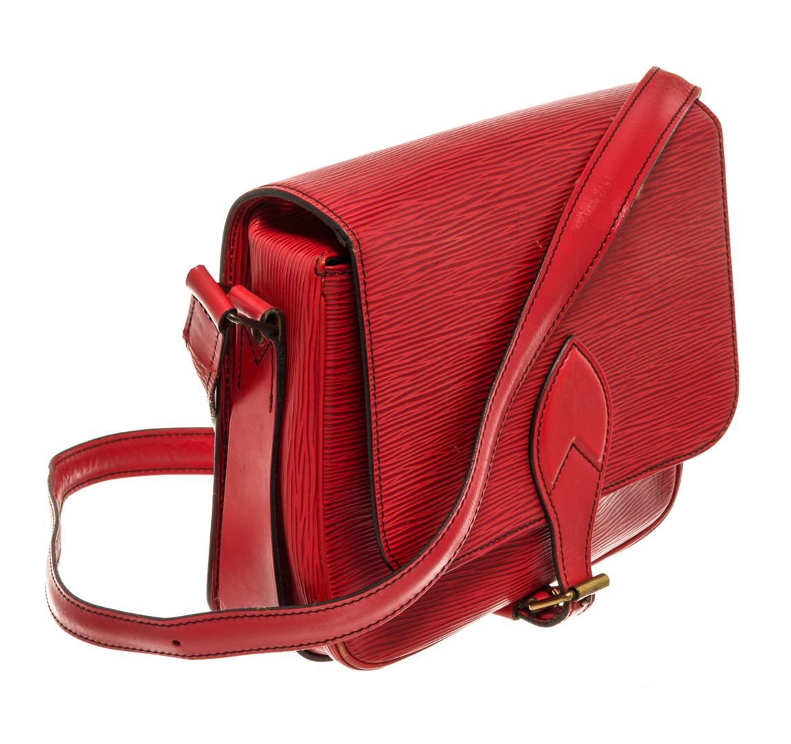 One Louis Vuitton Red Epi Leather Cartouchiere Crossbody Bag. Item is sold AS-IS. All available information is listed in the description and shown in the photo. Louis Vuitton Red Epi Leather Cartouchiere Crossbody Bag with gold-tone hardware, leather trim, black leather lining, interior compartments pocket, adjustable leather shoulder crossbody strap and flap closure.