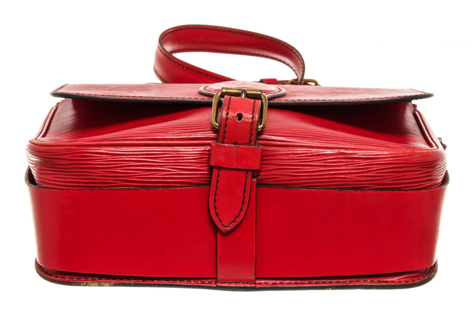 One Louis Vuitton Red Epi Leather Cartouchiere Crossbody Bag. Item is sold AS-IS. All available information is listed in the description and shown in the photo. Louis Vuitton Red Epi Leather Cartouchiere Crossbody Bag with gold-tone hardware, leather trim, black leather lining, interior compartments pocket, adjustable leather shoulder crossbody strap and flap closure.