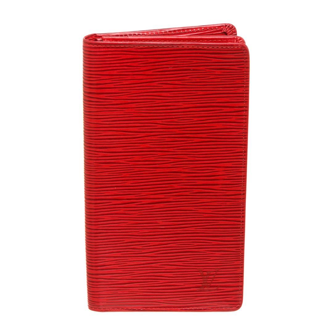 Brown red epi leather, six credit card slots, and dual bill compartments. Authentic.