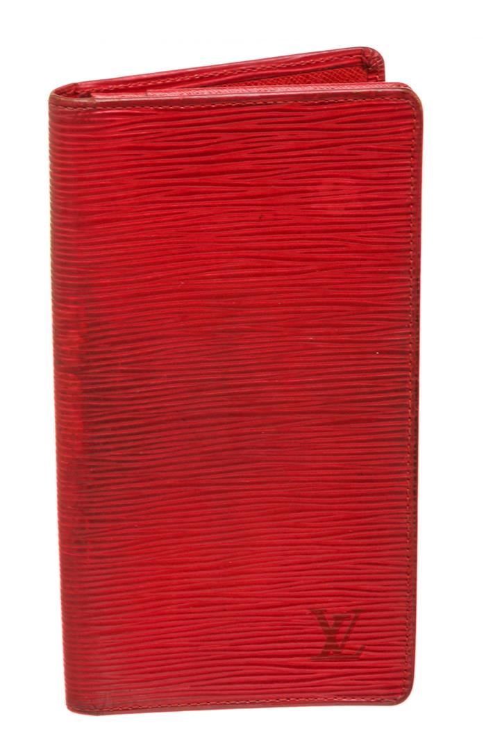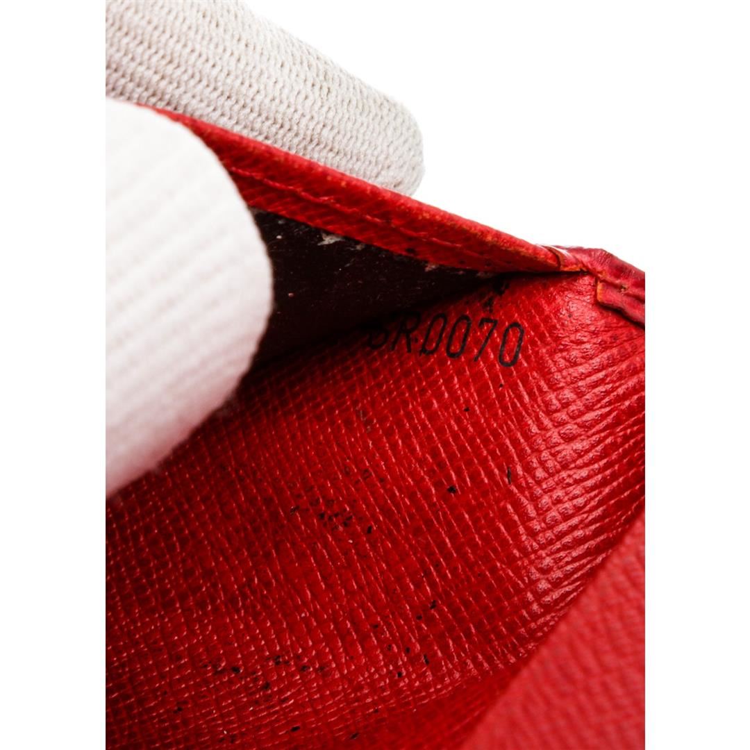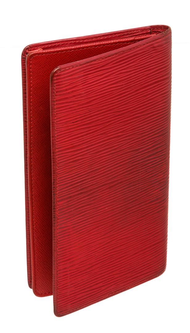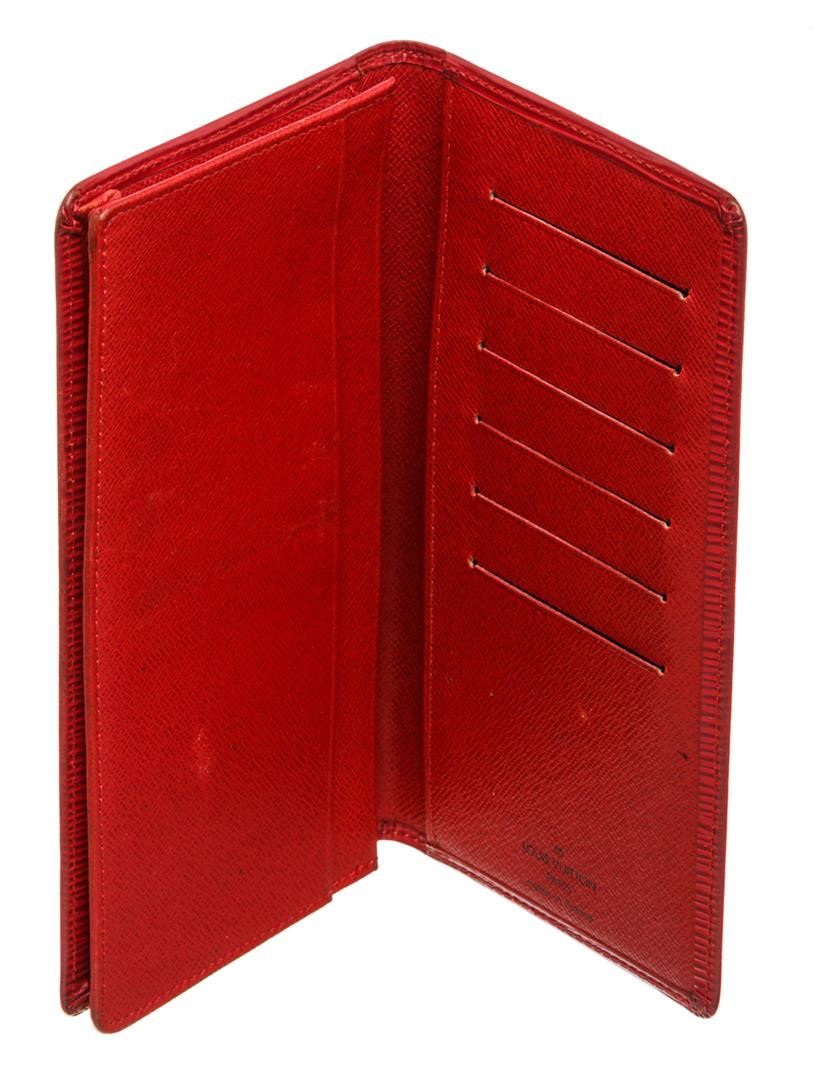 Red epi leather, six credit card slots, and dual bill compartments. Authentic.