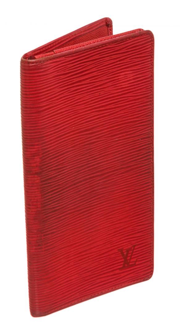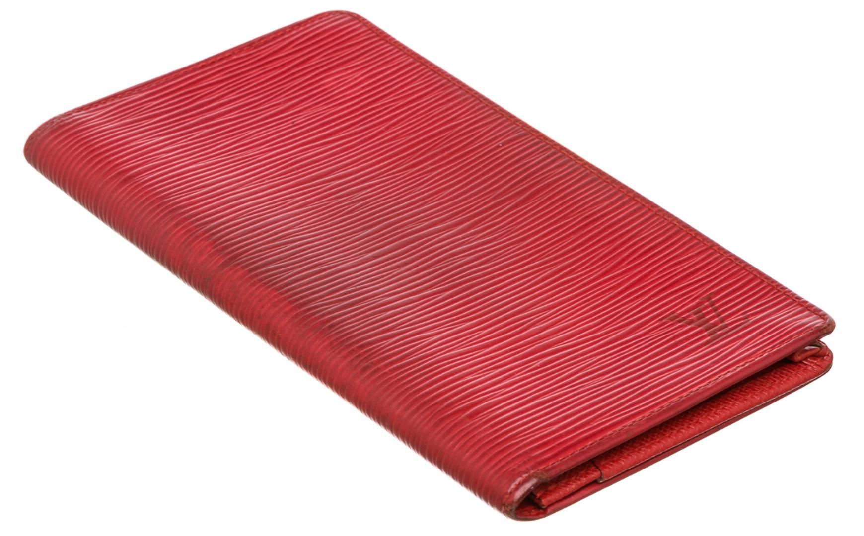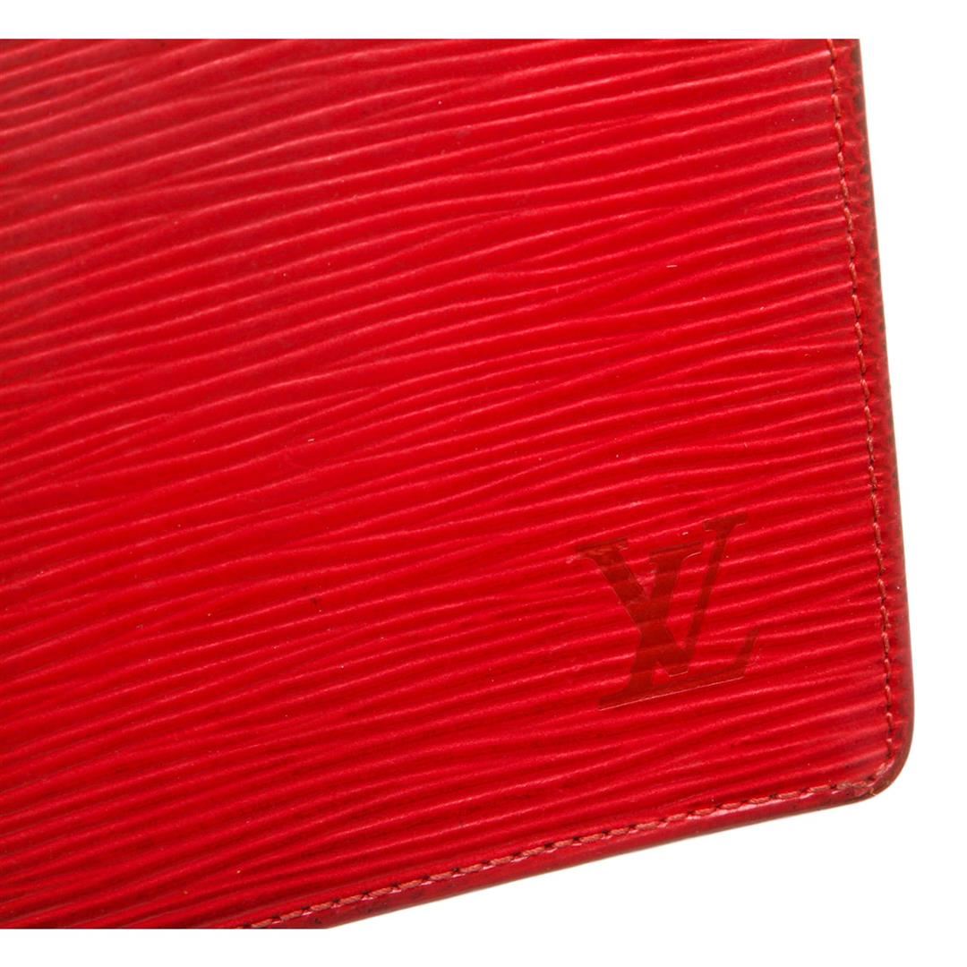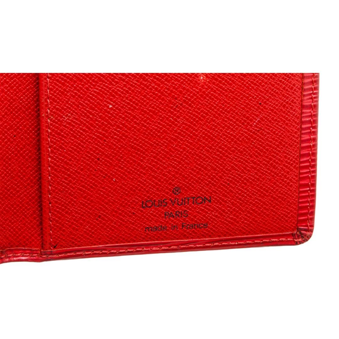 Red epi leather, six credit card slots, and dual bill compartments. Authentic.