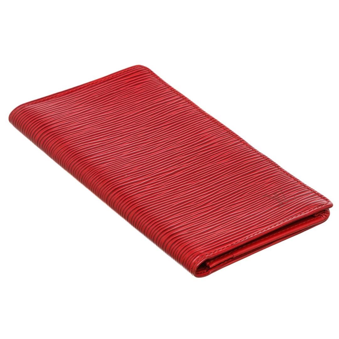 Brown red epi leather, six credit card slots, and dual bill compartments. Authentic.