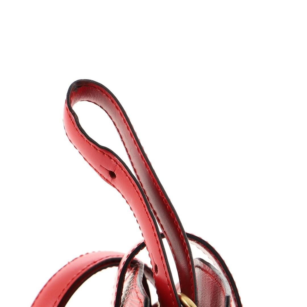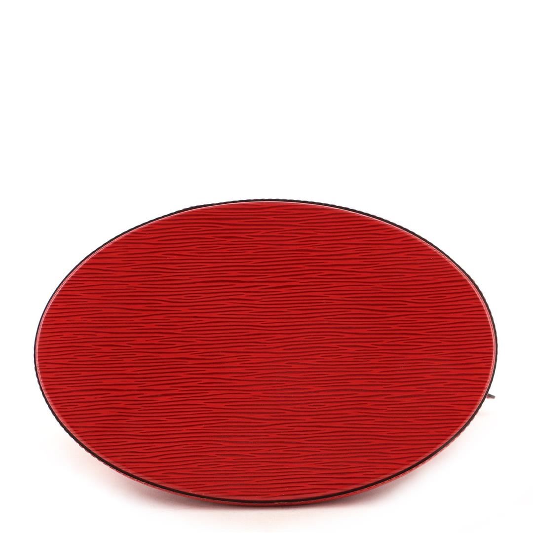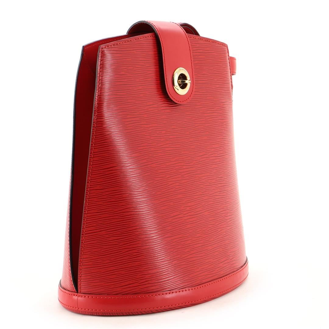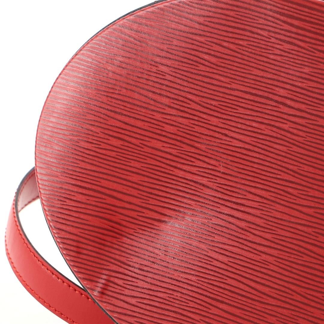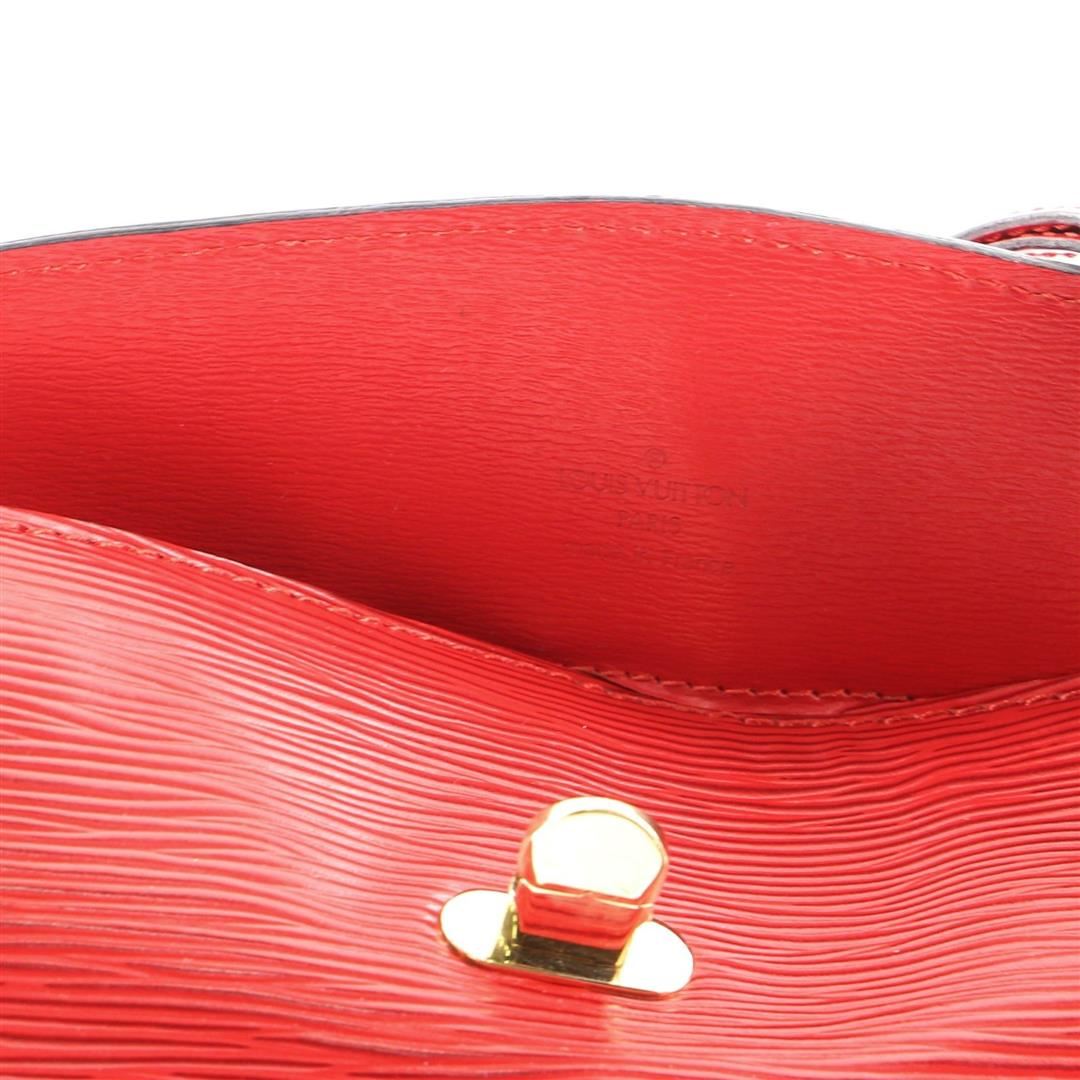 Red Epi leather Louis Vuitton Cluny shoulder bag with gold-tone hardware, single flat shoulder strap with peg-in-hole adjustment, embossed logo at front corner, tonal Alcantara lining, single pocket at interior wall and turn-lock closure at front flap.