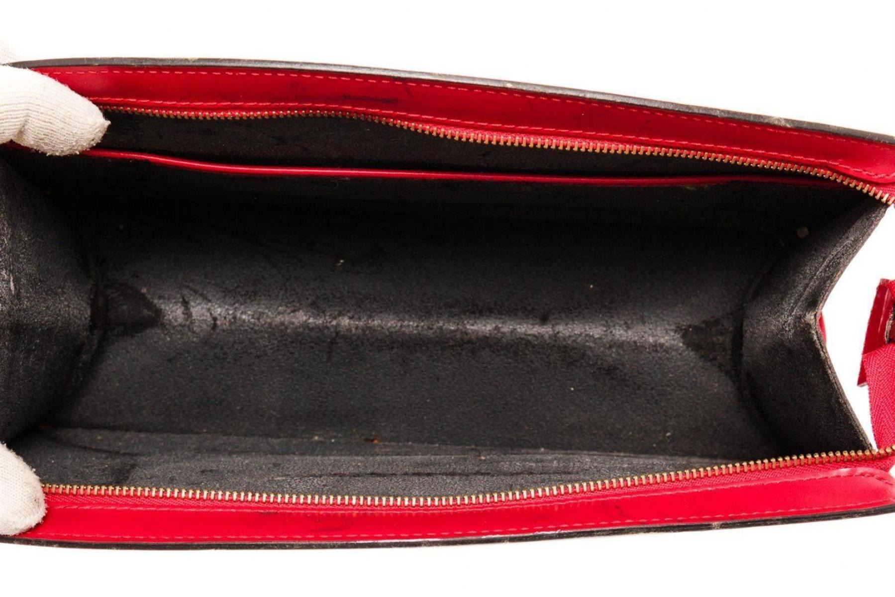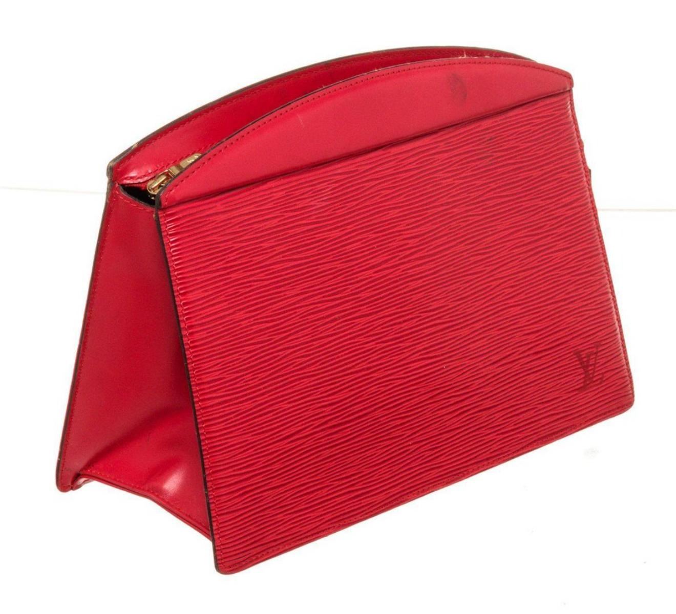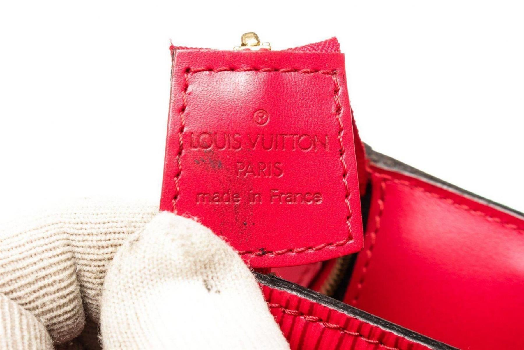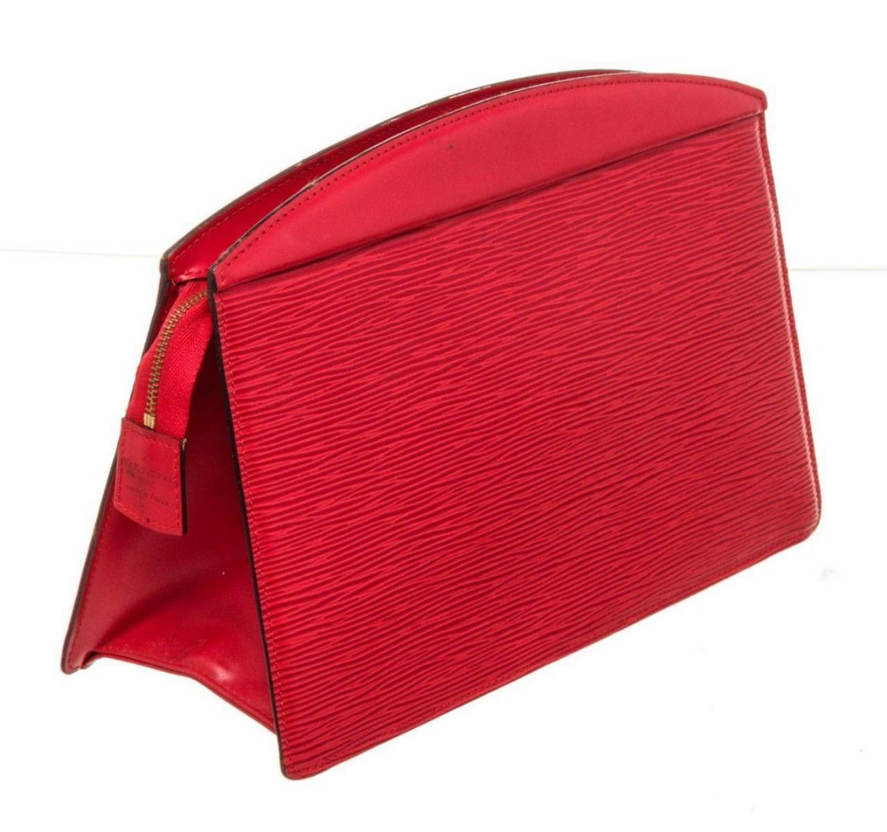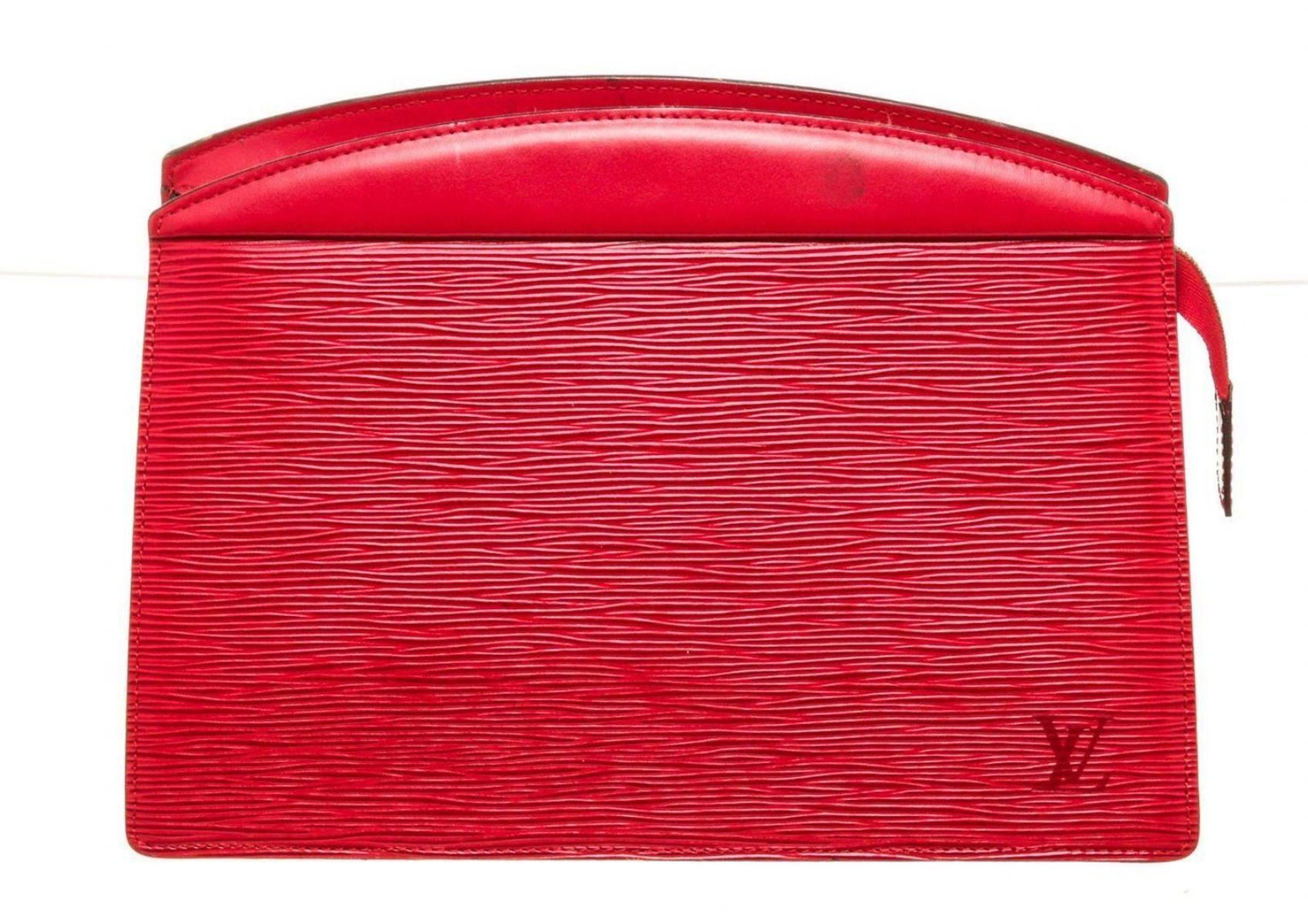 Louis Vuitton Red Epi Leather Clutch Bag with epi leather, gold-tone hardware, trim tan vachetta leather, interior slip pocket and zipper closure.