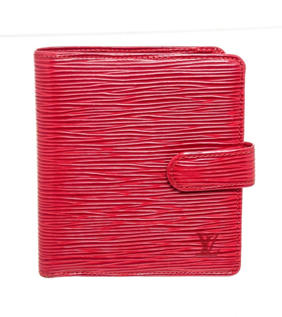 Louis Vuitton Red Epi Leather Compact Tab Wallet with red-tone hardware, red epi leather trim, exterior flap pockets, interior flap pockets, and flap closure Measurements: Length: 4.25 in / 11 cm Width: 25 in / 64 cm 3 in / 8 cmCONDITION: Pre-Owned Good overall, please see photographs for detail.