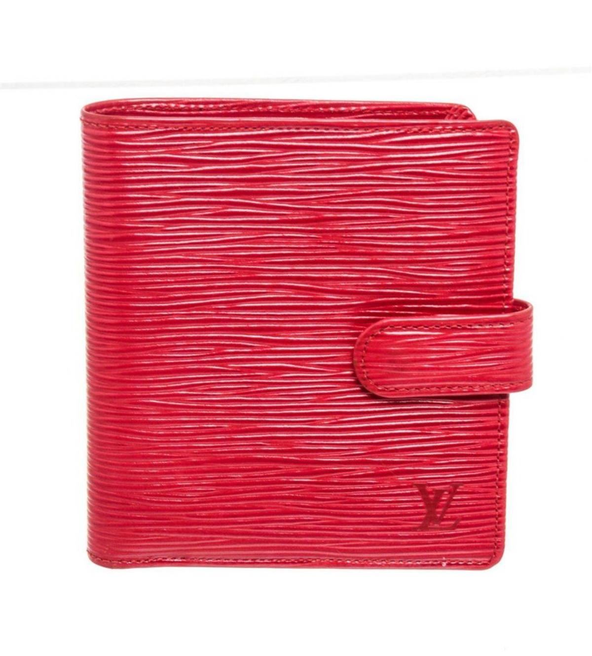 Louis Vuitton Red Epi Leather Compact Tab Wallet with red-tone hardware, red epi leather trim, exterior flap pockets, interior flap pockets, and flap closure. Measurements: Length: 4.25 in / 11 cm Width: 25 in / 64 cm 3 in / 8 cmCONDITION: Pre-Owned Good overall, please see photographs for detail.