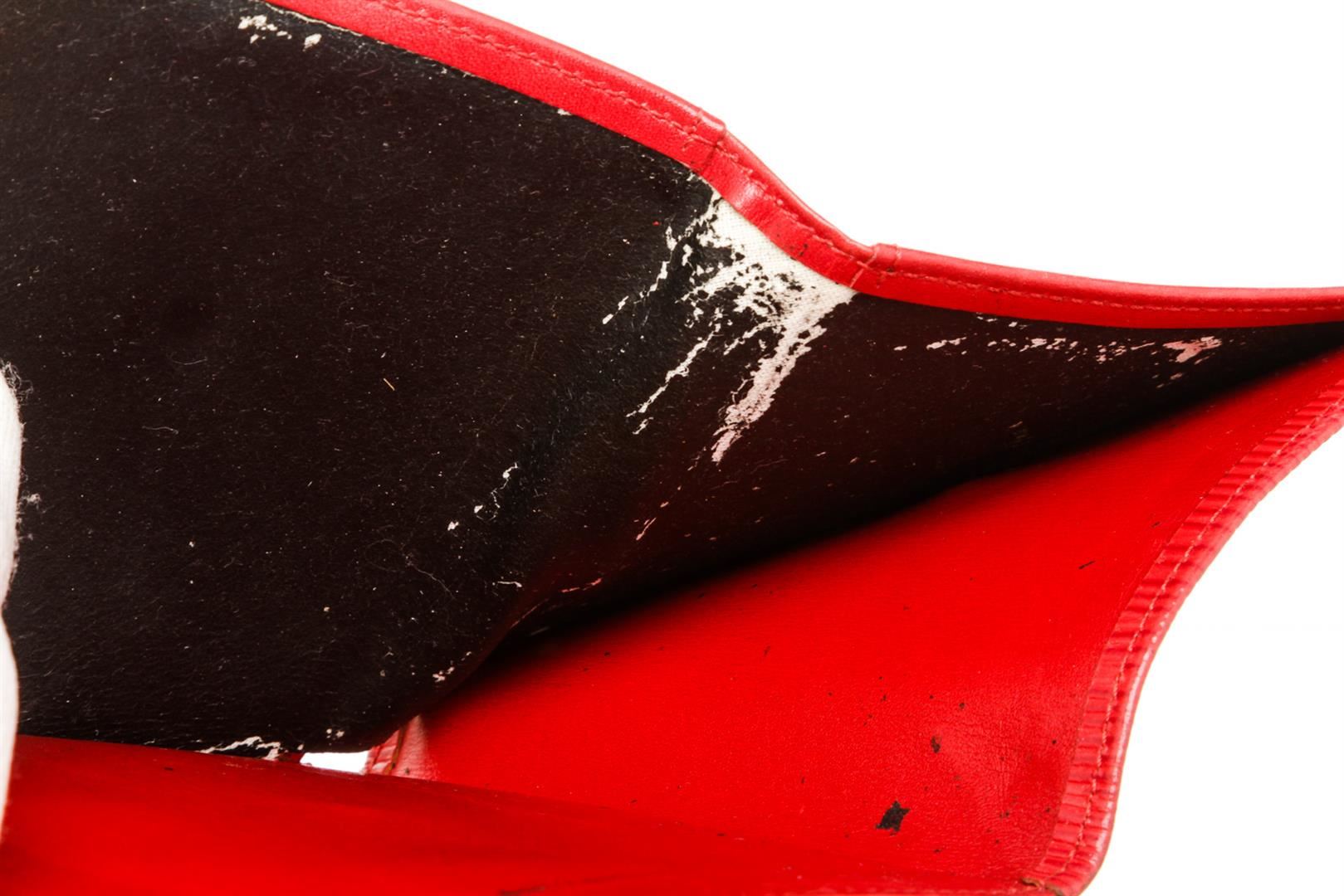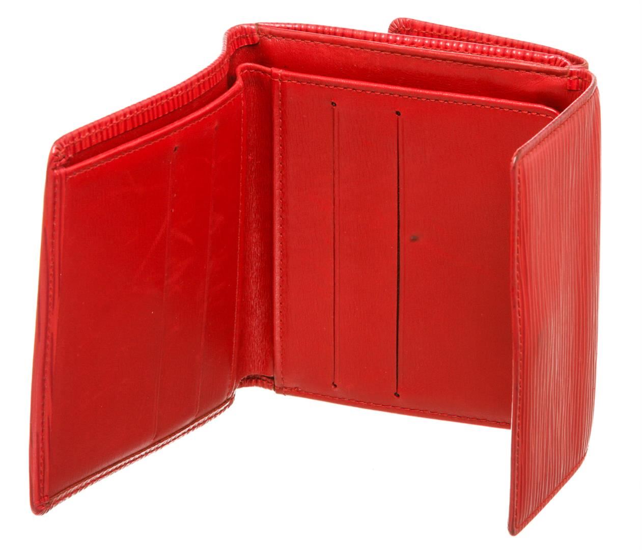 Red Epi leather Louis Vuitton Elise wallet with gold-tone hardware, single pocket at front with snap closure, tonal leather lining, single bill compartment, six card slots and snap closure at back.