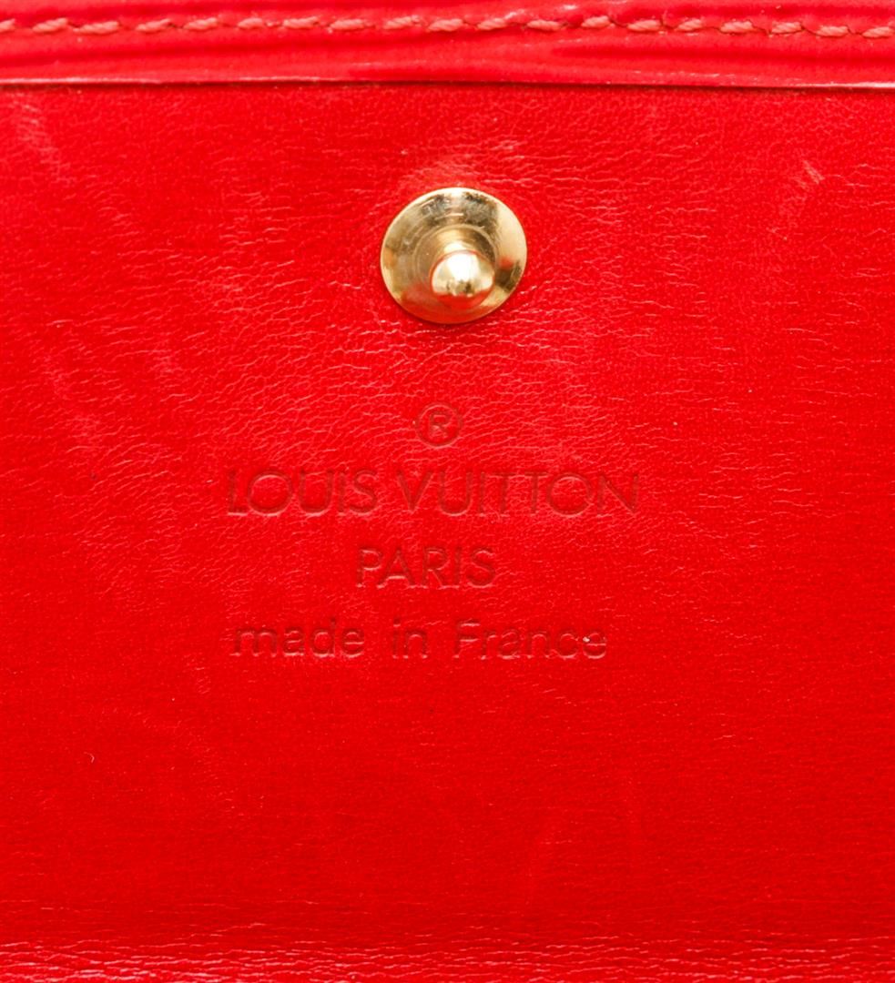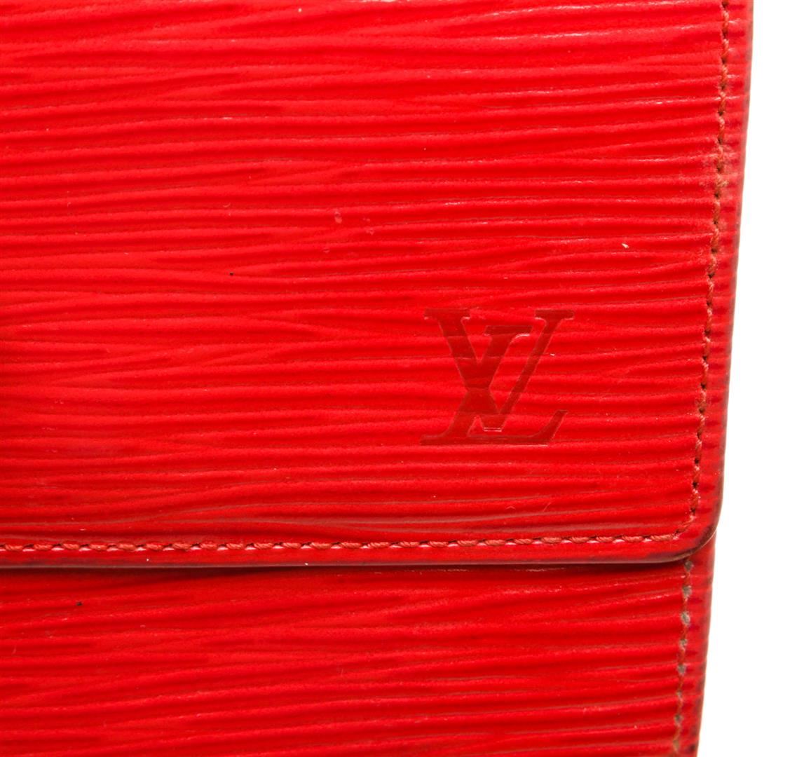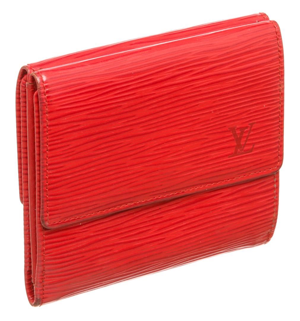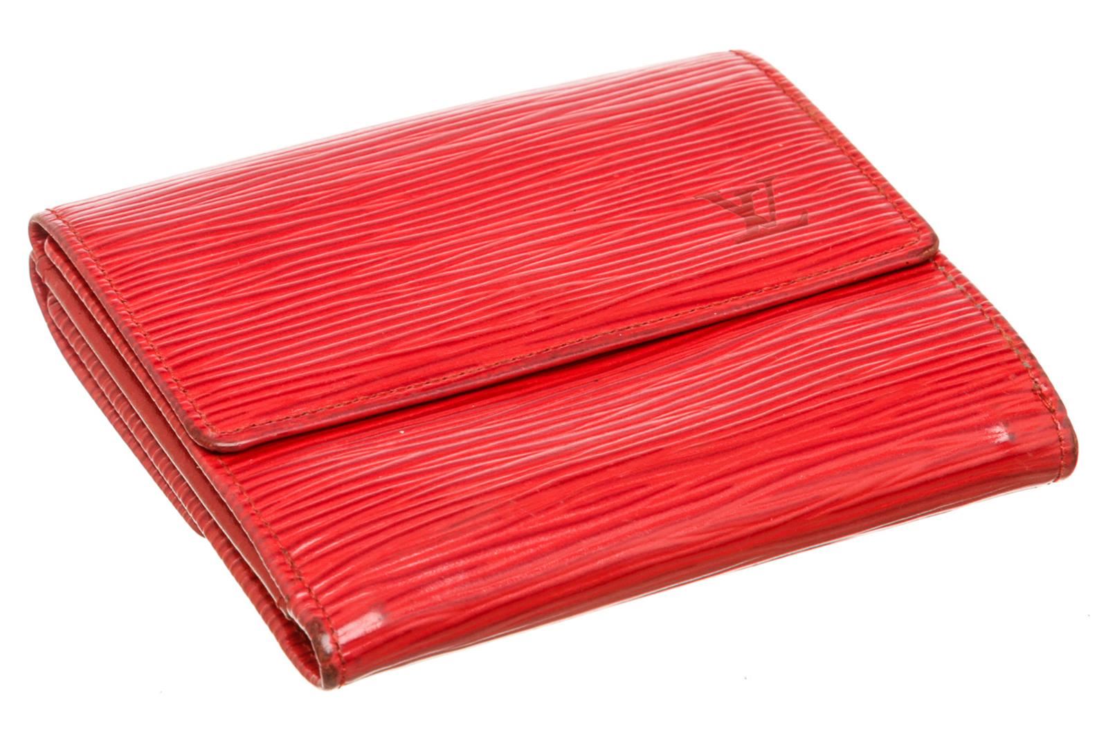 Red Epi leather Louis Vuitton Elise wallet with gold-tone hardware, single pocket at front with snap closure, tonal leather lining, single bill compartment, six card slots and snap closure at back.