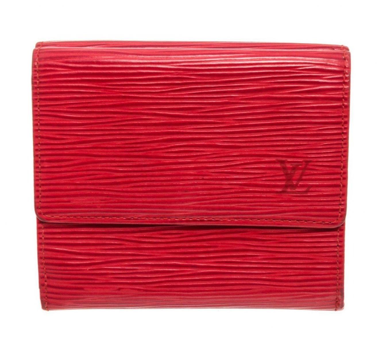 Louis Vuitton Red Epi Leather Elise Wallet. Louis Vuitton Red Epi Leather Elise Wallet with material epi leather, gold-tone hardware, trim tan vachetta, interior cardholder pocket and snap closure. MEASUREMENTS: Length 0.5 in / 1 cm Width 4.25 in / 11