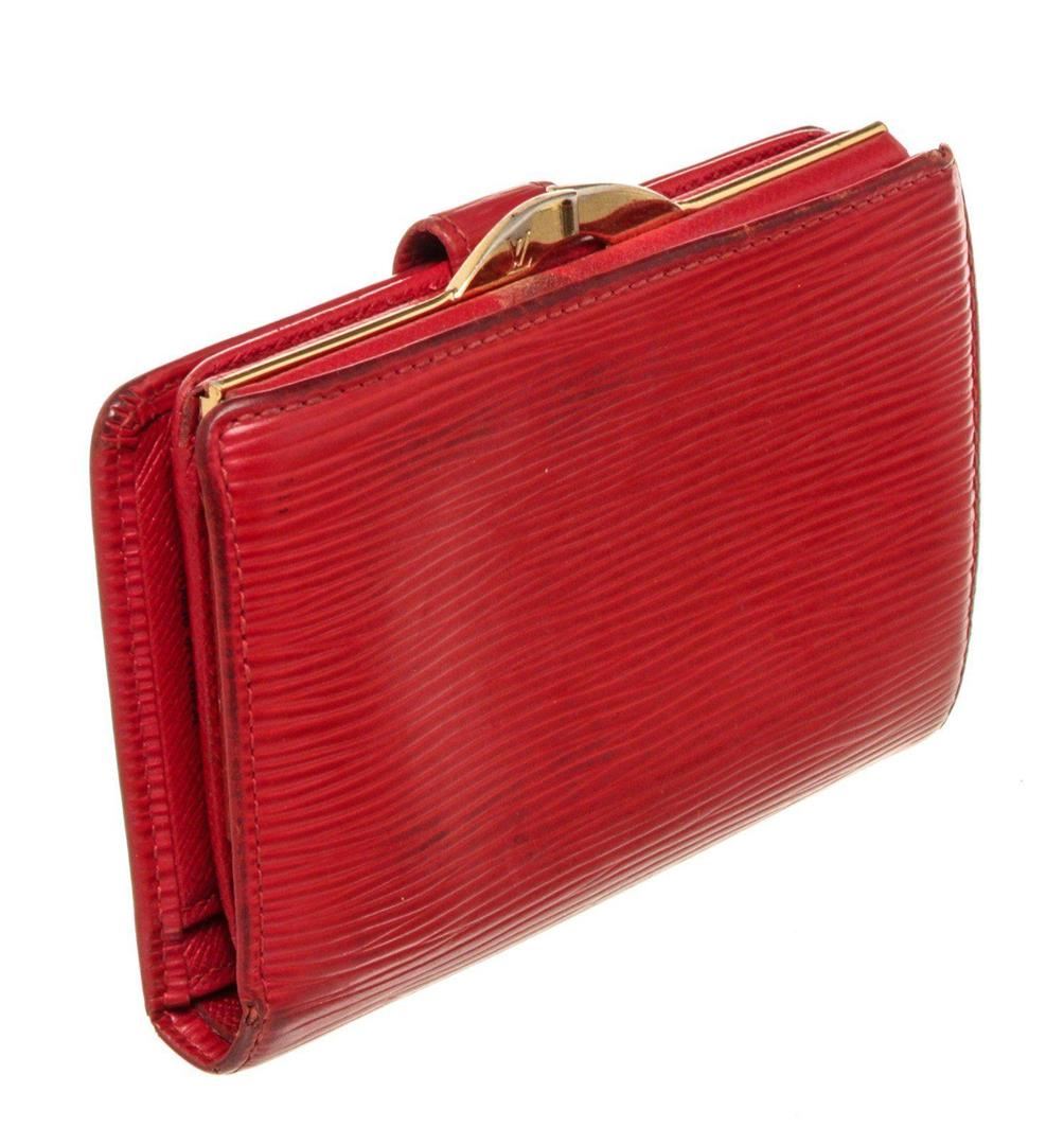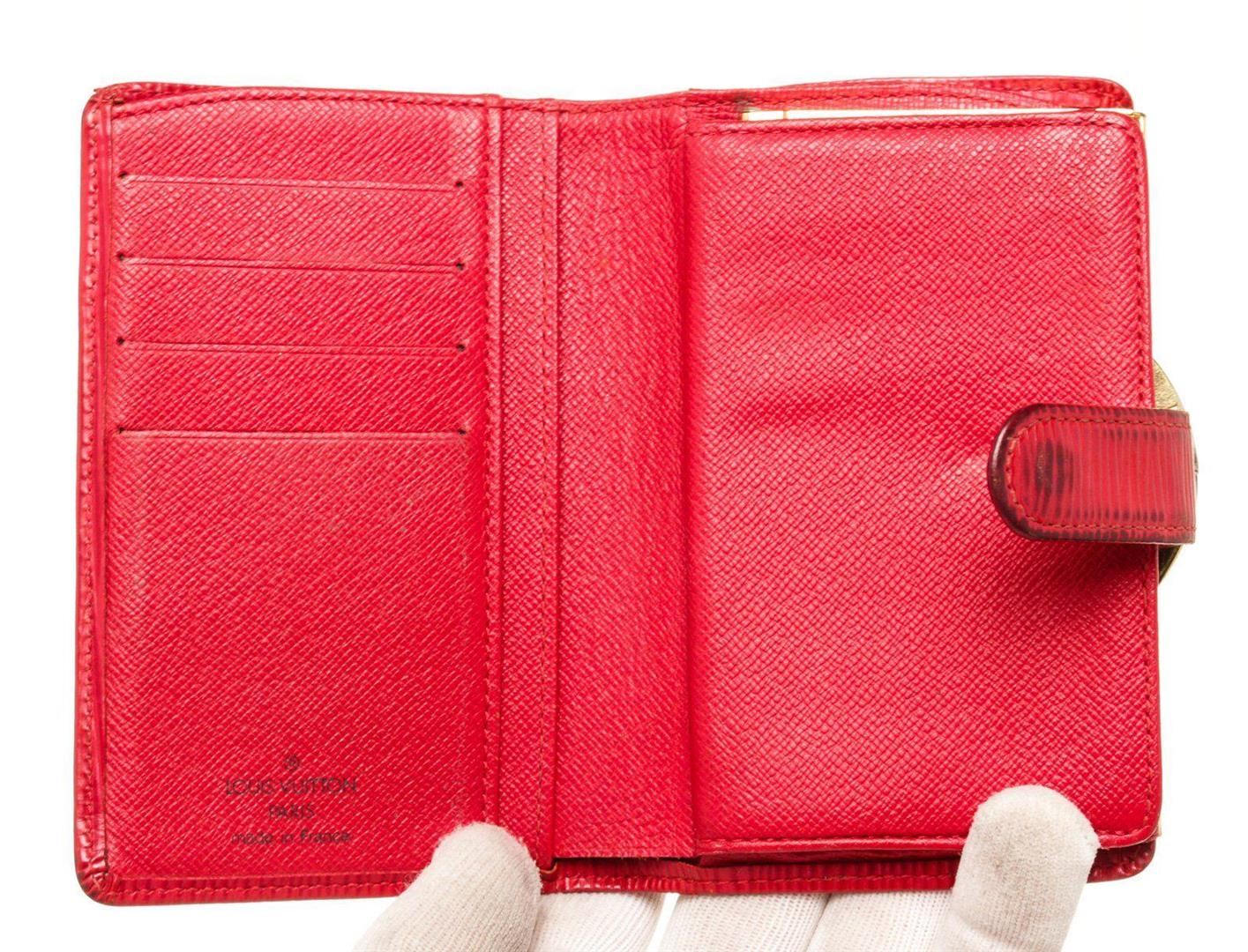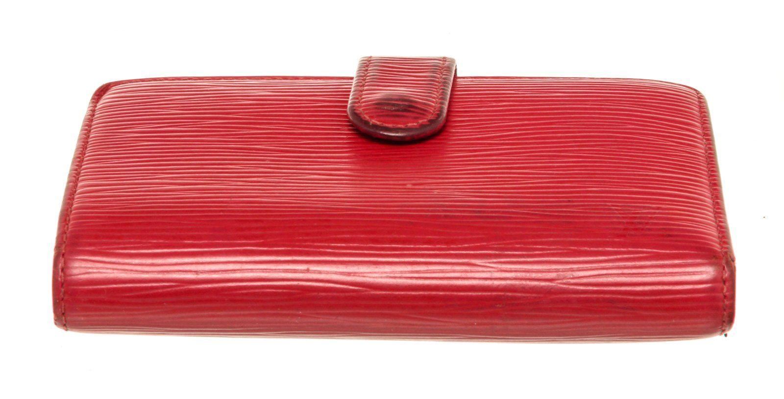 Louis Vuitton Red Epi Leather French Wallet with red leather lining, single interior bill compartment, dual interior slit pockets, four card slots at interior wall kiss lock compartment at exterior, embossed logo at corner, and snap closure at front.