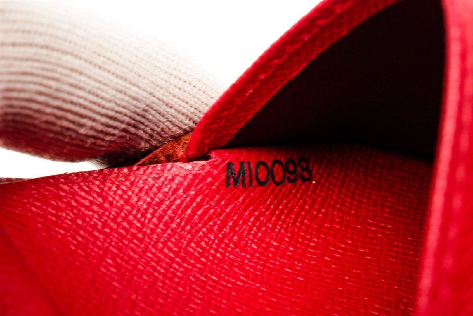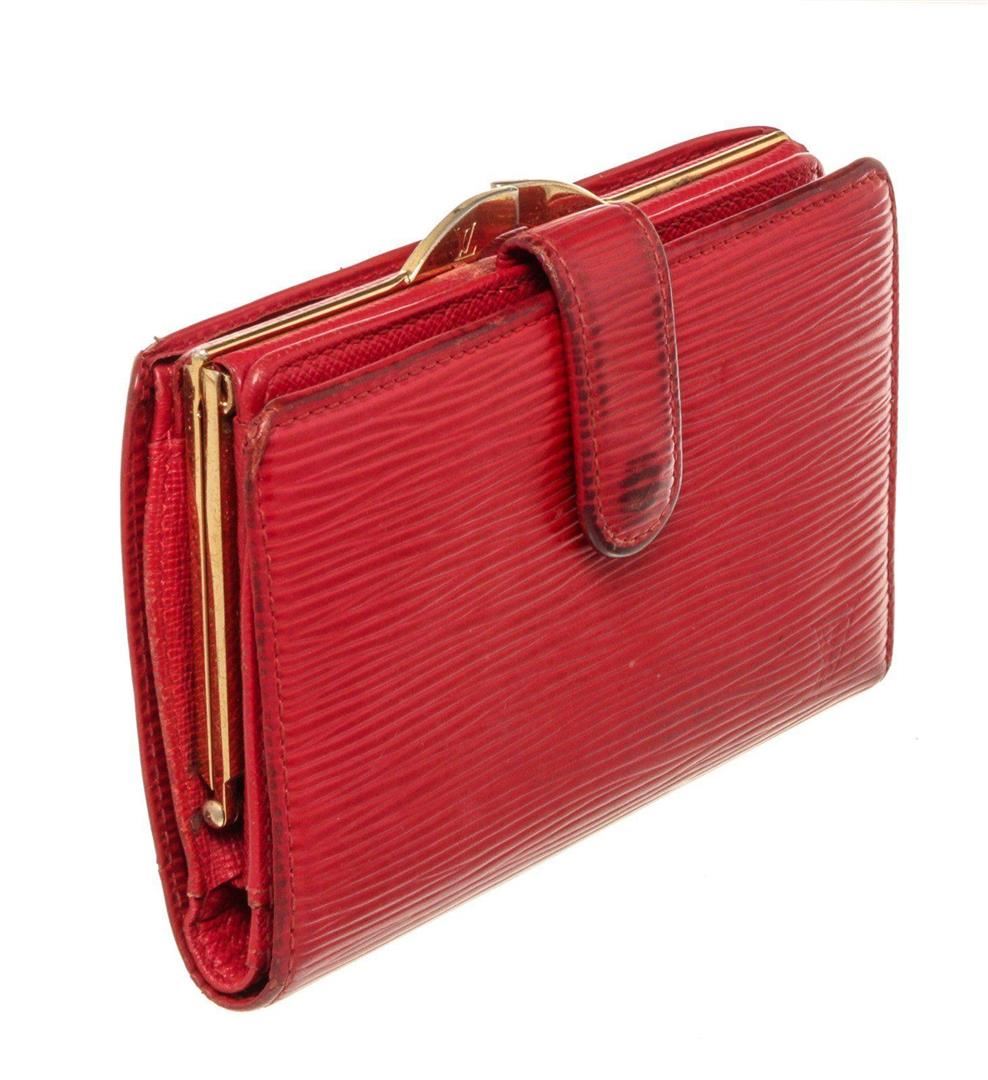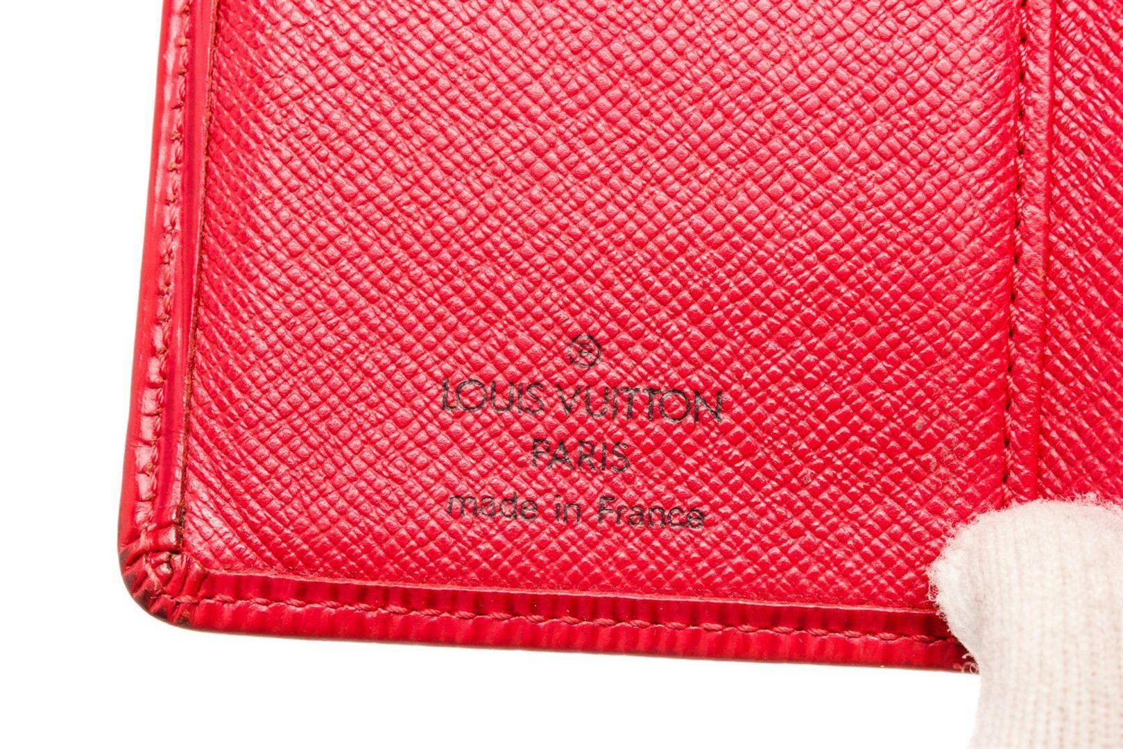 Louis Vuitton Red Epi Leather French Wallet with red leather lining, single interior bill compartment, dual interior slit pockets, four card slots at interior wall kiss lock compartment at exterior, embossed logo at corner, and snap closure at front.