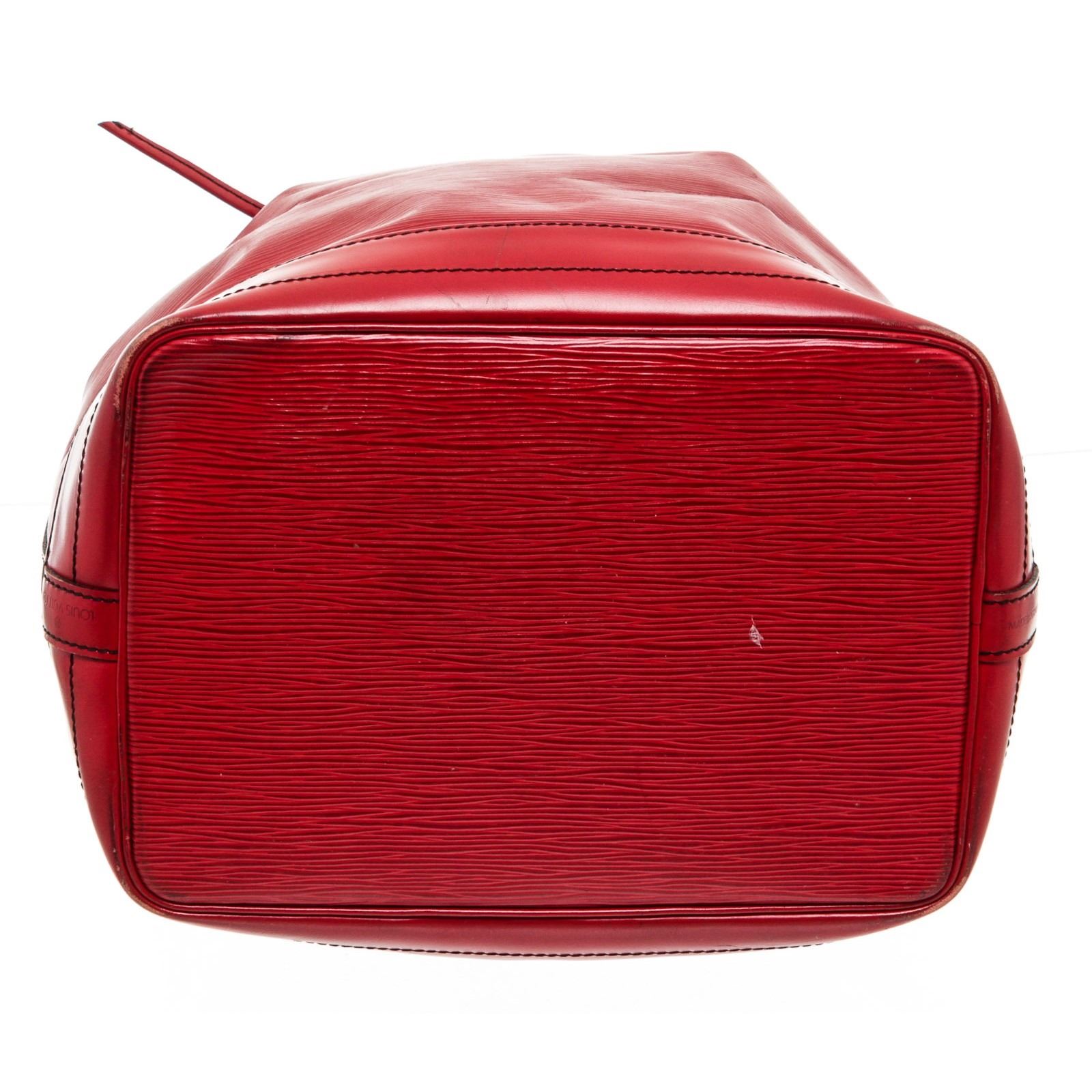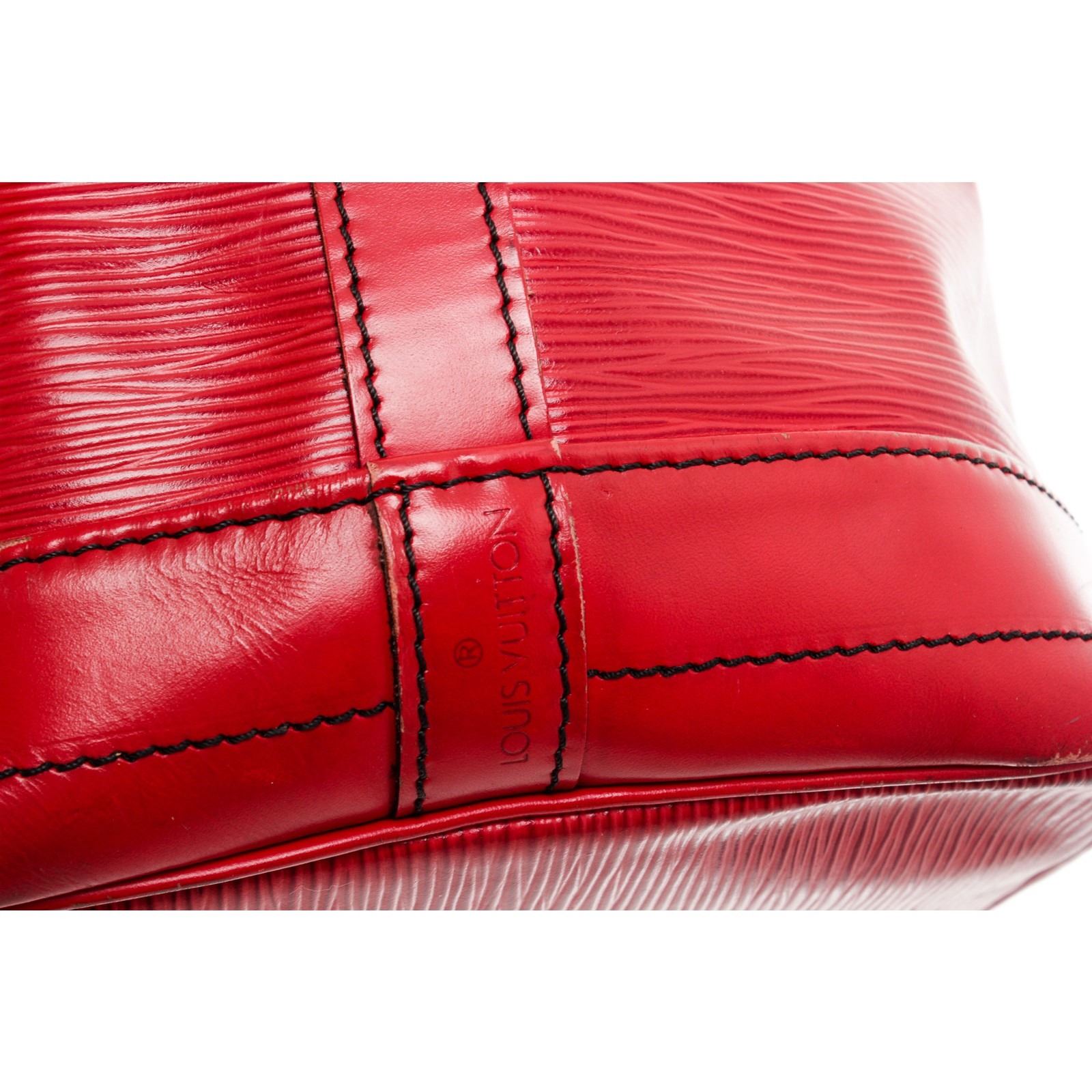 Description: Louis Vuitton Red Epi Leather Noe GM Drawstring Shoulder Bag. Red Epi leather Louis Vuitton Noe GM with brass hardware, single adjustable shoulder strap, tonal leather trim, embossed logo at exterior side, Alcantara lining and drawstring closure at top.