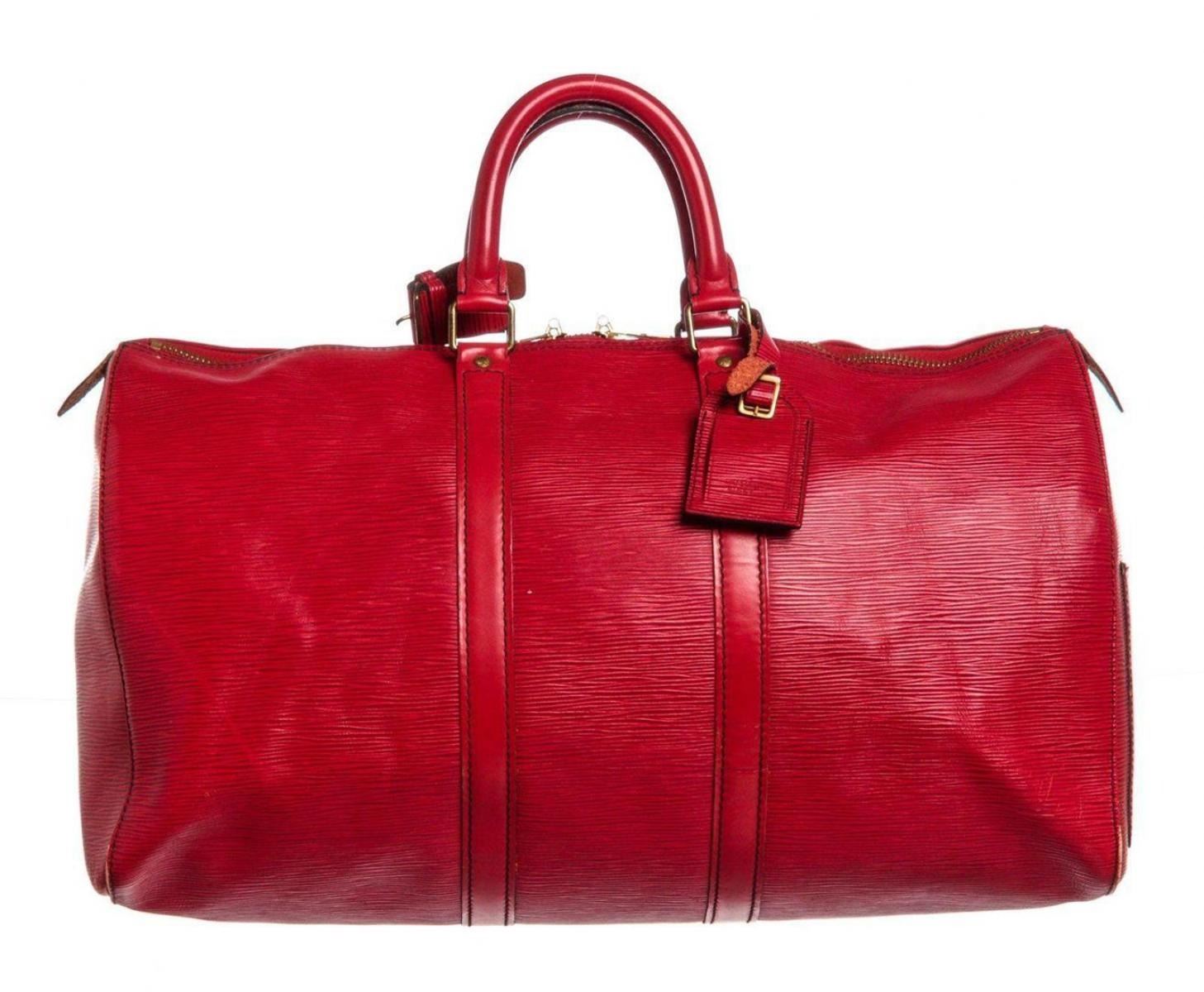 Epi leather Louis Vuitton Keepall 45 with brass hardware, dual rolled top handles, exterior pocket at side, tonal suede lining and zip closure at top. Measurements: Length: 18.5 in / 47 cm Width: 8 in / 20 cm 11 in / 28 cmCONDITION: Pre-Owned Good overall, please see photographs for detail.