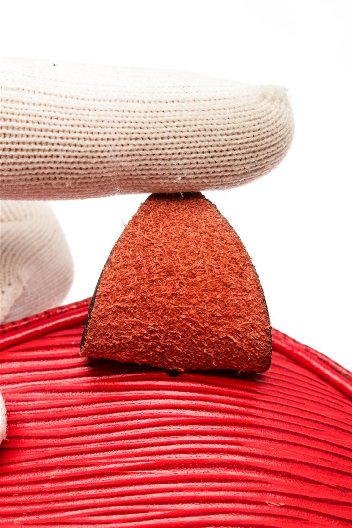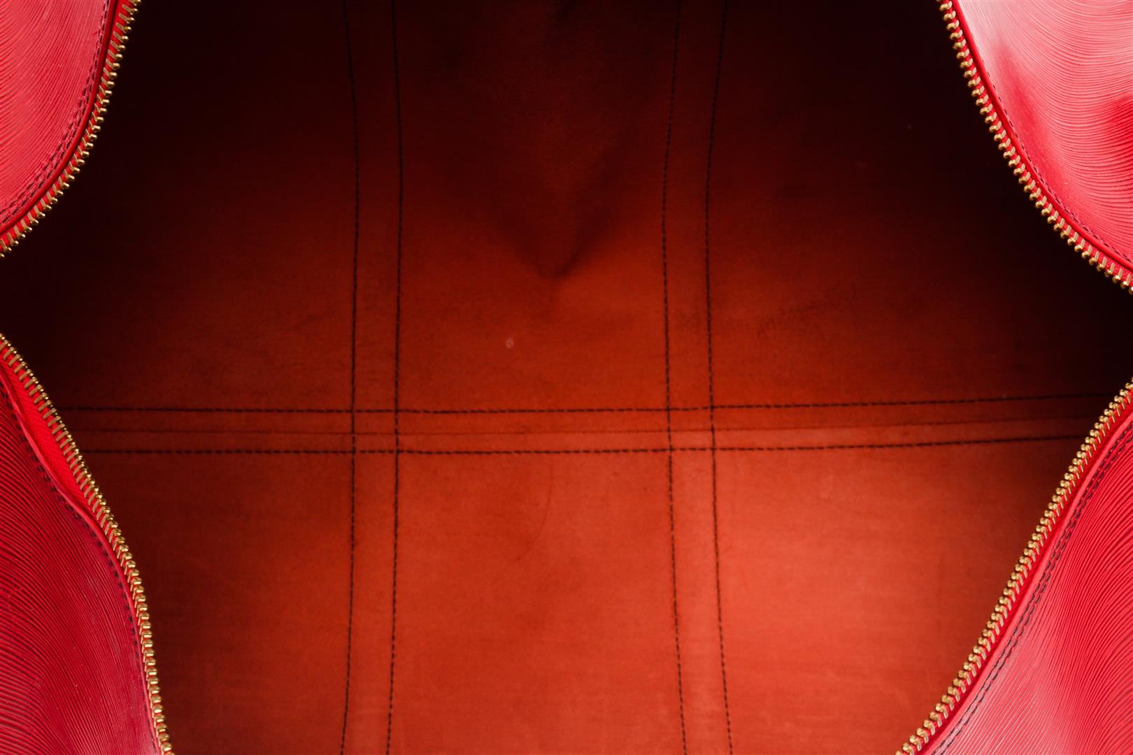 Louis Vuitton Red Epi Leather Keepall 55 Travel Bag. All available information is listed in the description and shown in the photos. Louis Vuitton Red Epi Leather Keepall 55 Travel Bag with gold-tone brass hardware, rolled handles & dual shoulder straps, suede lining & single interior pocket, top zipper closure. Condition Details: Slight creasing, minor wear/discoloration on bottom corners, some tarnishing on zipper pull. Height: 16" Width: 22" Depth: 10.5", Handle Drop: 4" / 40.64 x 55.88 x 26.67 cm