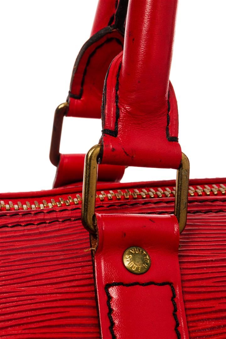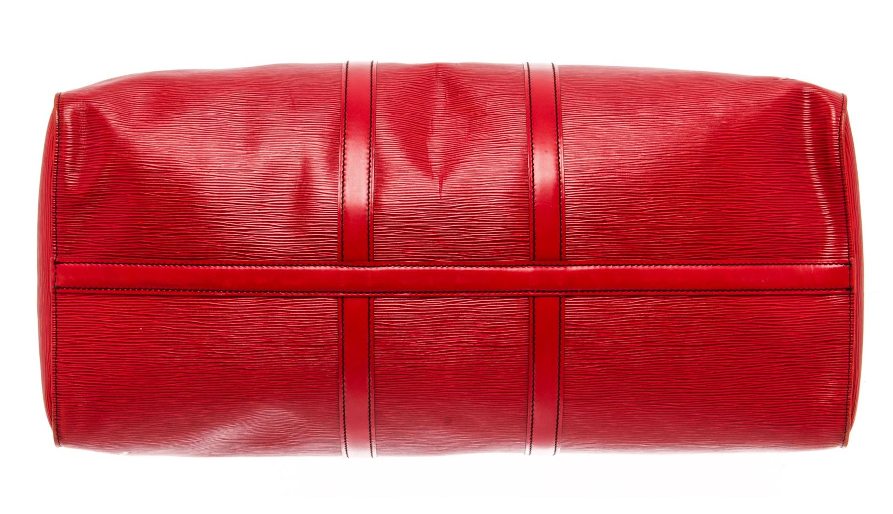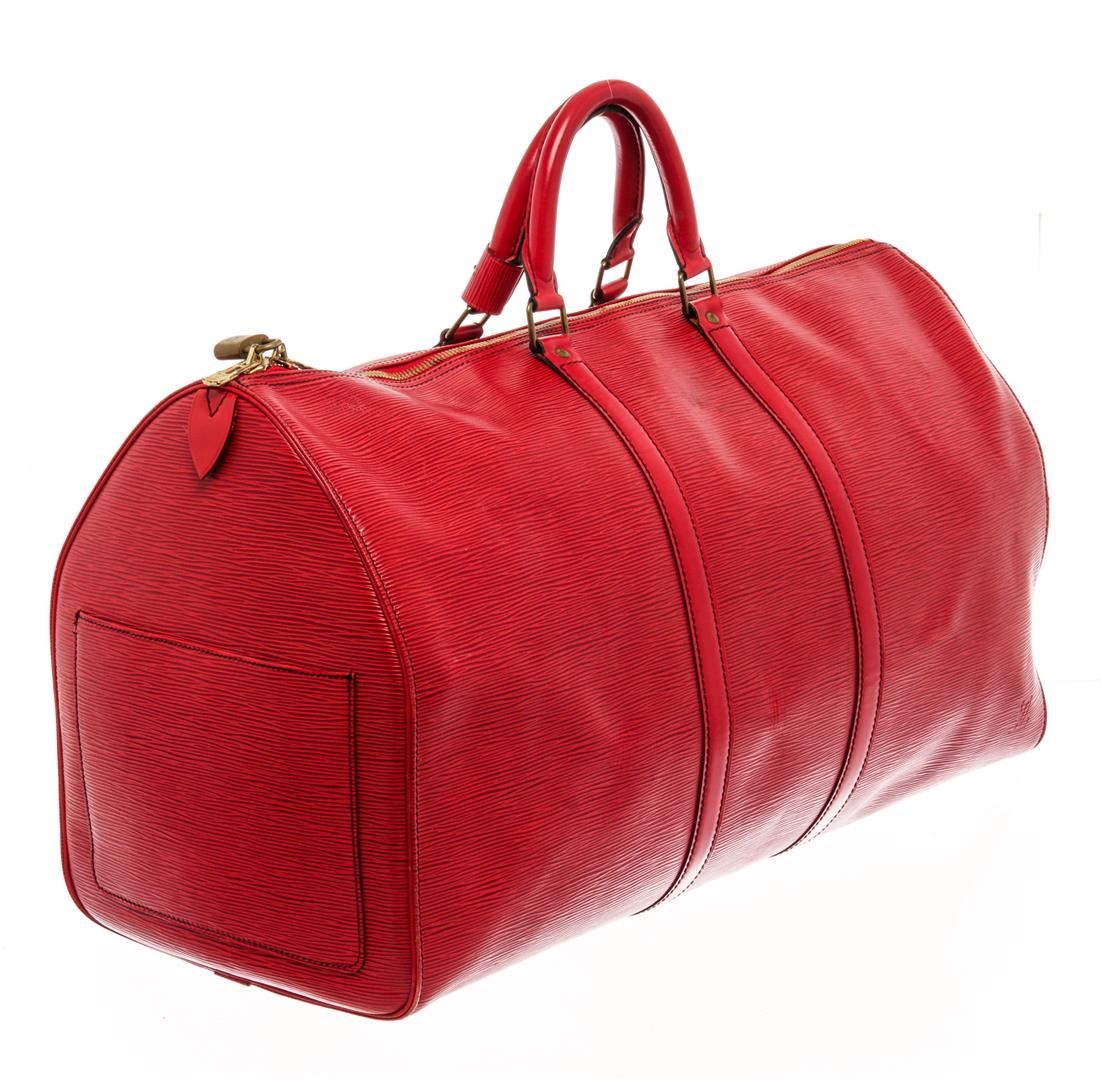 Louis Vuitton Red Epi Leather Keepall 55 Travel Bag. All available information is listed in the description and shown in the photos. Louis Vuitton Red Epi Leather Keepall 55 Travel Bag with gold-tone brass hardware, rolled handles & dual shoulder straps, suede lining & single interior pocket, top zipper closure. Condition Details: Slight creasing, minor wear/discoloration on bottom corners, some tarnishing on zipper pull. Height: 16" Width: 22" Depth: 10.5", Handle Drop: 4" / 40.64 x 55.88 x 26.67 cm