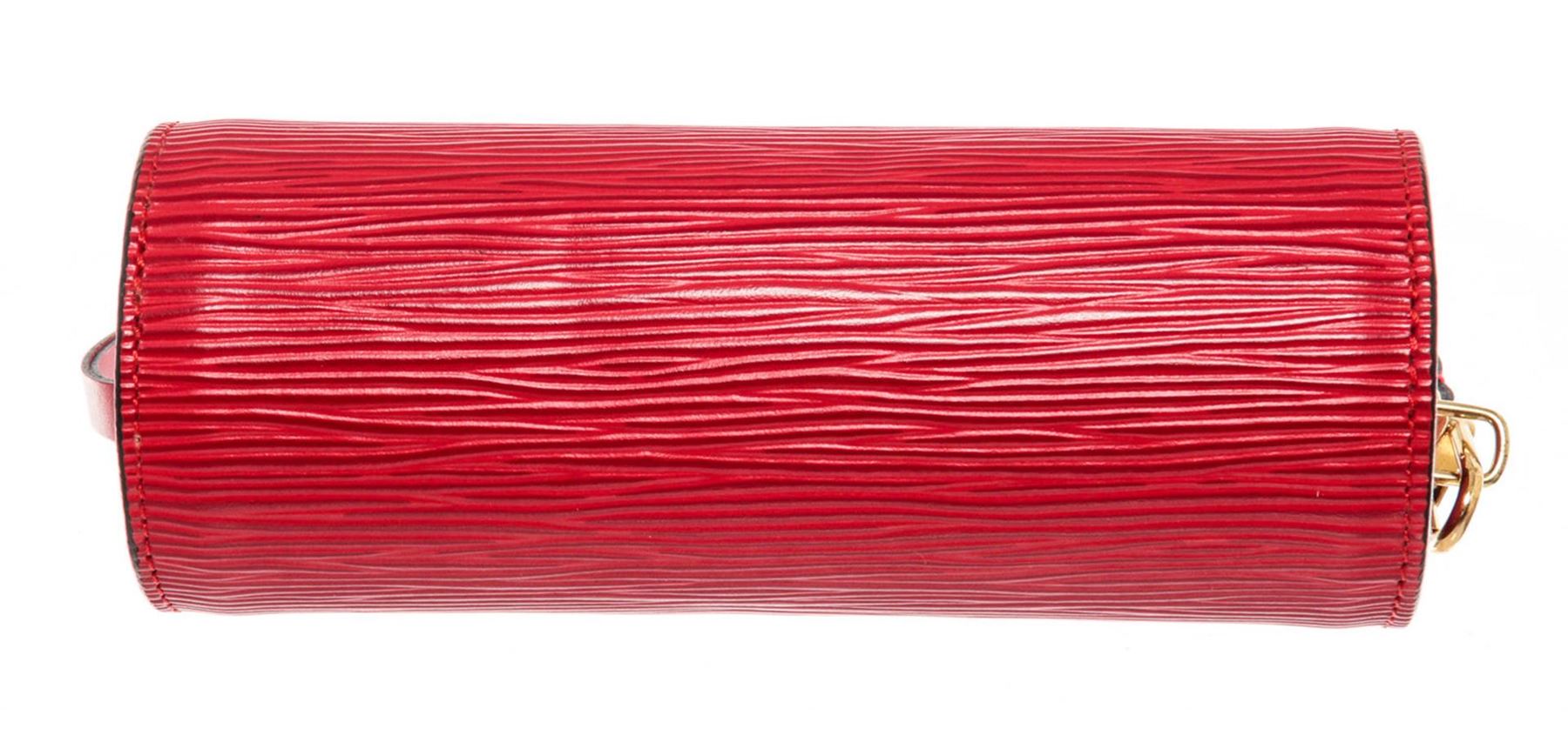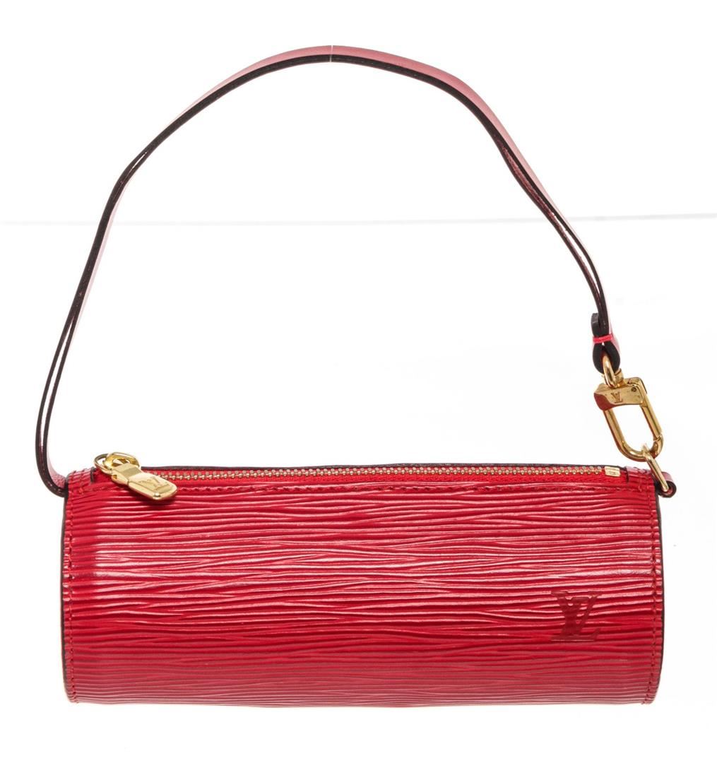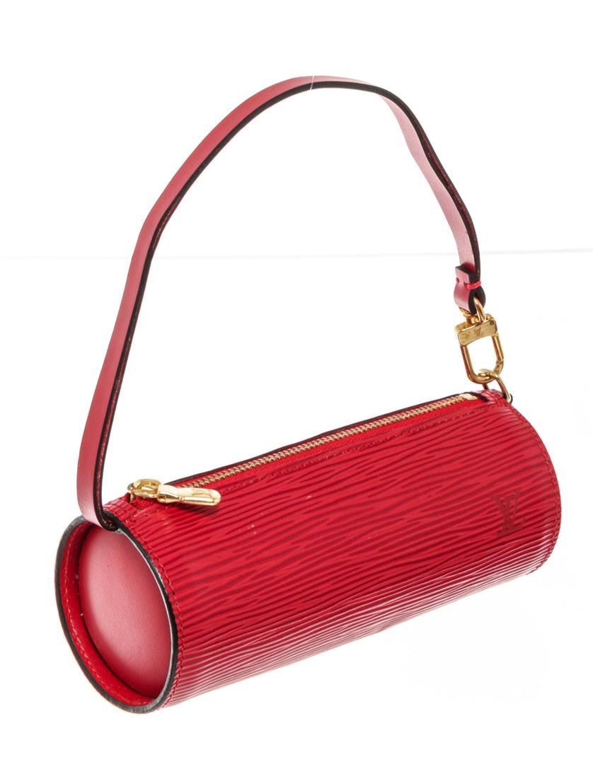 Louis Vuitton Red Epi Leather Mini Papillon Pochette Bag with siler-tone hardware, monogram material, tan vachetta leather trim, top handle, leather shoulder strap, and zipper closure.
