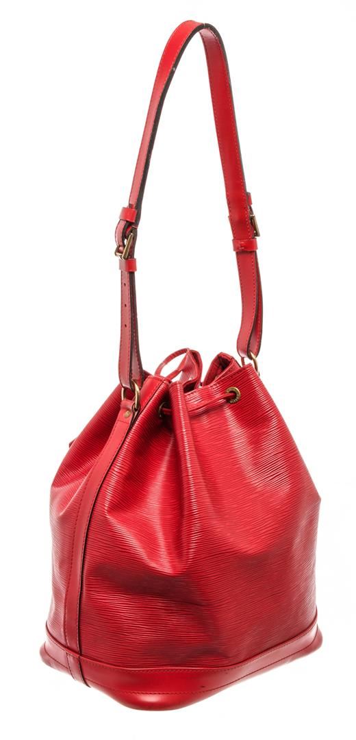 Louis Vuitton Red Epi Leather Noe Bucket Bag. All available information is listed in the description and shown in the photos. Louis Vuitton Red Epi Leather Noe Bucket Bag with red epi leather, printed, gold-tone hardware, single adjustable shoulder strap, alcantara lining, drawstring closure at top. Height: 13.5" Width: 10.5" Depth: 7.25" Shoulder Strap Drop: 8.5" / Height: 34.29 cm Width: 26.67 cm Depth: 18.41 cm Shoulder Strap Drop: 21.59 cm
