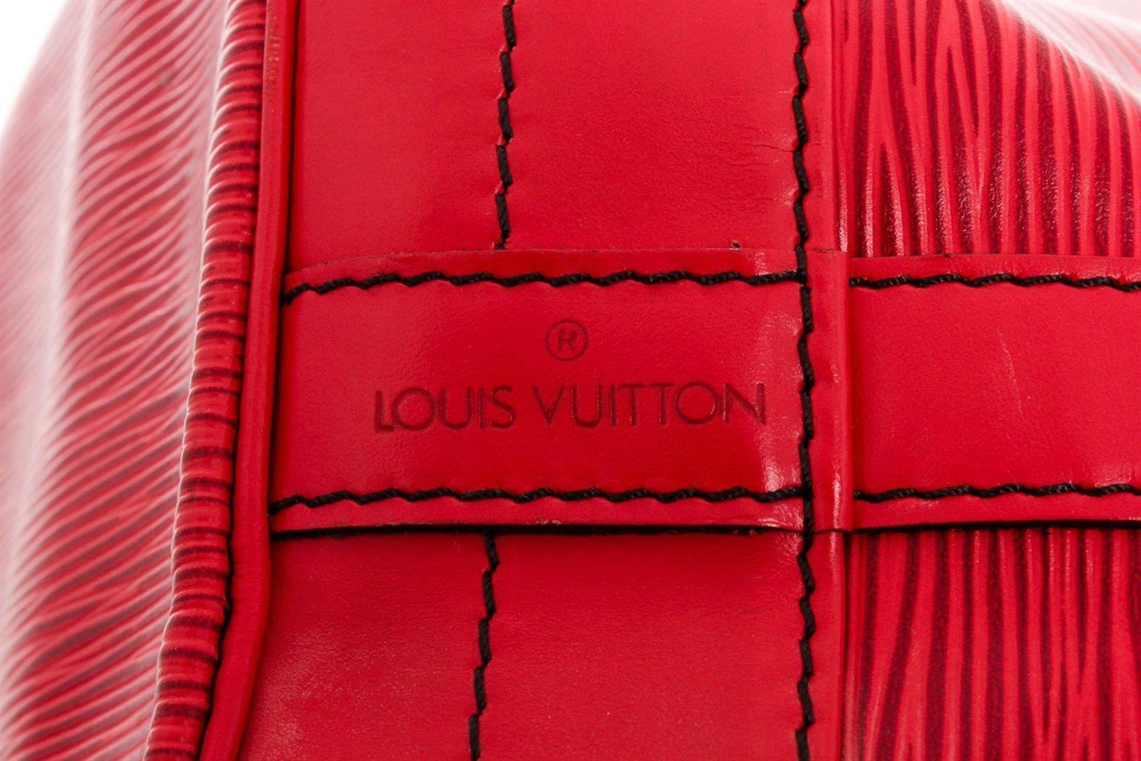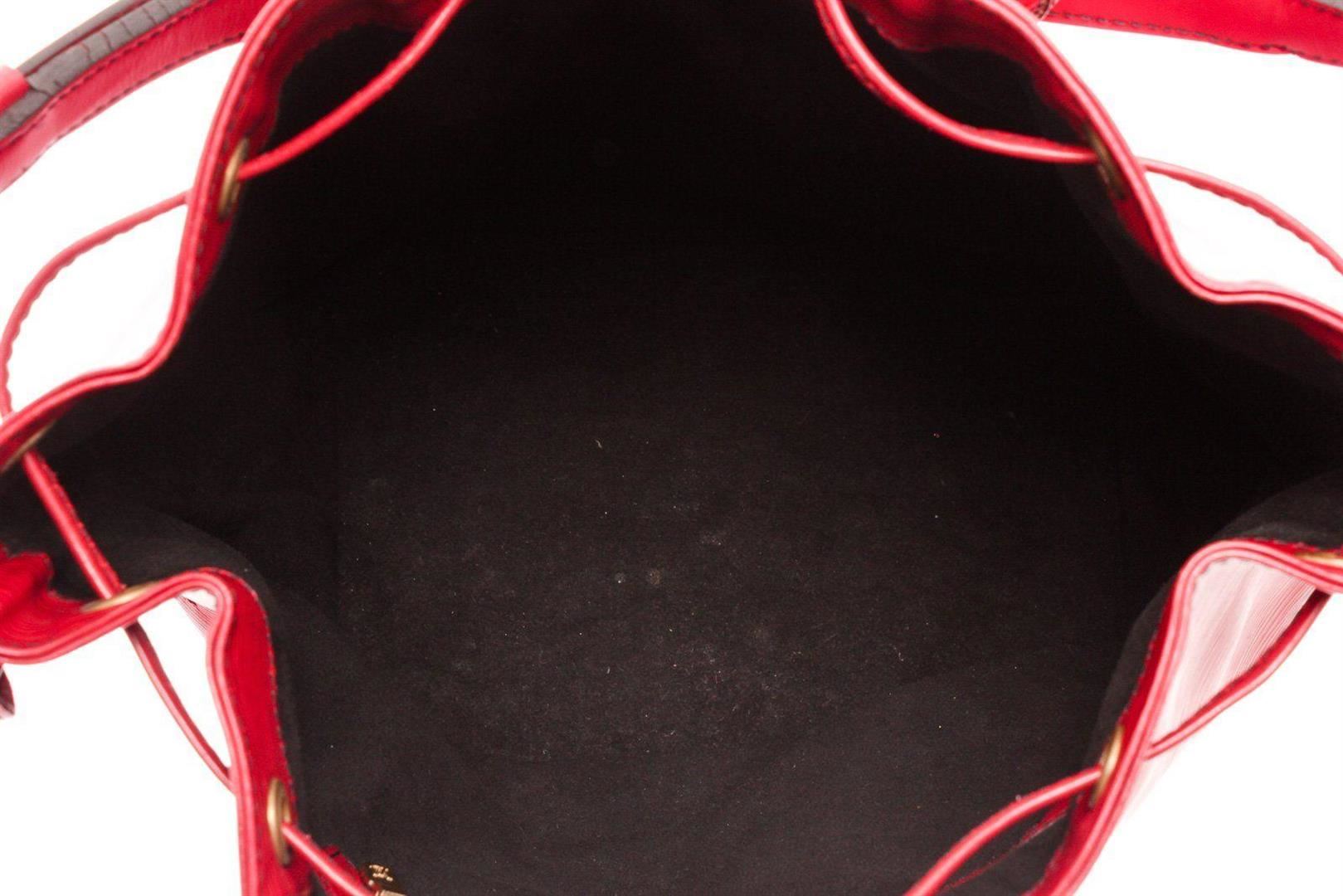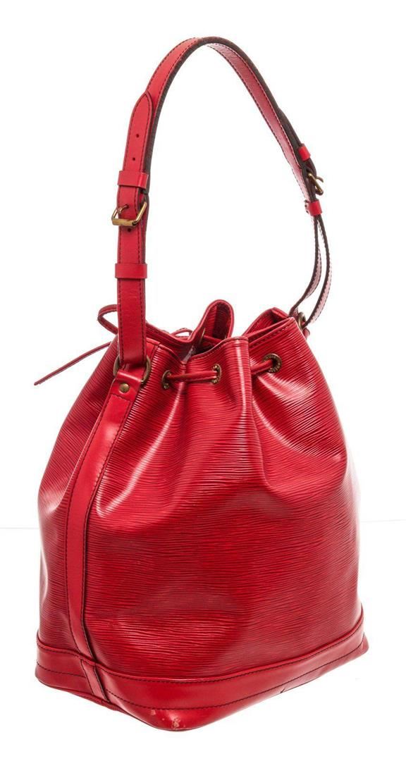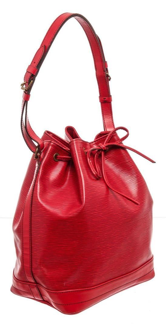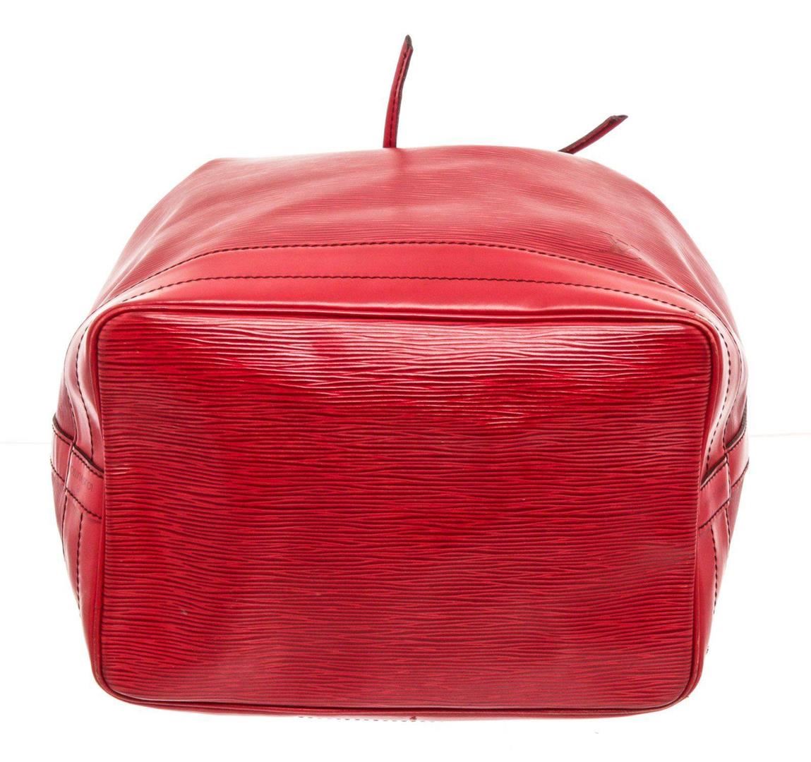 Louis Vuitton Red Epi Leather Noe GM Bucket Bag with material epi leather, gold-tone hardware, trim tan vachetta leather, shoulder adjustable strap and drawstring closure.