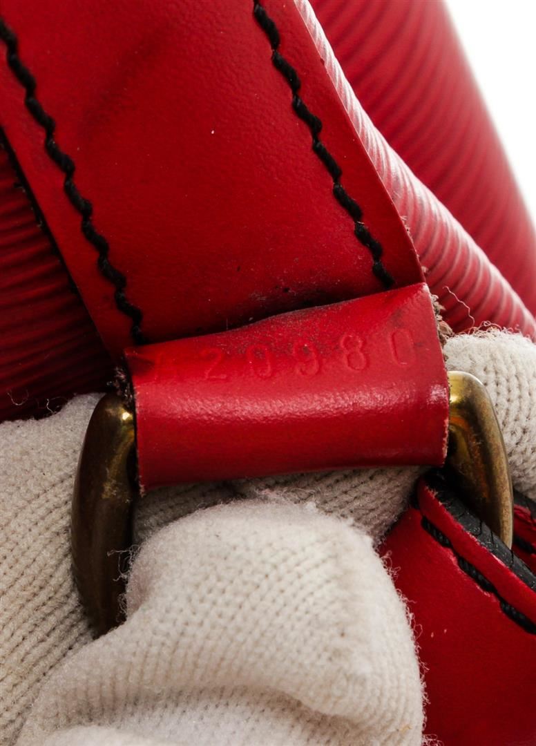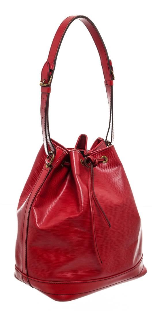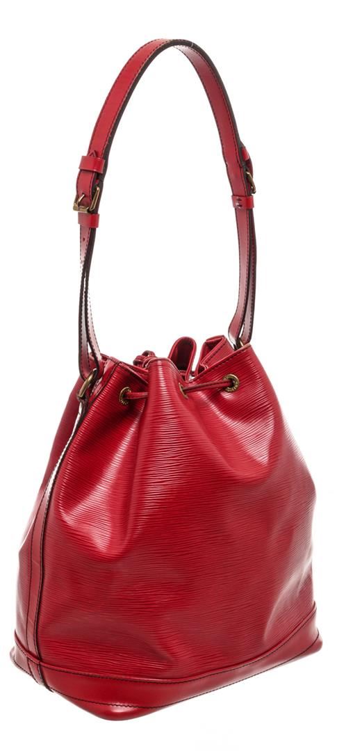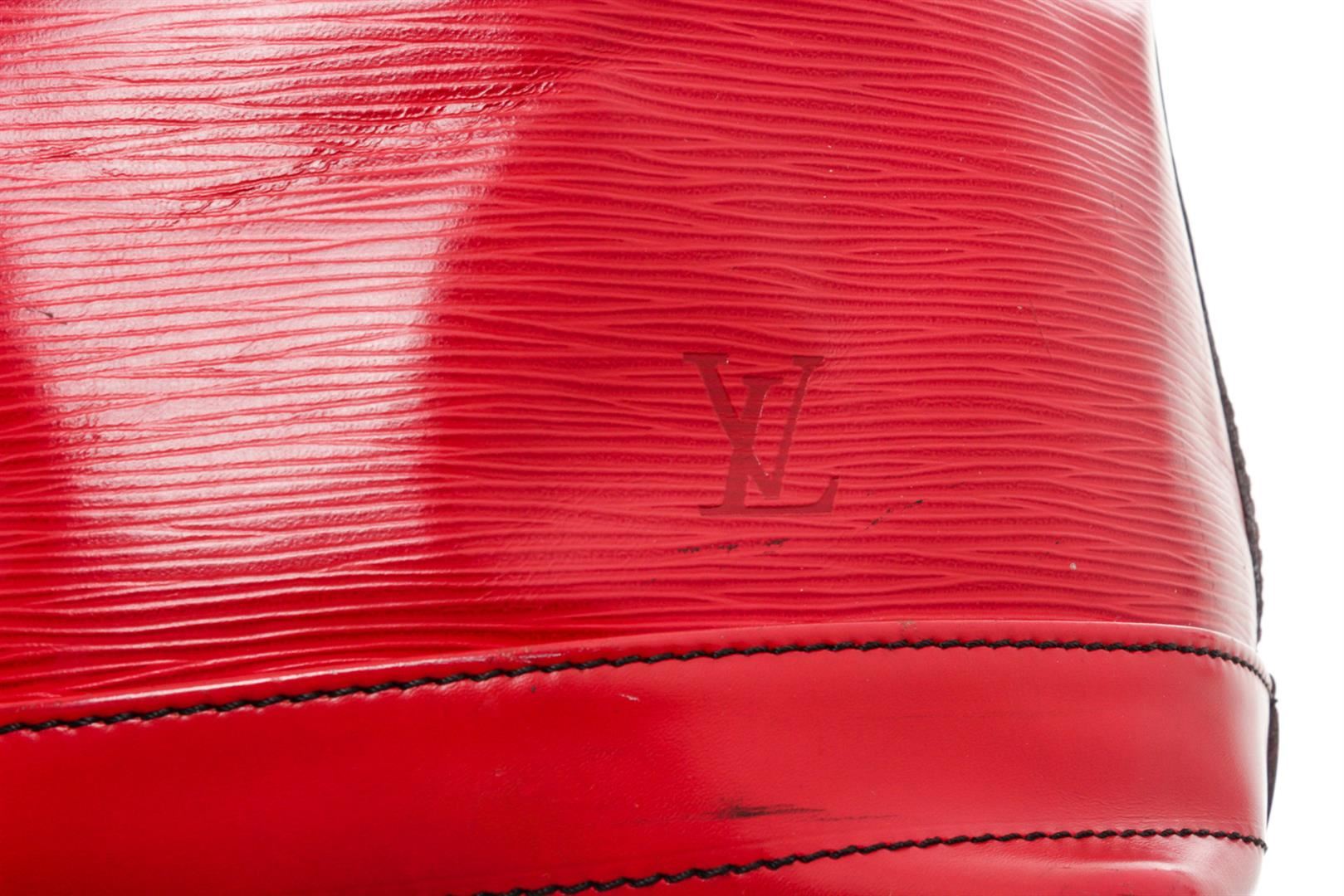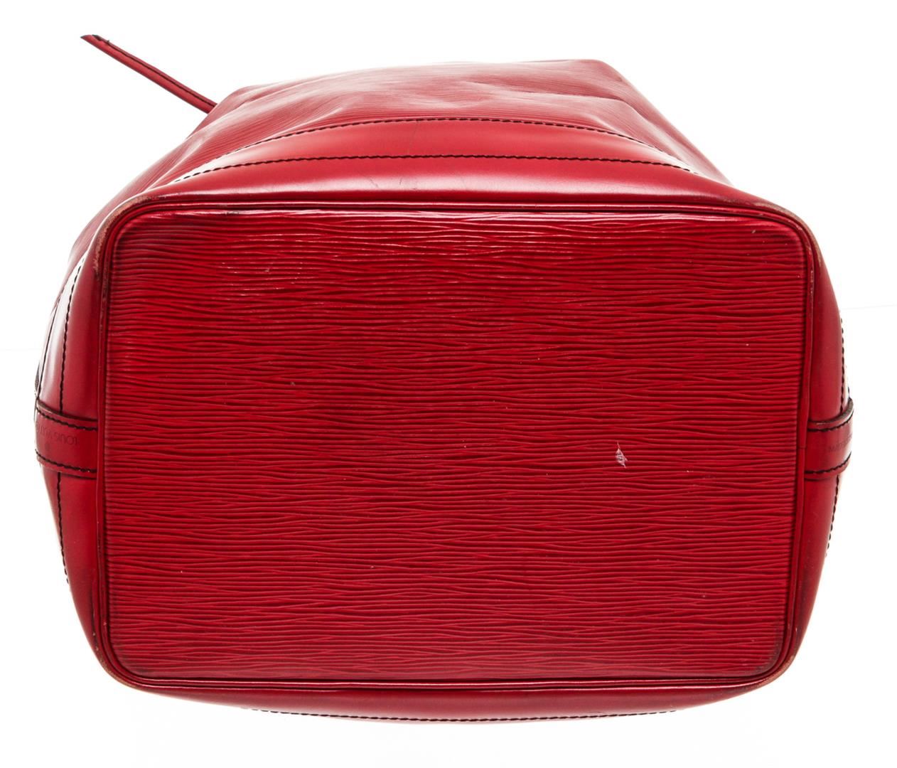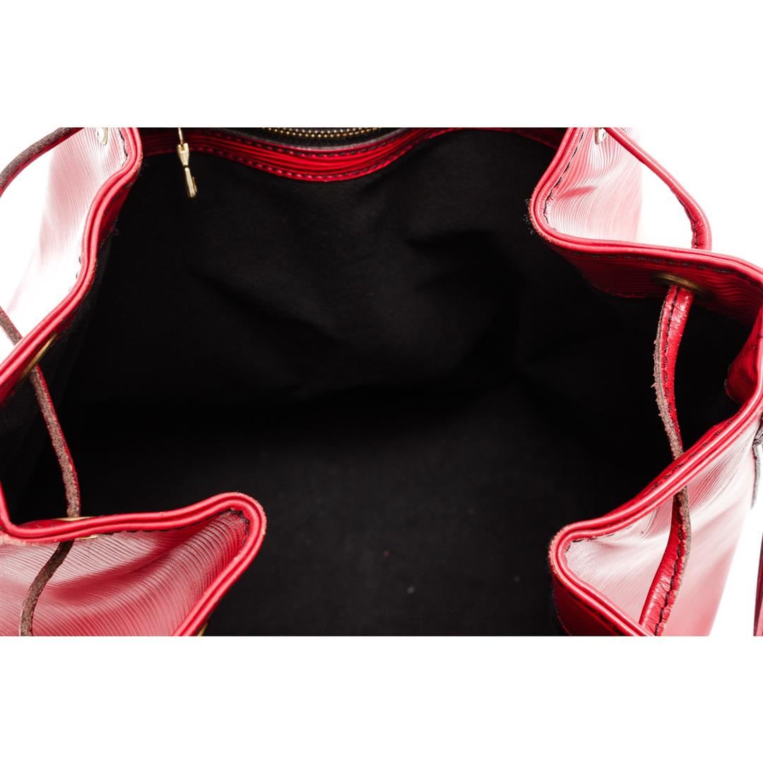 Red Epi leather Louis Vuitton Noe GM with brass hardware, single adjustable shoulder strap, tonal leather trim, embossed logo at exterior side, Alcantara lining and drawstring closure at top. Authentic.
