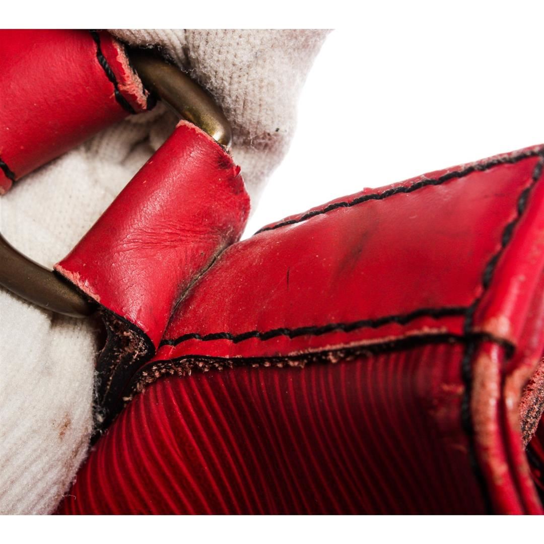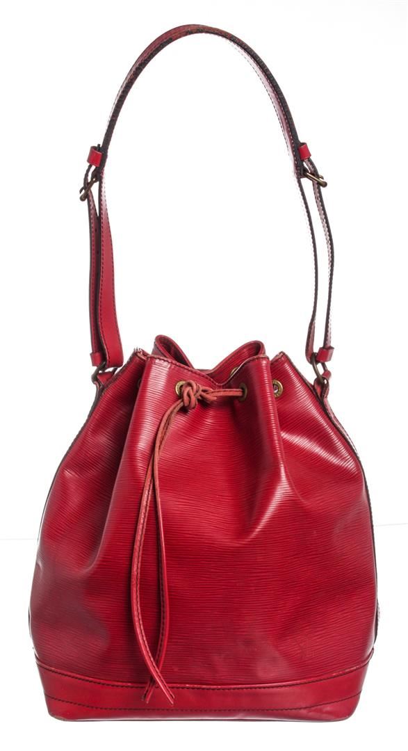 Epi leather Louis Vuitton Noe GM with brass hardware, single adjustable shoulder strap, tonal leather trim, embossed logo at exterior side, Alcantara lining and drawstring closure at top. Authentic.