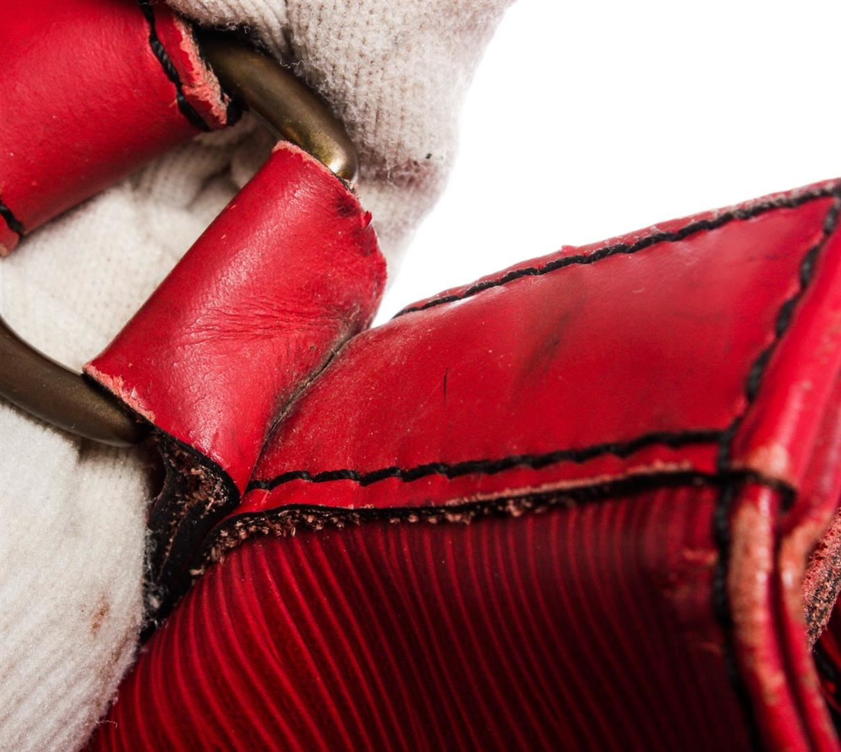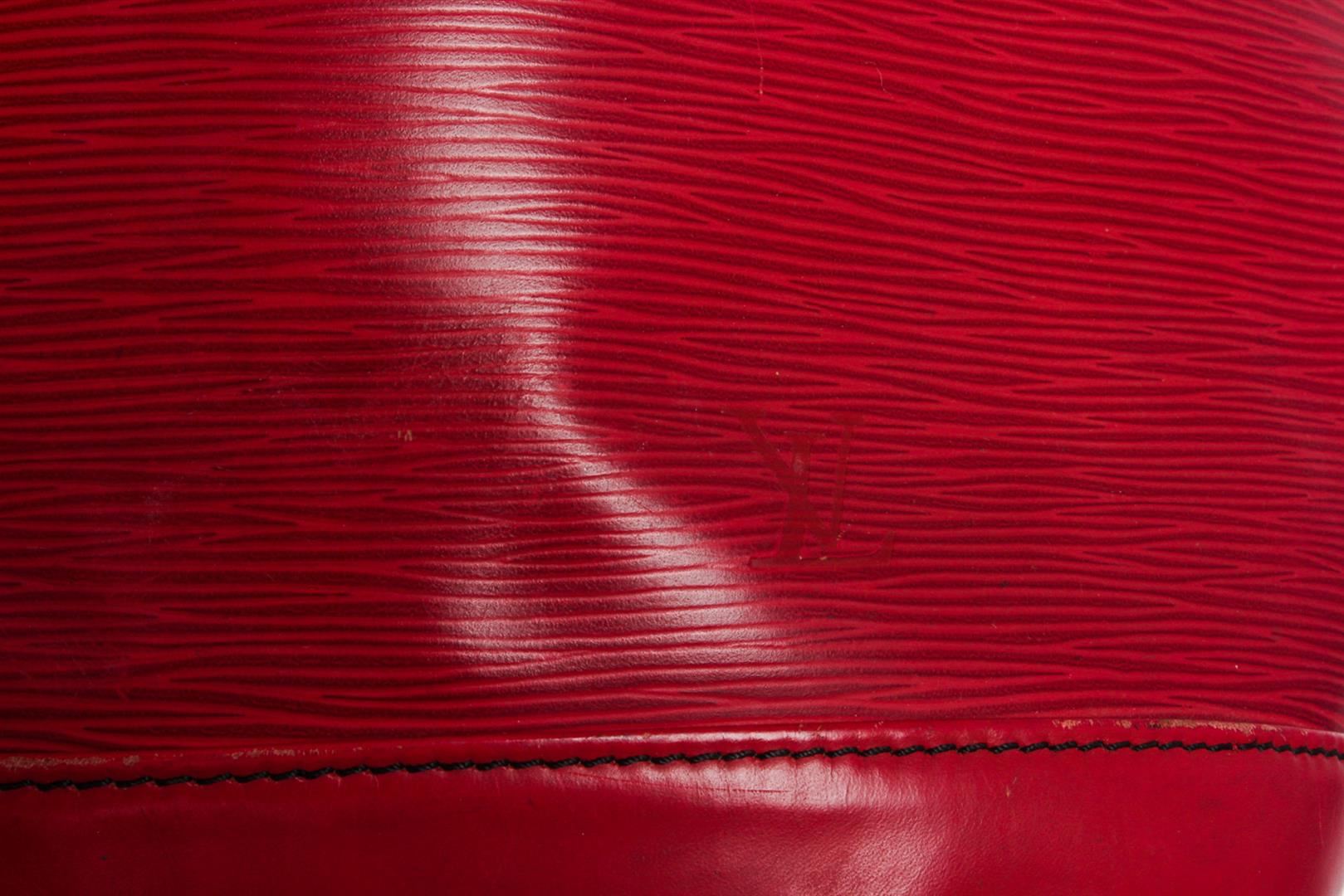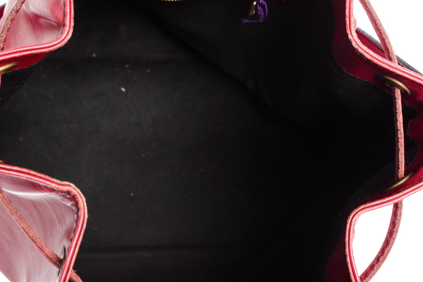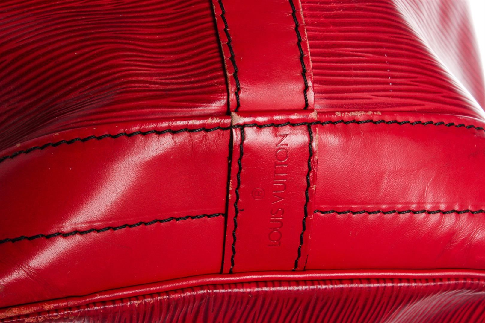 One Louis Vuitton Red Epi Leather Noe GM Drawstring Shoulder Bag. Epi leather Louis Vuitton Noe GM with brass hardware, single adjustable shoulder strap, tonal leather trim, embossed logo at exterior side, Alcantara lining and drawstring closure at top.          CON
