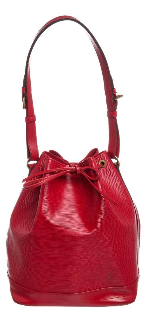 One Louis Vuitton Red Epi Leather Noe GM Drawstring Shoulder Bag. Red Epi leather Louis Vuitton Noe GM with brass hardware, single adjustable shoulder strap, tonal leather trim, embossed logo at exterior side, Alcantara lining and drawstring closure at top. Louis Vuitton Handbags
