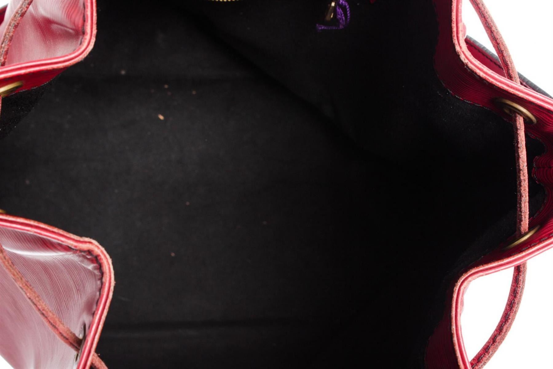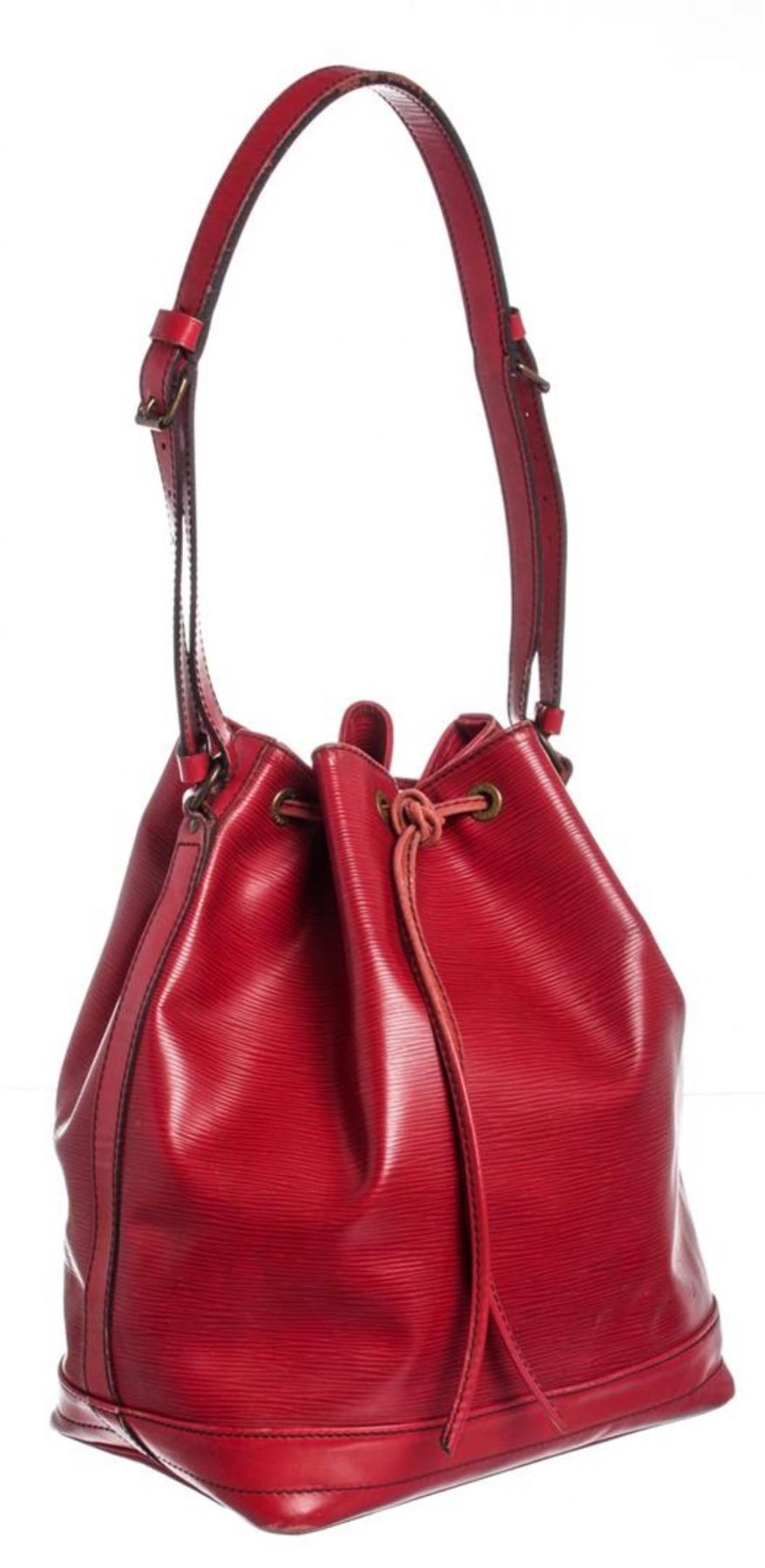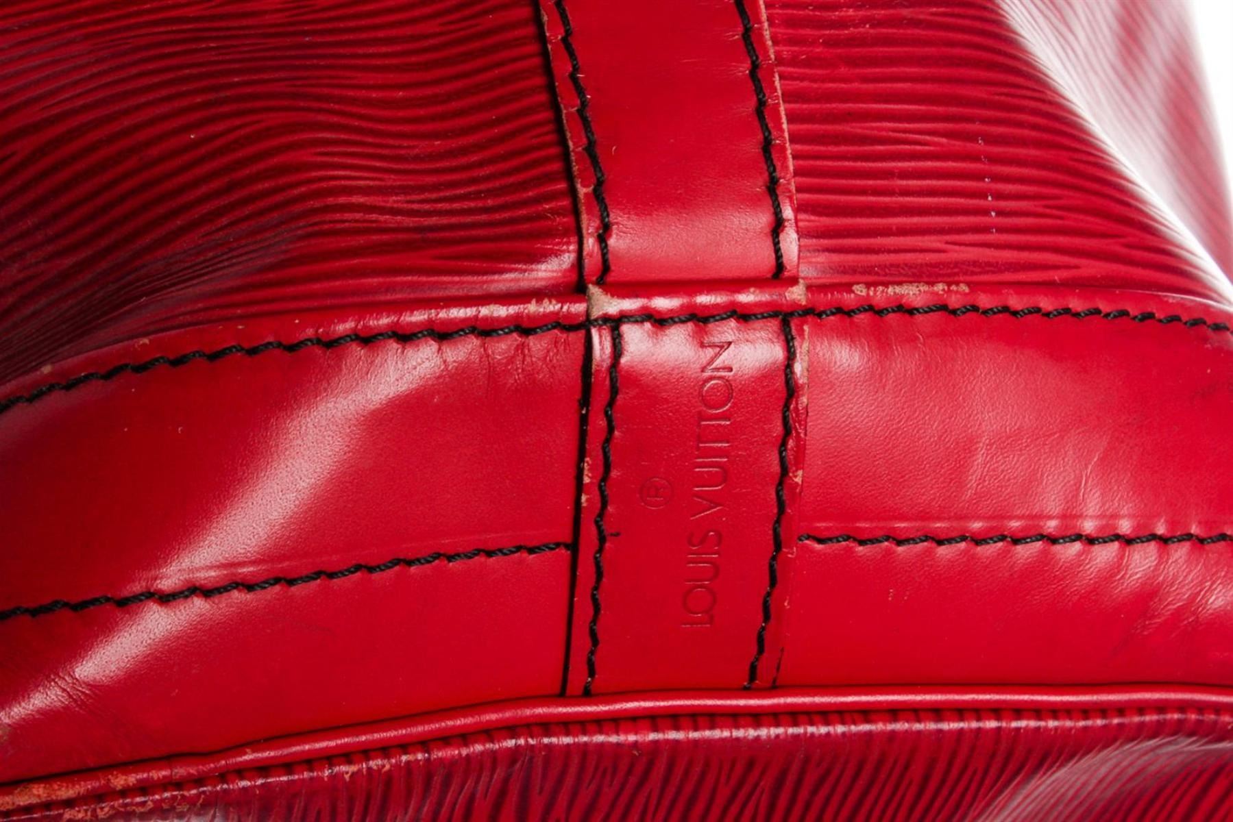 One Louis Vuitton Red Epi Leather Noe GM Drawstring Shoulder Bag. Epi leather Louis Vuitton Noe GM with brass hardware, single adjustable shoulder strap, tonal leather trim, embossed logo at exterior side, Alcantara lining and drawstring closure at top. CON