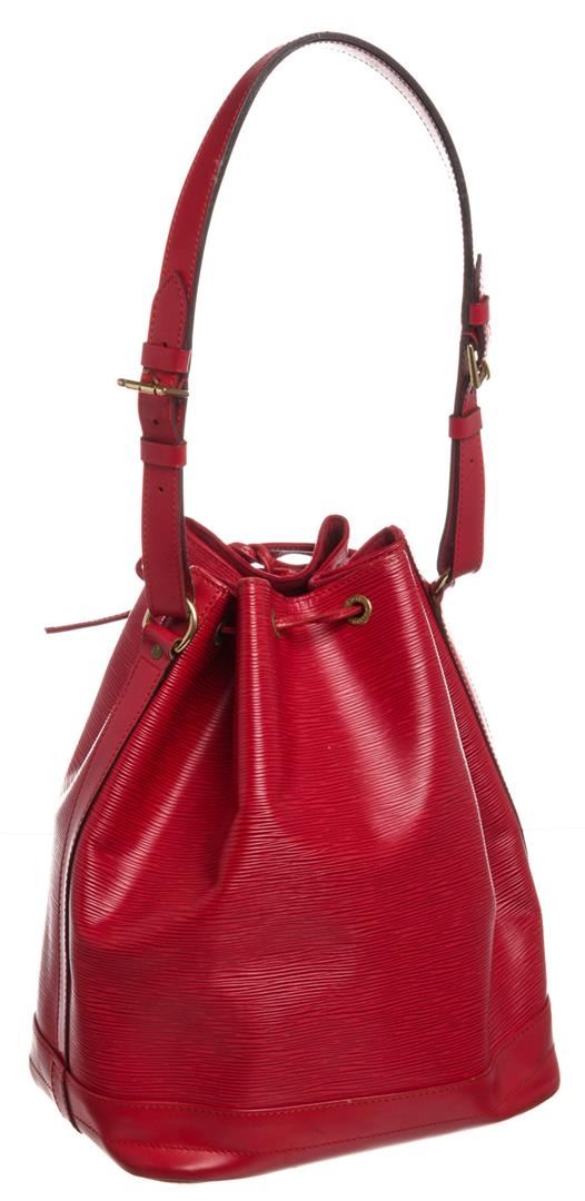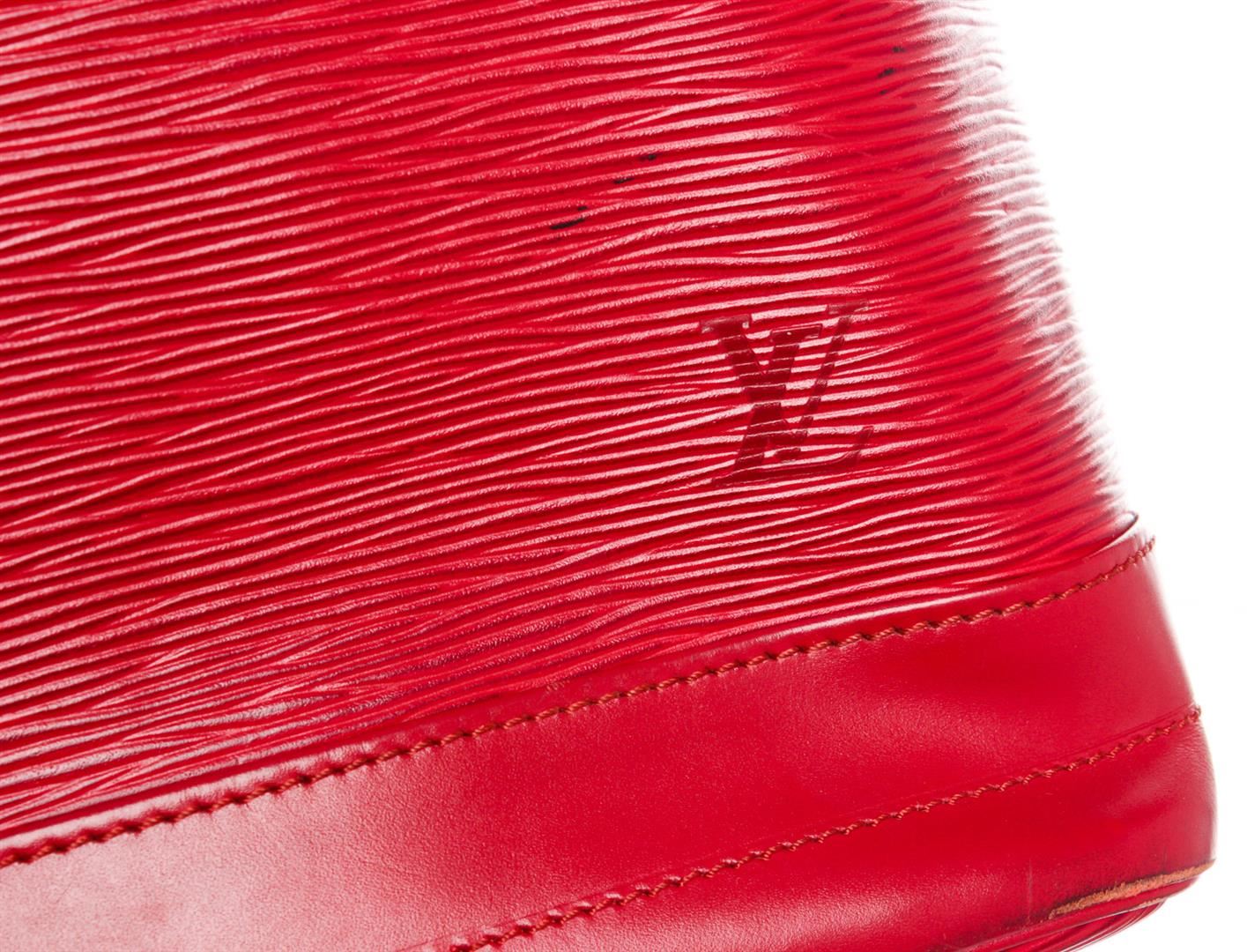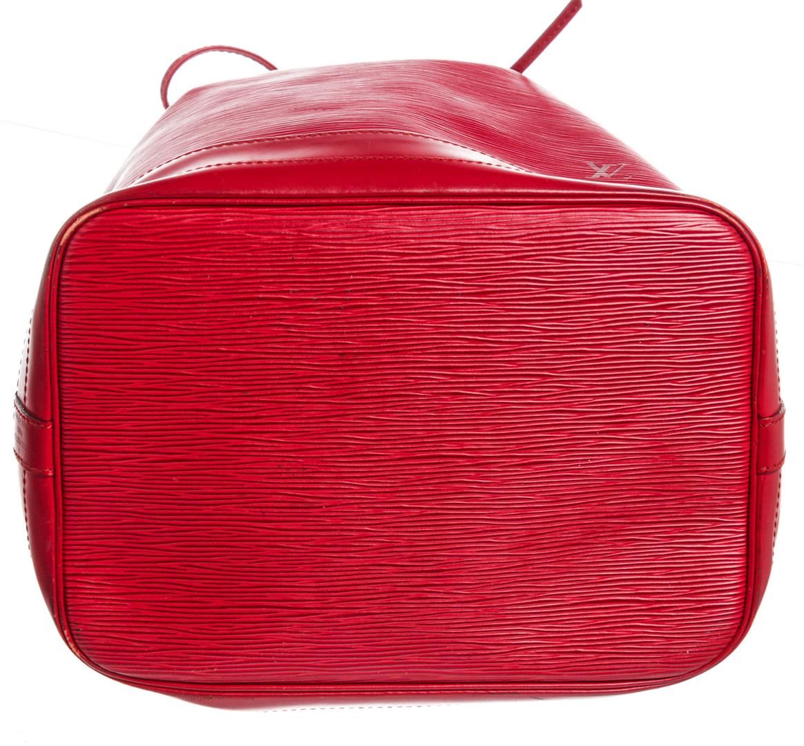 Red Epi leather Louis Vuitton Noe GM with brass hardware, single adjustable shoulder strap, tonal leather trim, embossed logo at exterior side, Alcantara lining and drawstring closure at top.