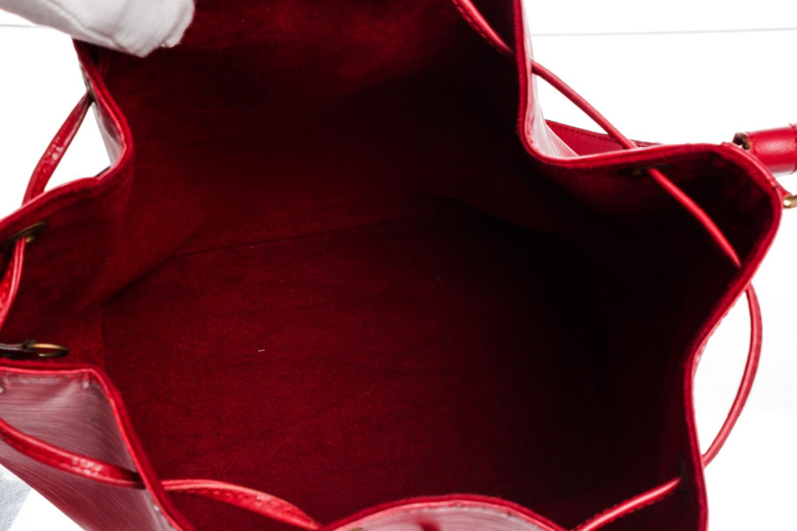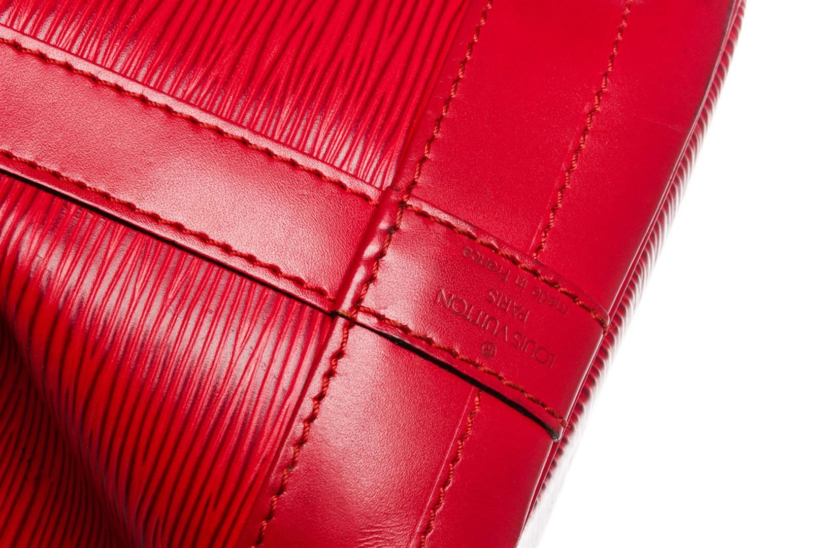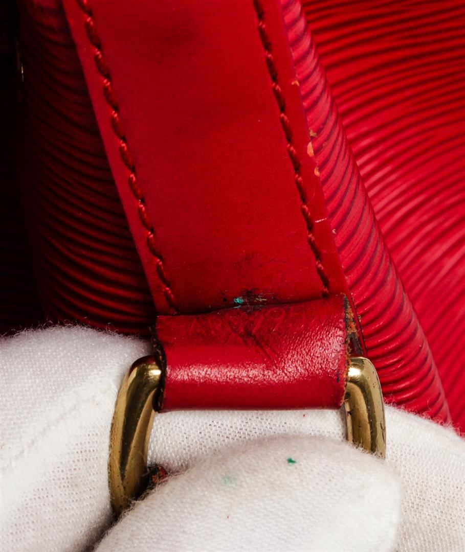 Red Epi leather Louis Vuitton Noe GM with brass hardware, single adjustable shoulder strap, tonal leather trim, embossed logo at exterior side, Alcantara lining and drawstring closure at top.