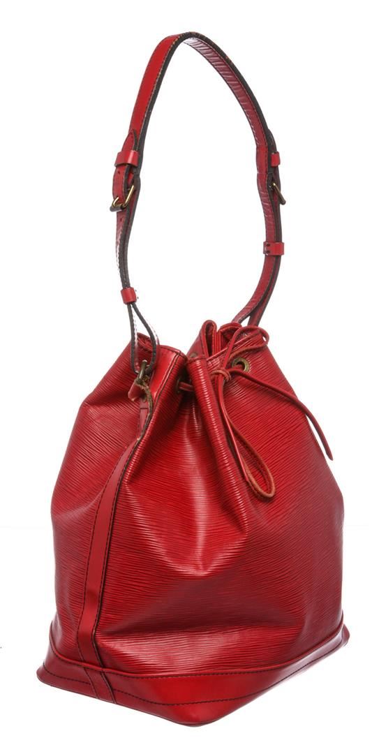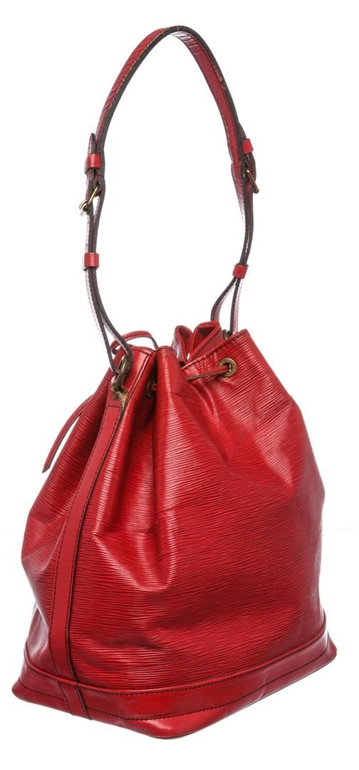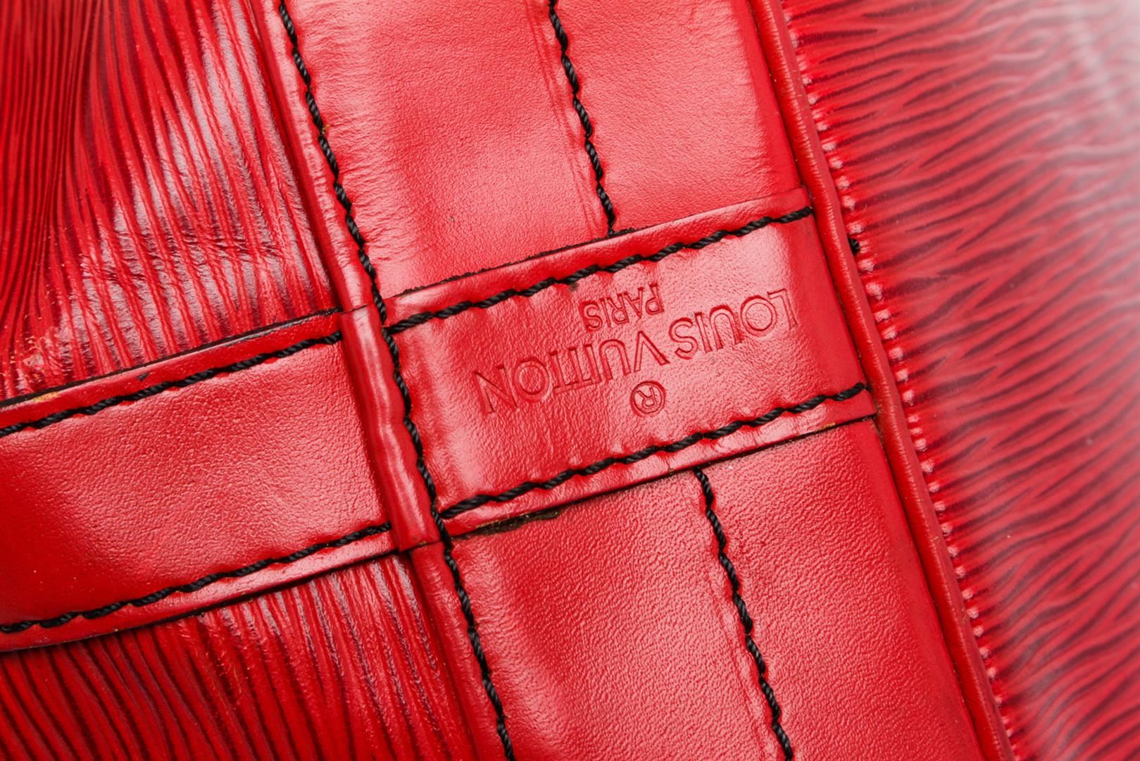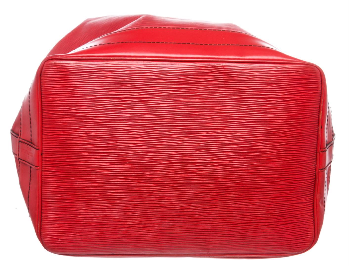 Epi leather Louis Vuitton Noe GM with brass hardware, single adjustable shoulder strap, tonal leather trim, embossed logo at exterior side, Alcantara lining and drawstring closure at top.