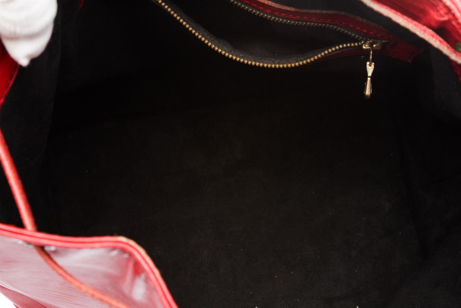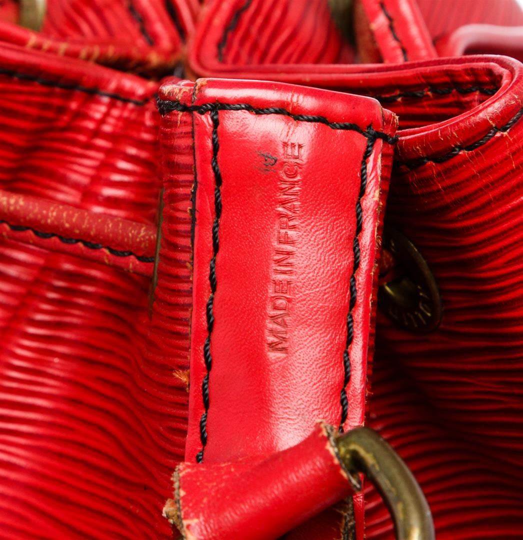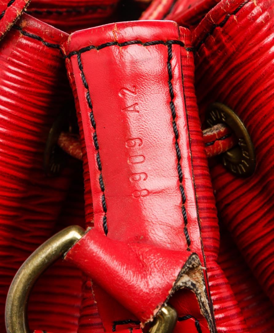 Epi leather Louis Vuitton Noe GM with brass hardware, single adjustable shoulder strap, tonal leather trim, embossed logo at exterior side, Alcantara lining and drawstring closure at top.